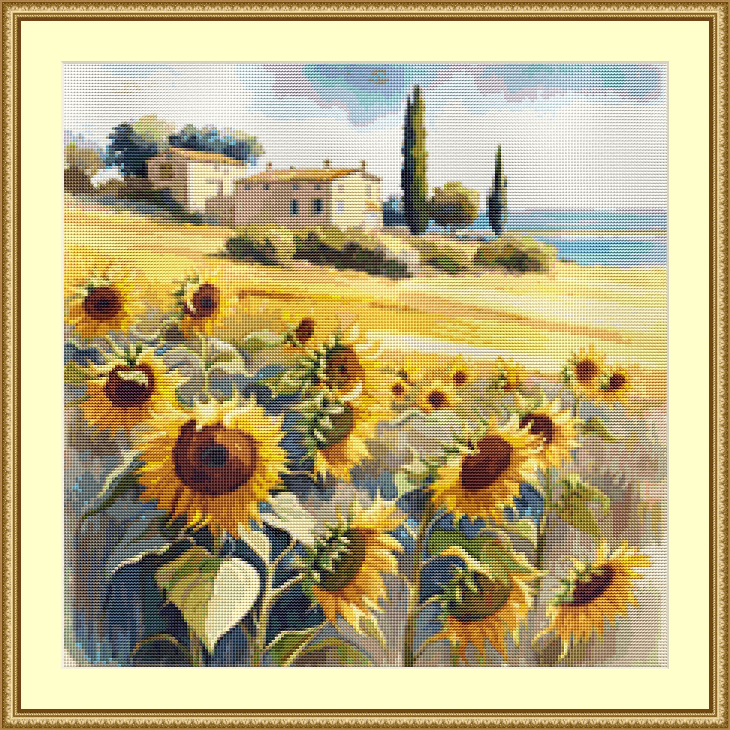 This cross stitch pattern depicts a picture of a field of sunflowers in a field near a farmhouse.