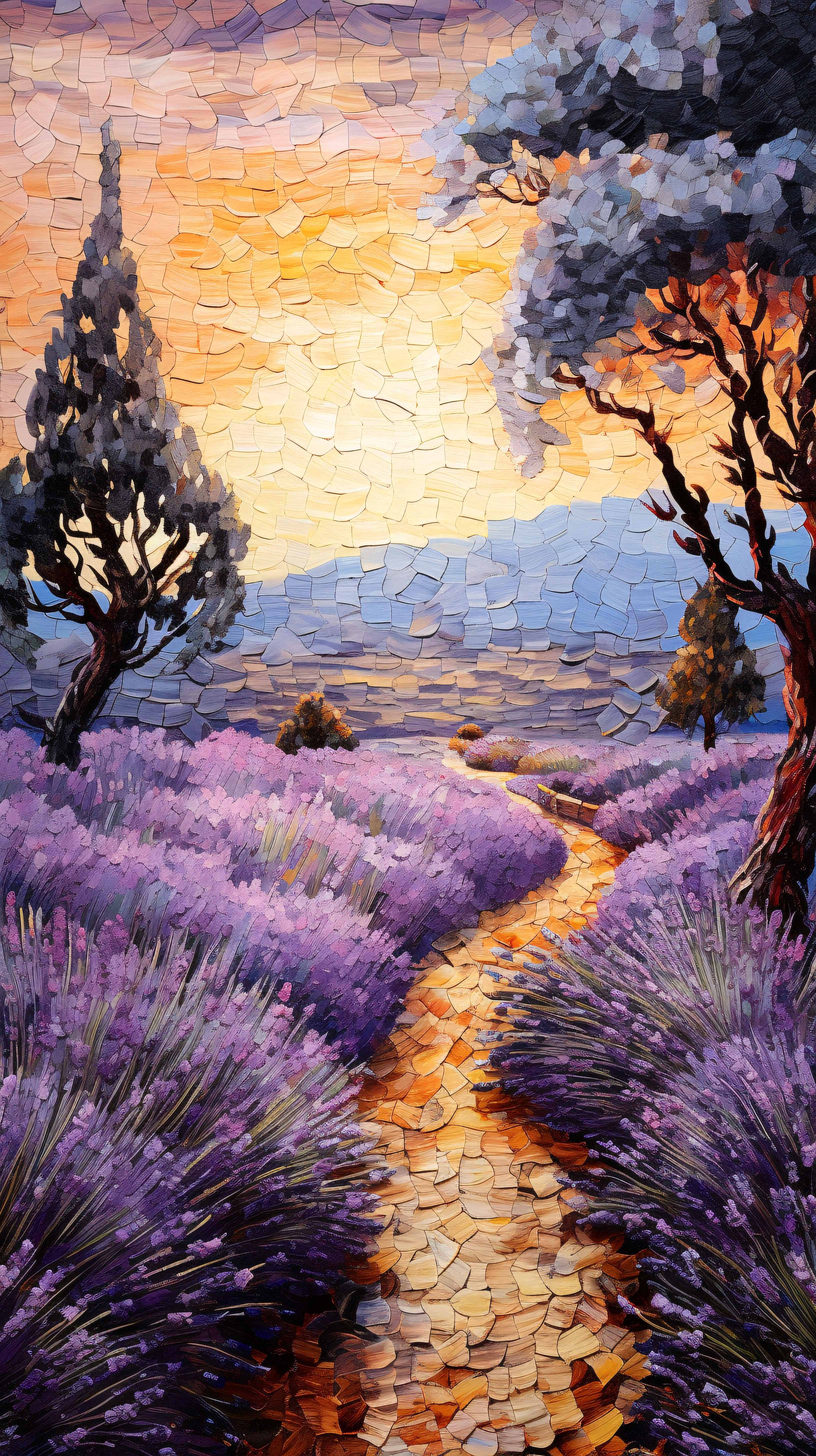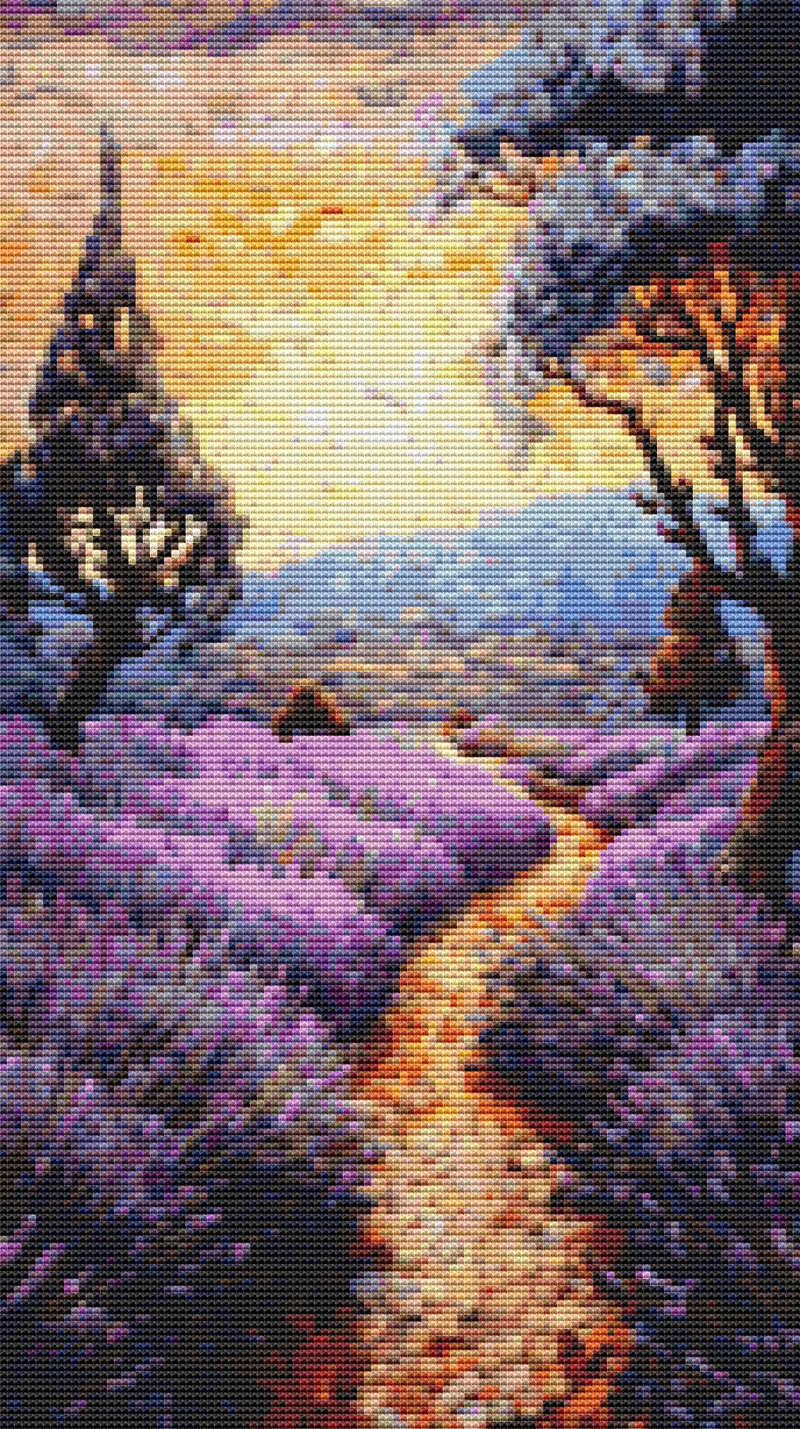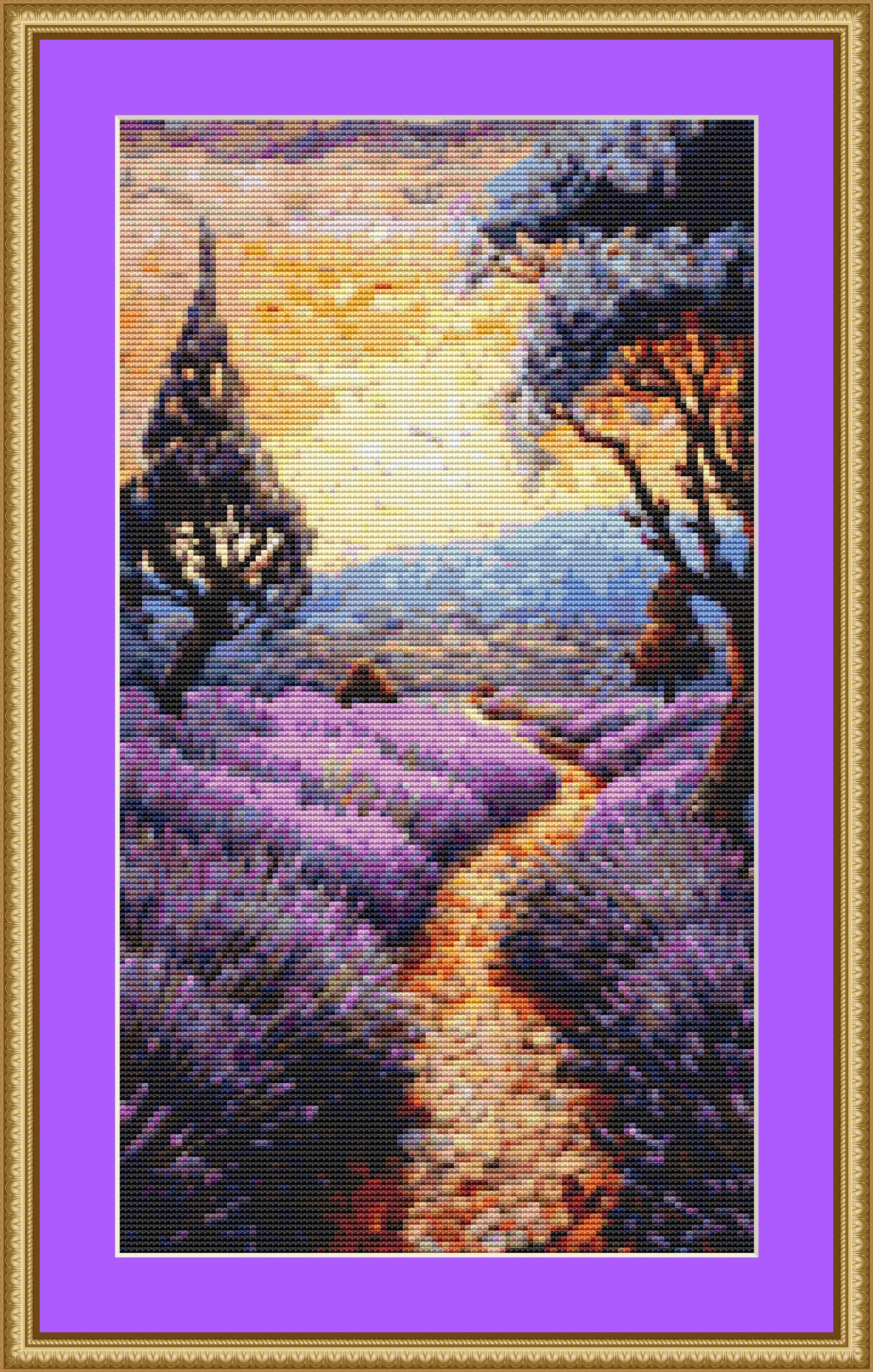 This cross stitch pattern depicts a picture of a path through lavender fields.