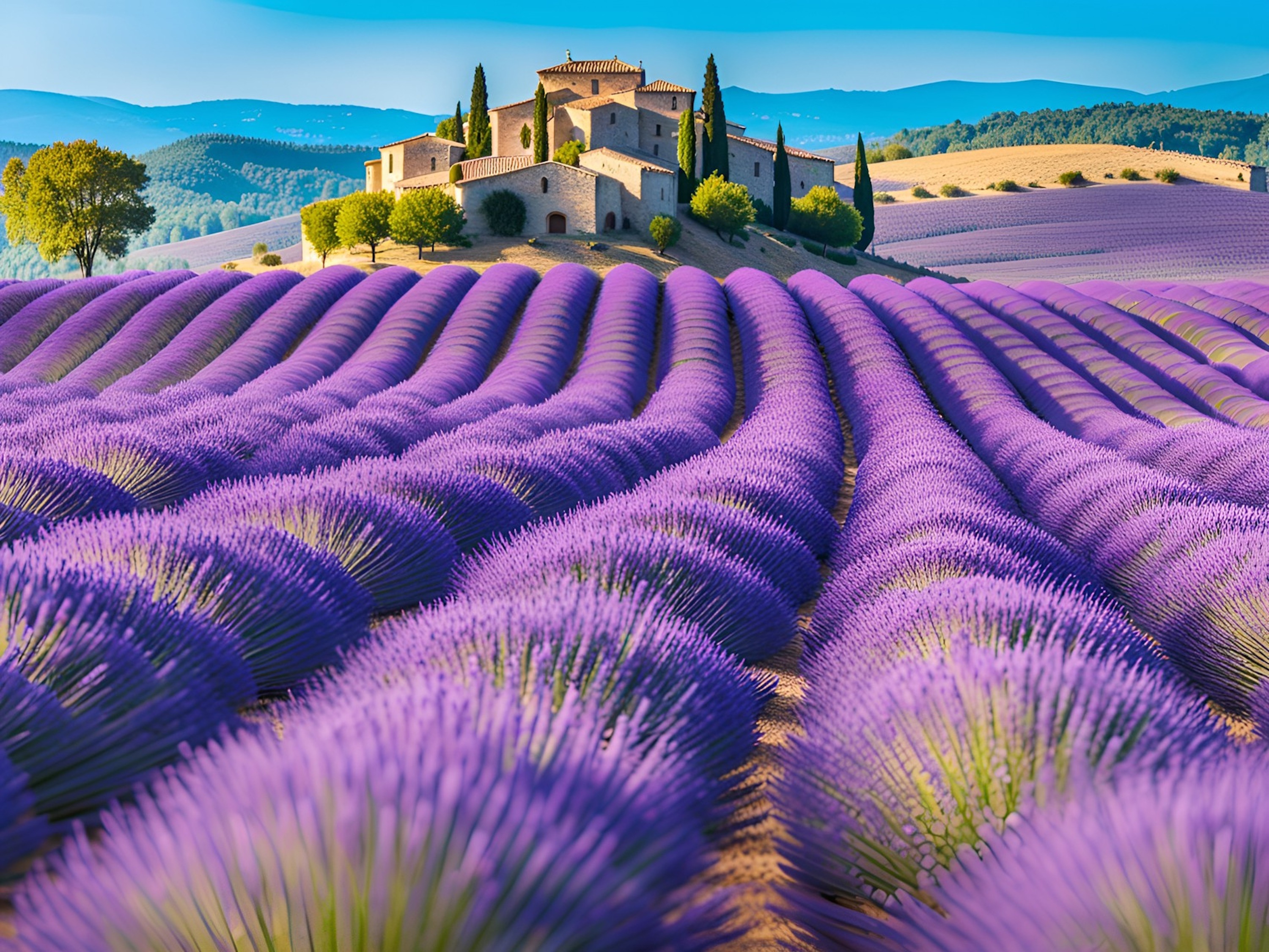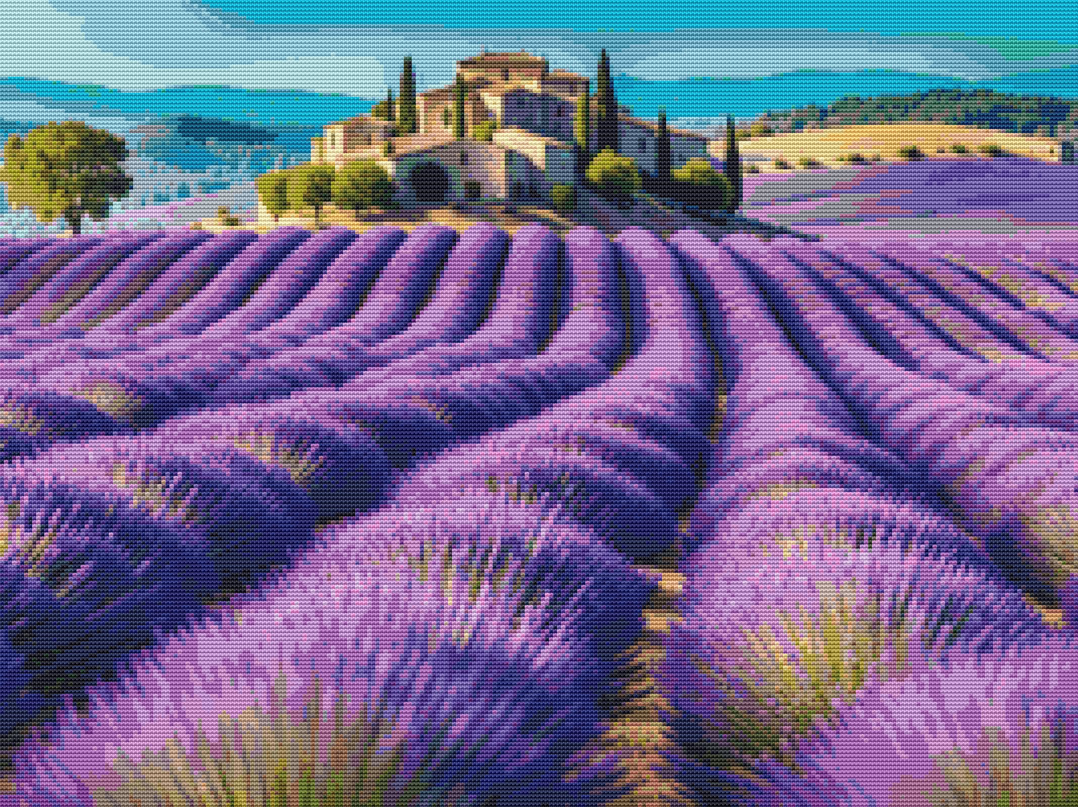 This cross stitch pattern depicts a picture of a stunning landscape of lavender around a small hamlet.