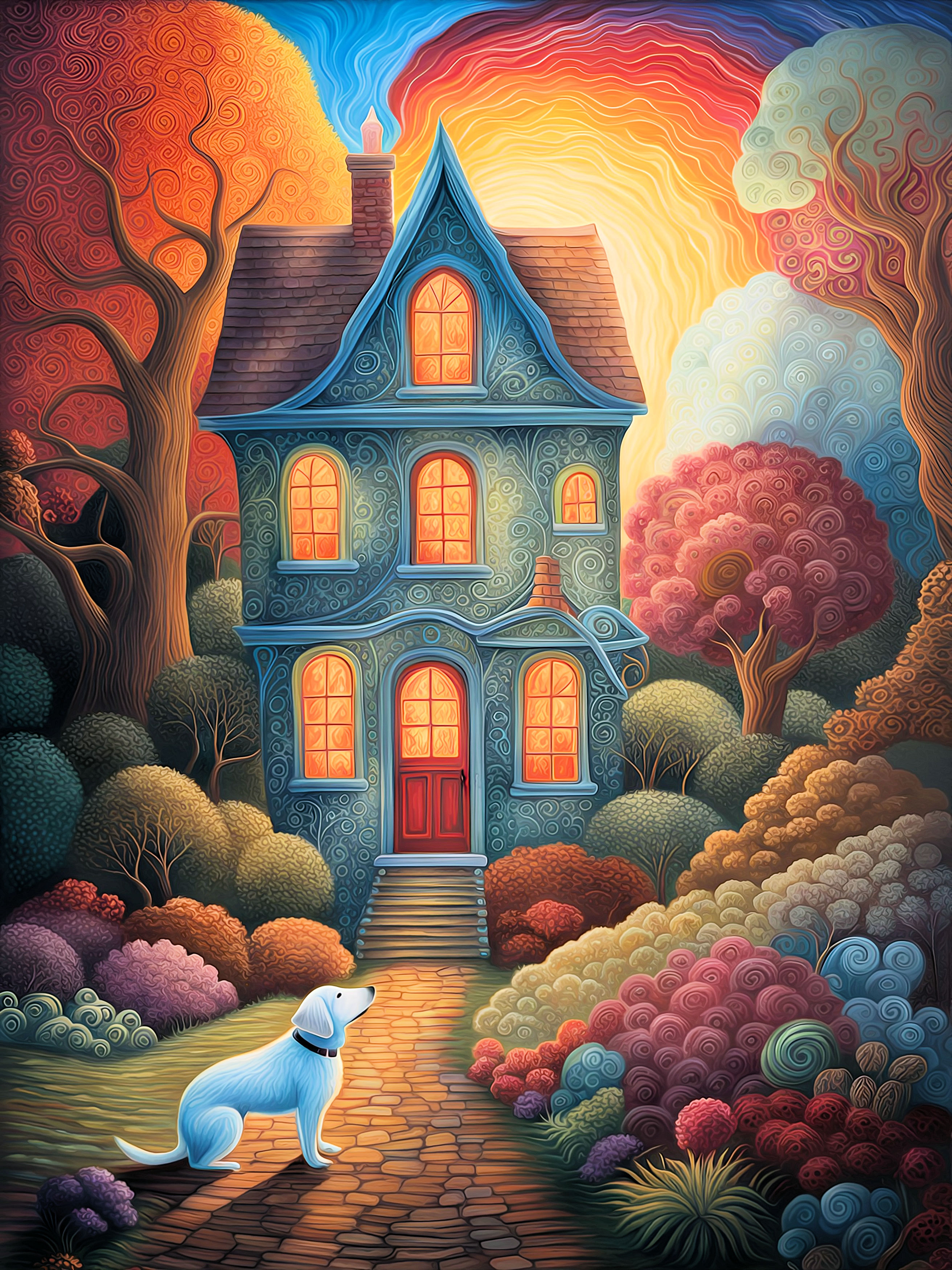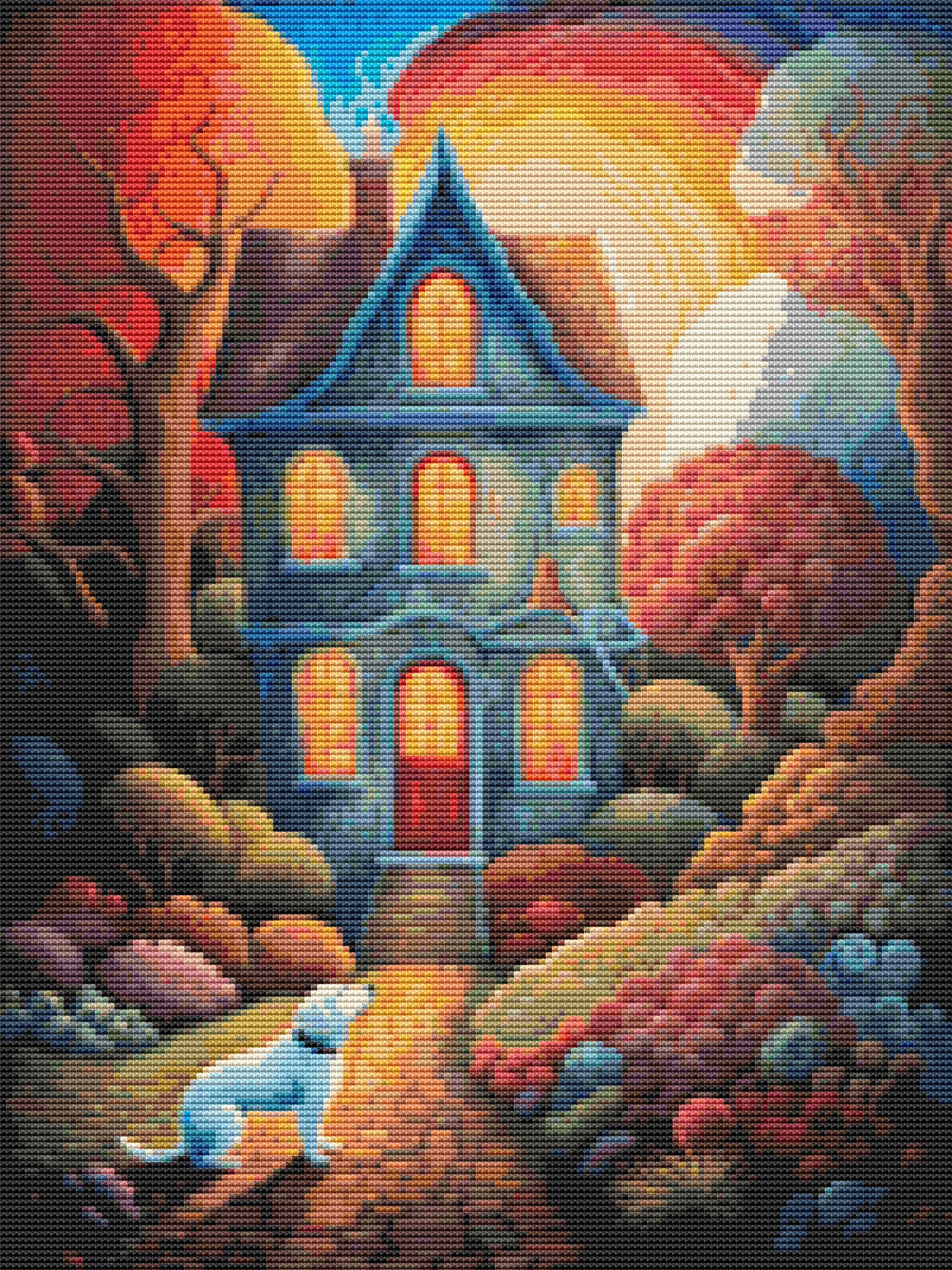 This cross stitch pattern depicts a picture of a dog outside of a house.