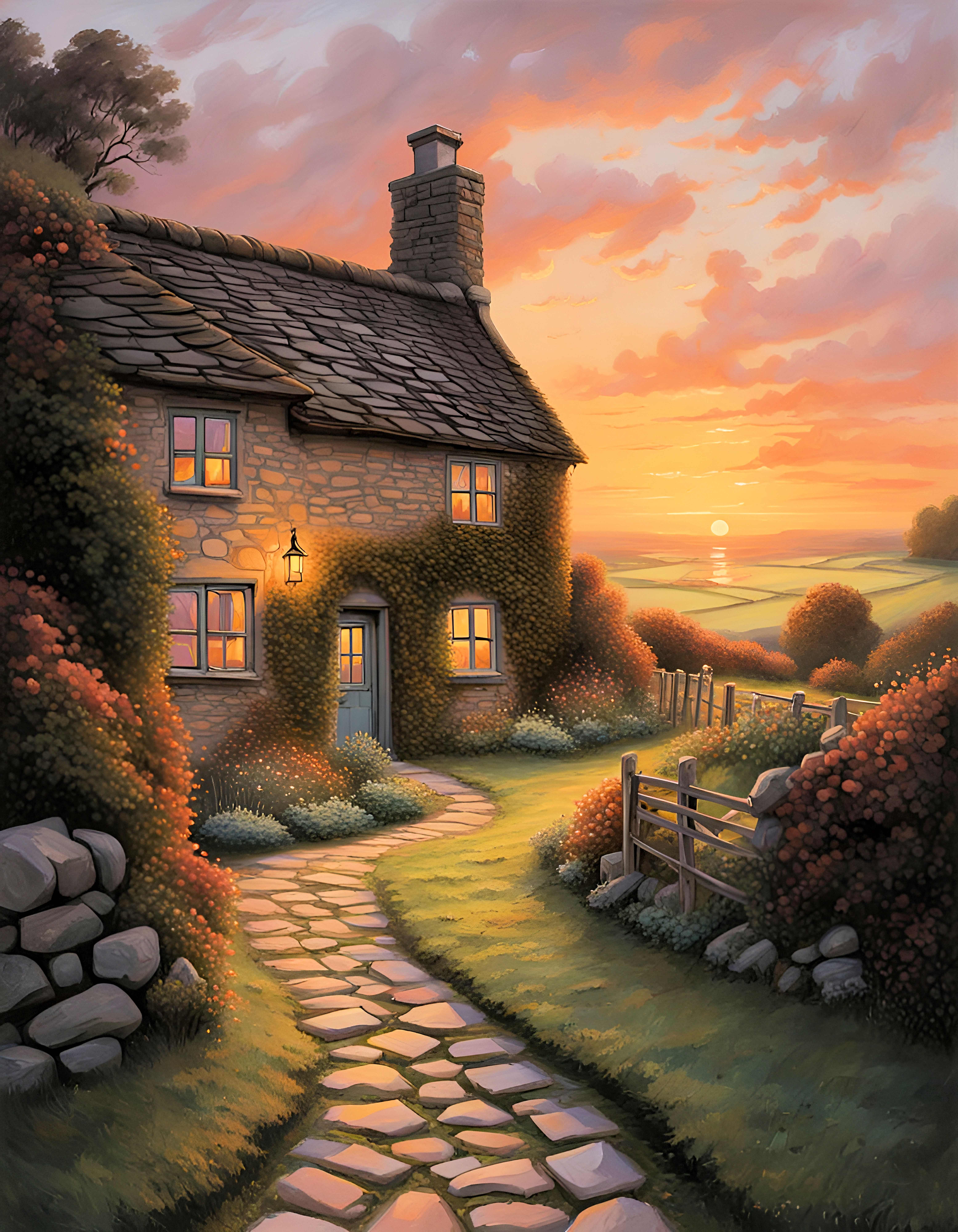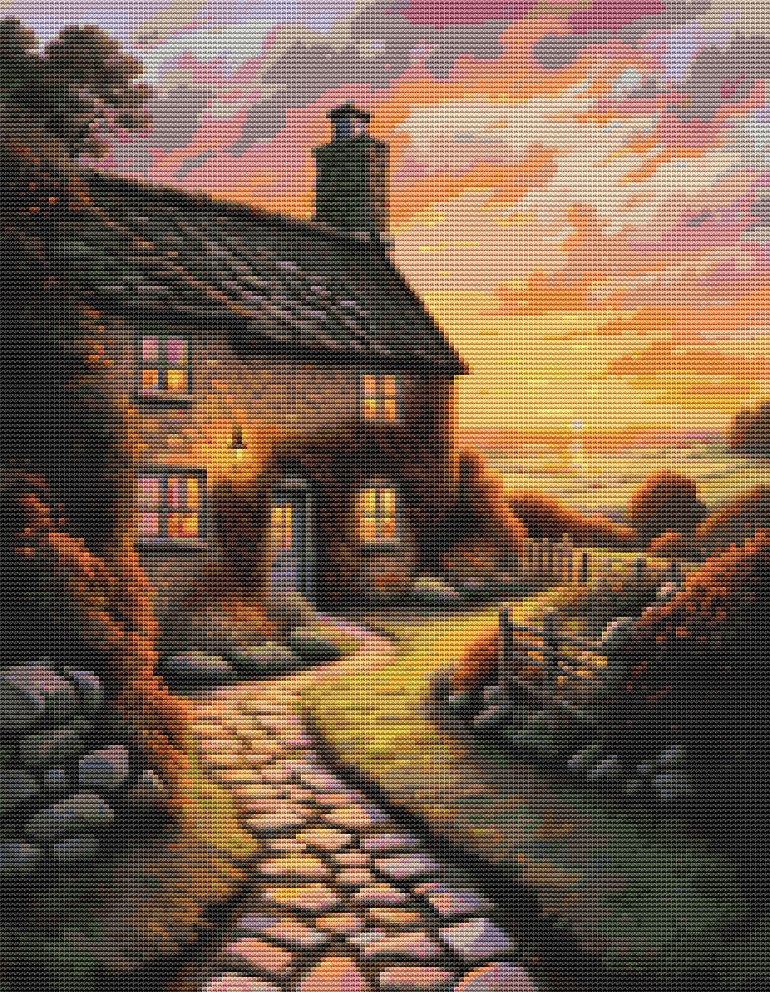 This cross stitch pattern depicts a picture of a stone cottage in the evening.