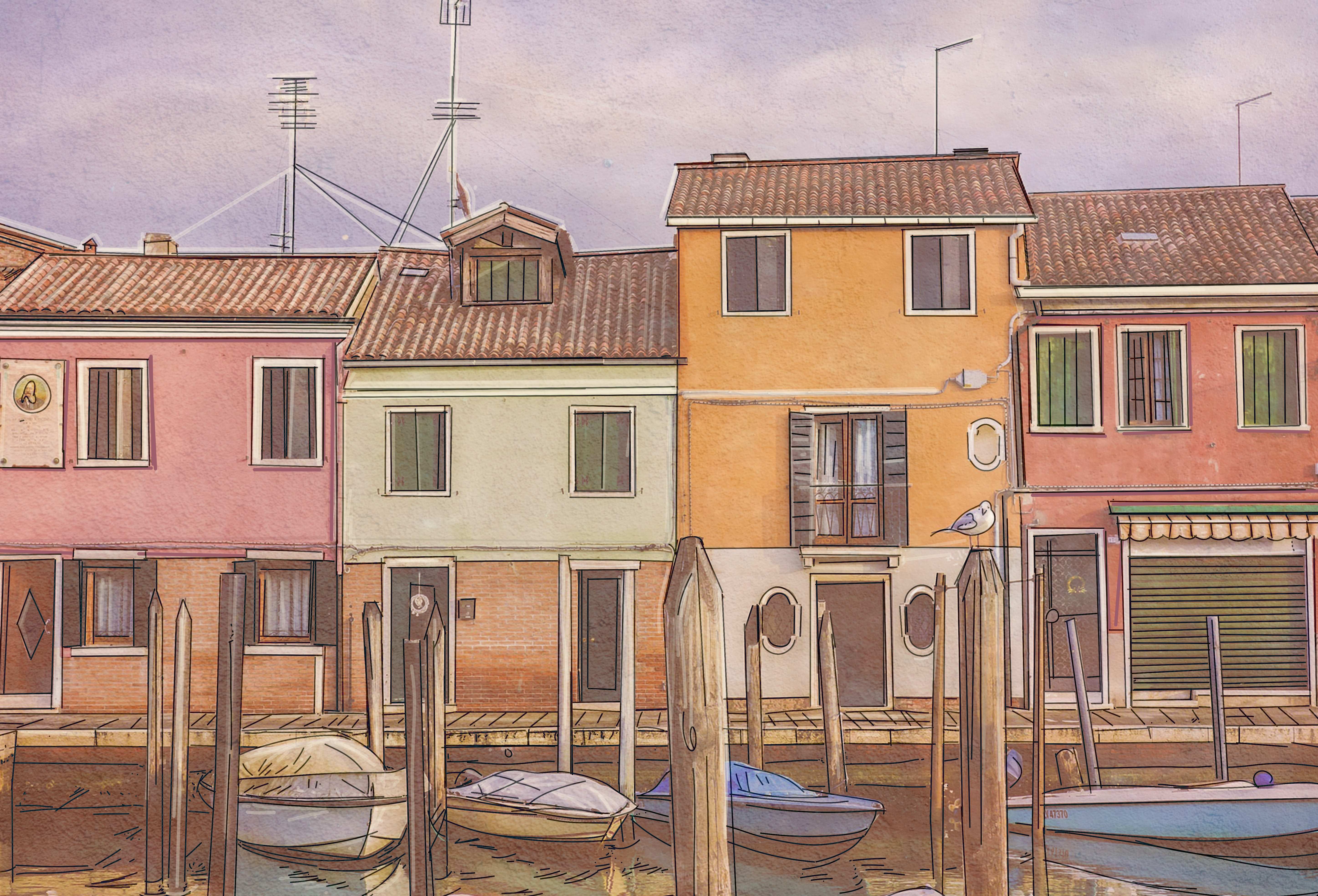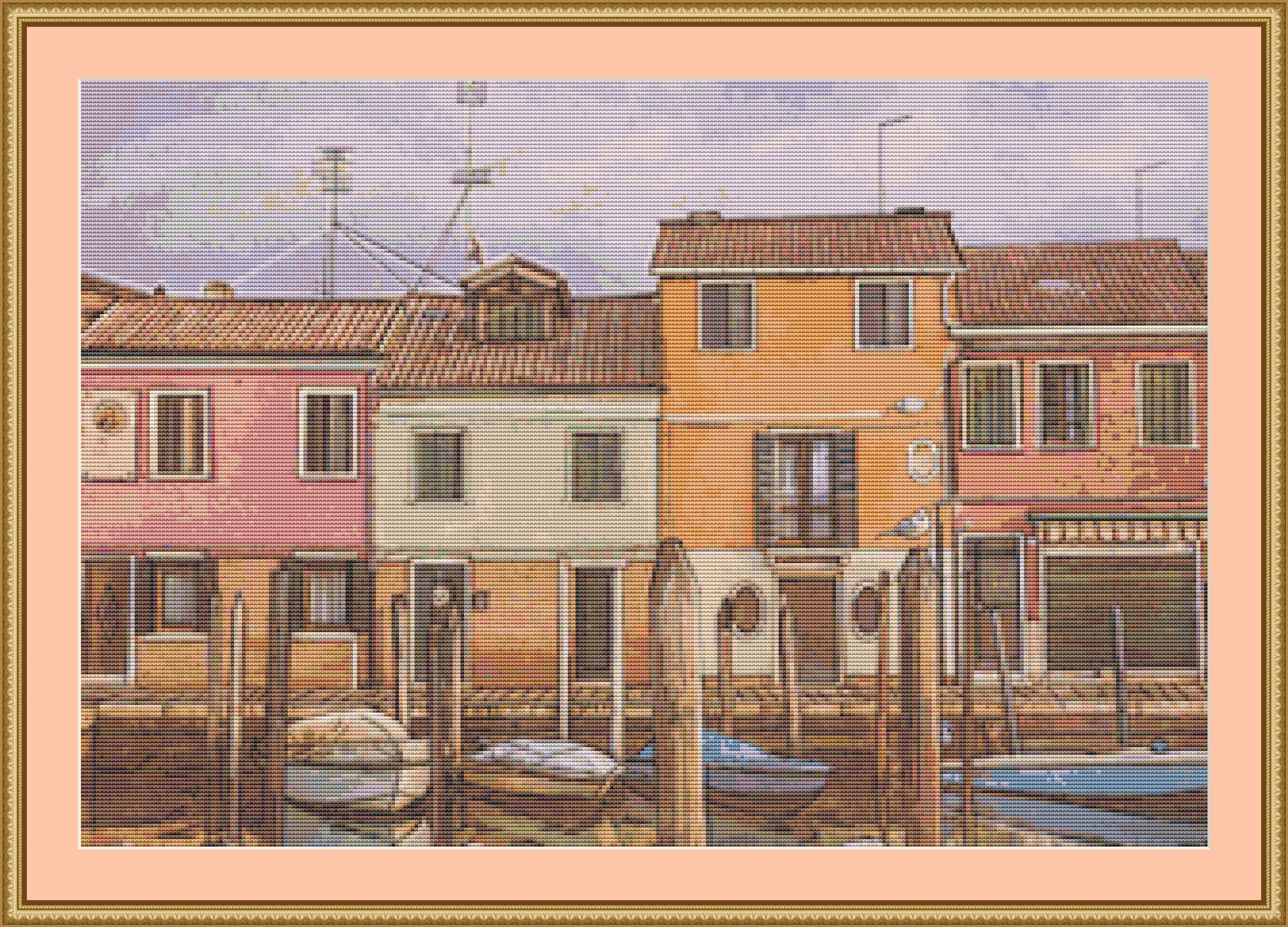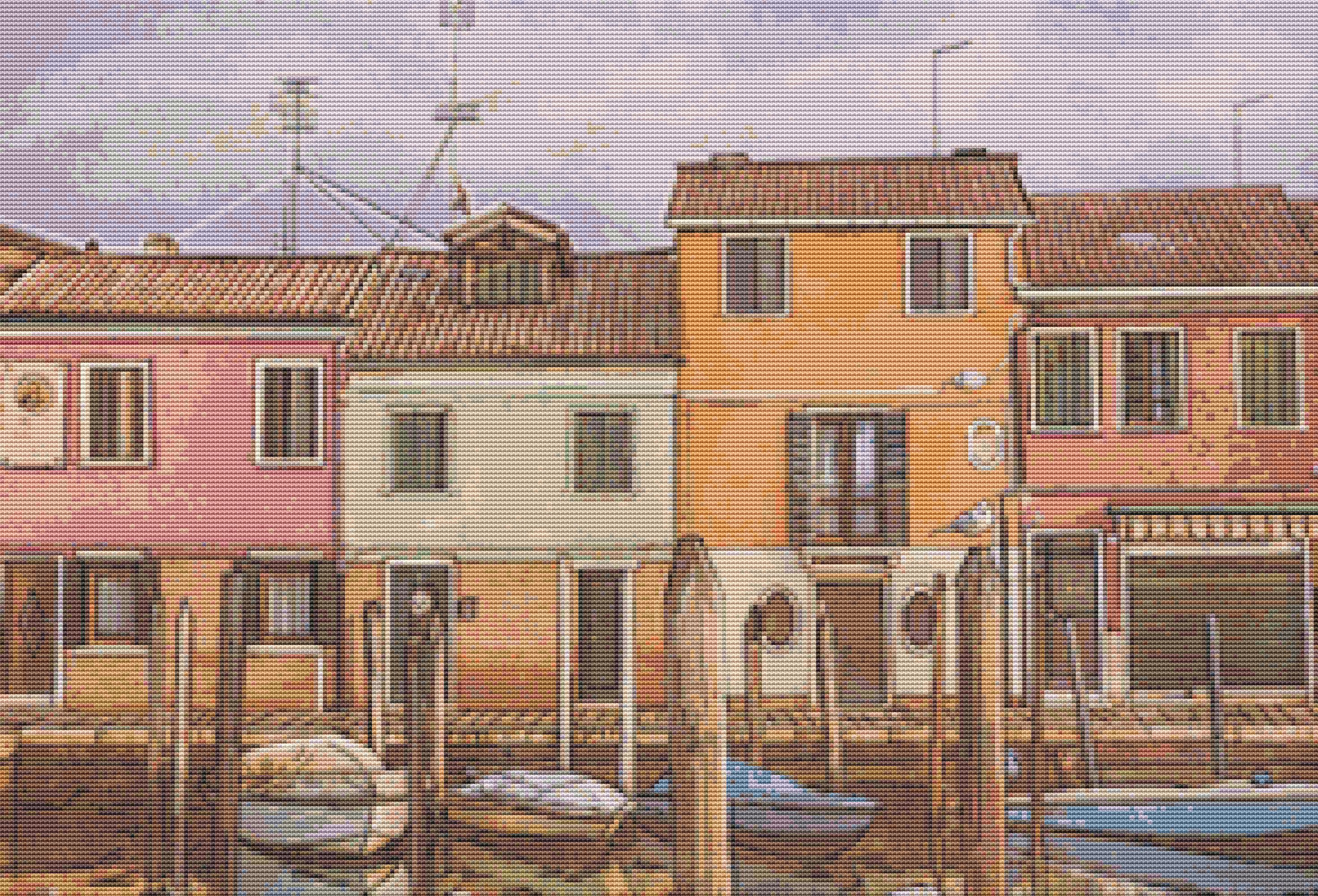 This cross stitch pattern depicts a picture of a row of house in a port.