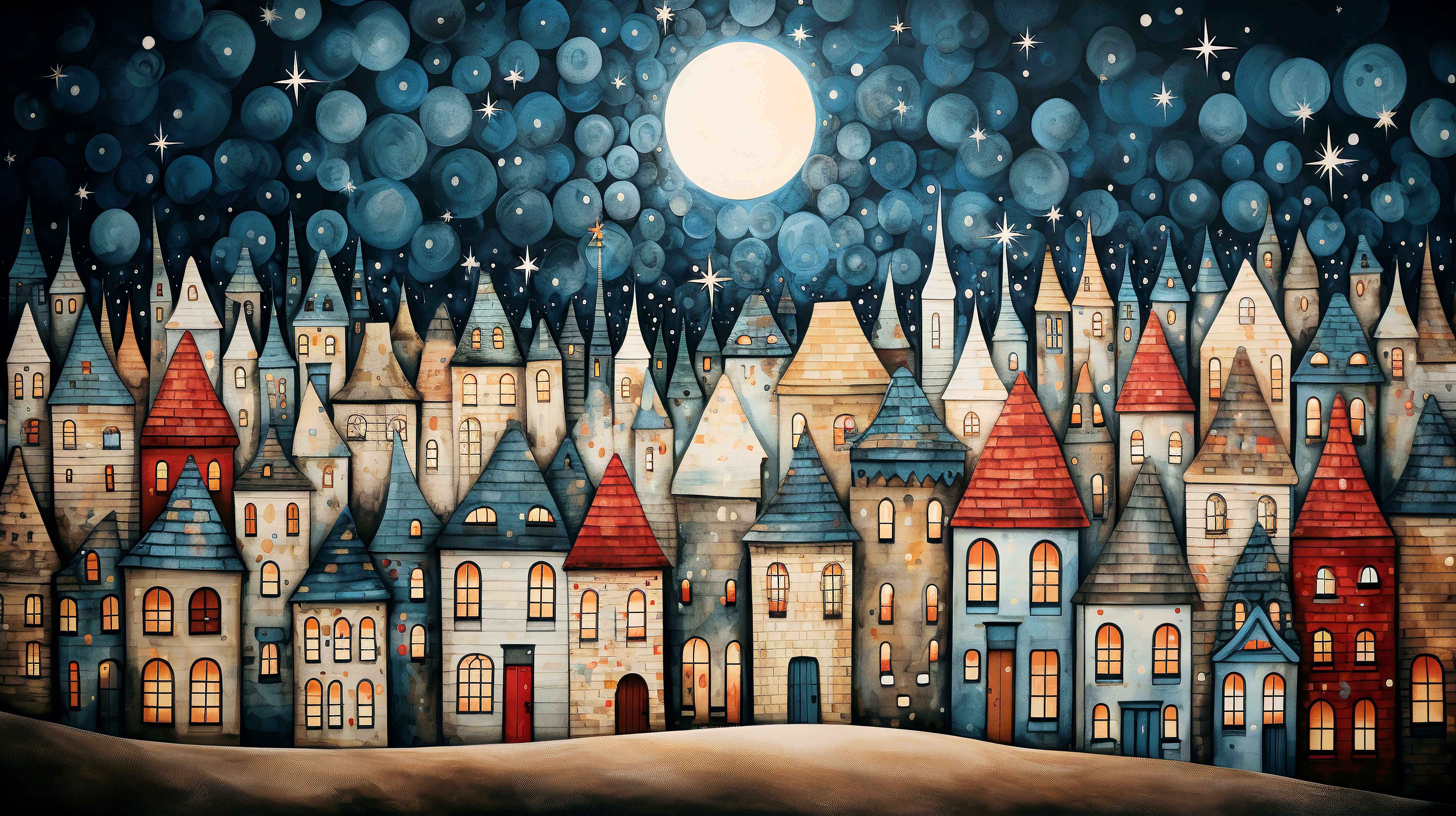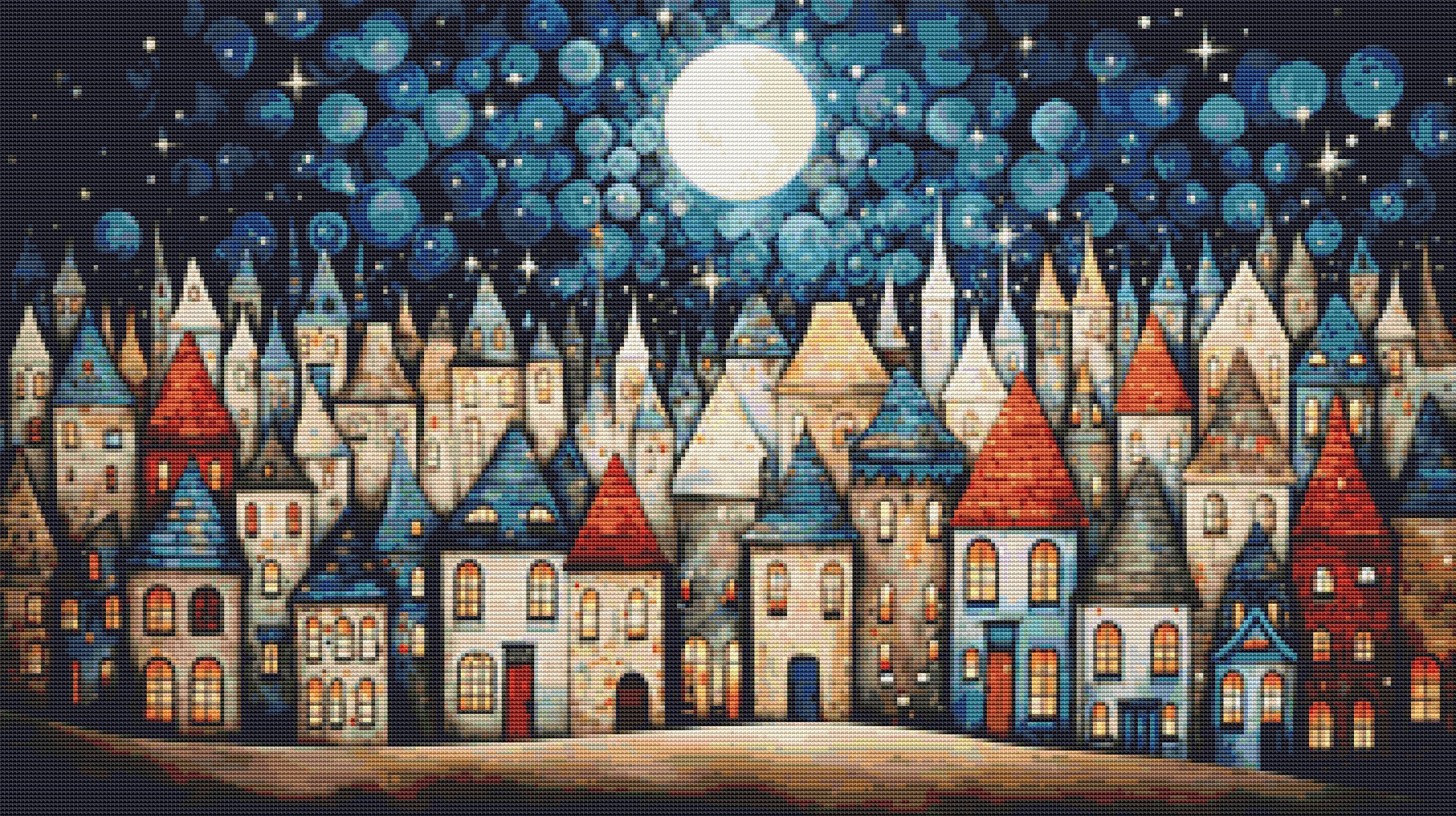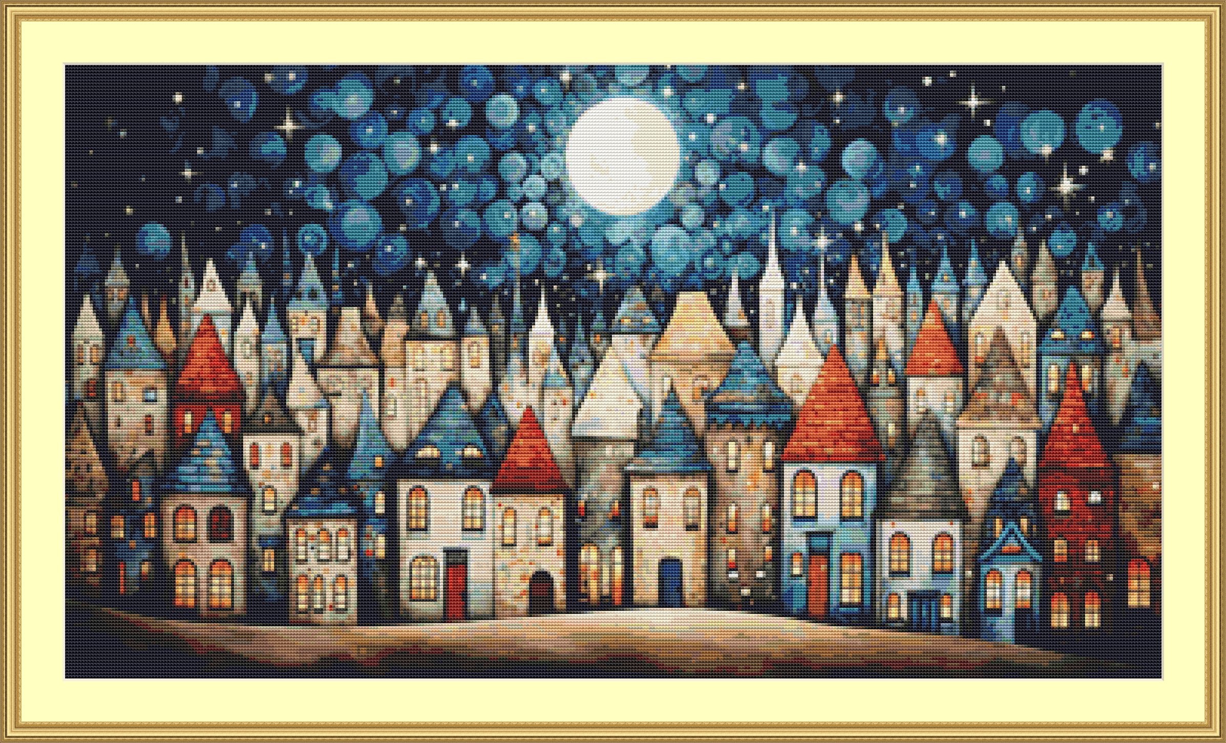 This cross stitch pattern depicts a picture of a group of houses under the moon and stars.