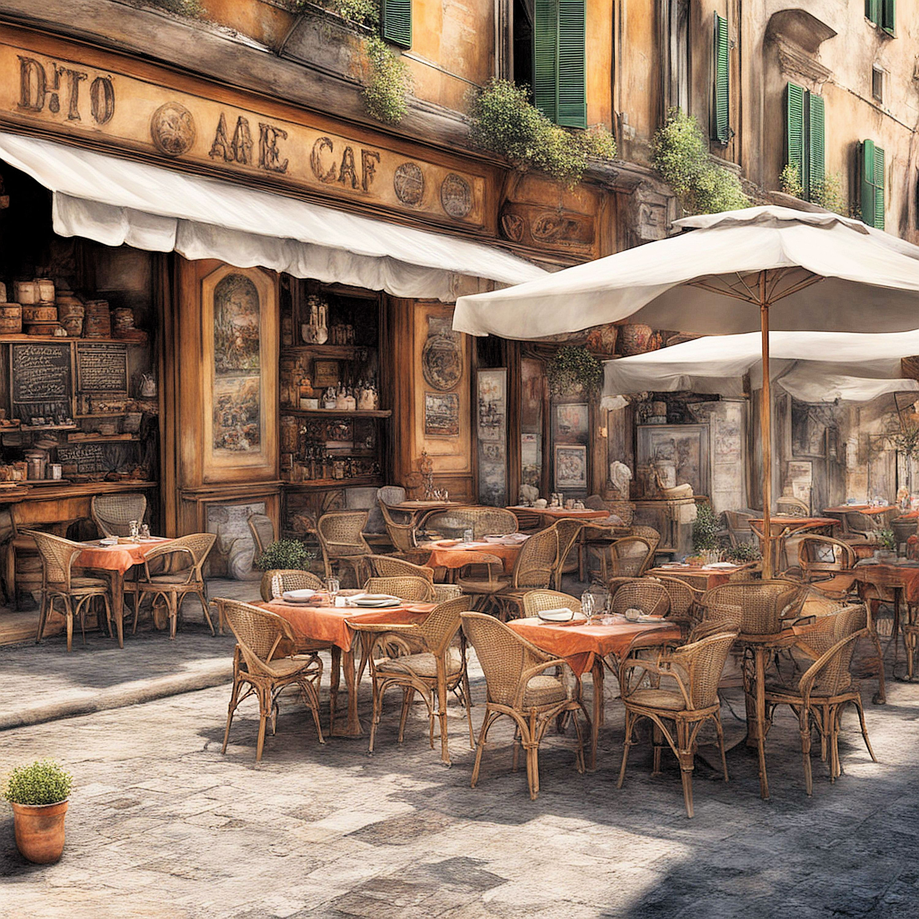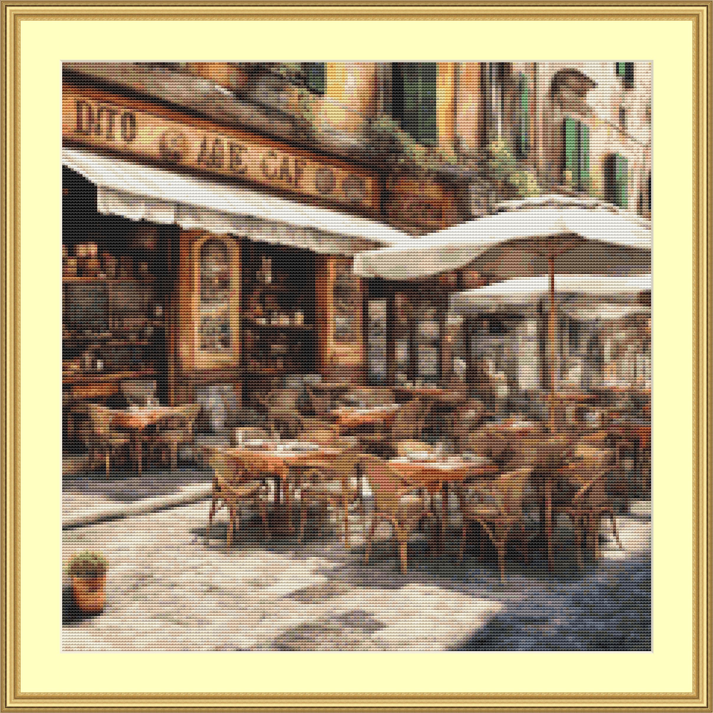 This cross stitch pattern depicts a picture of the outside of a cafe in Italy.