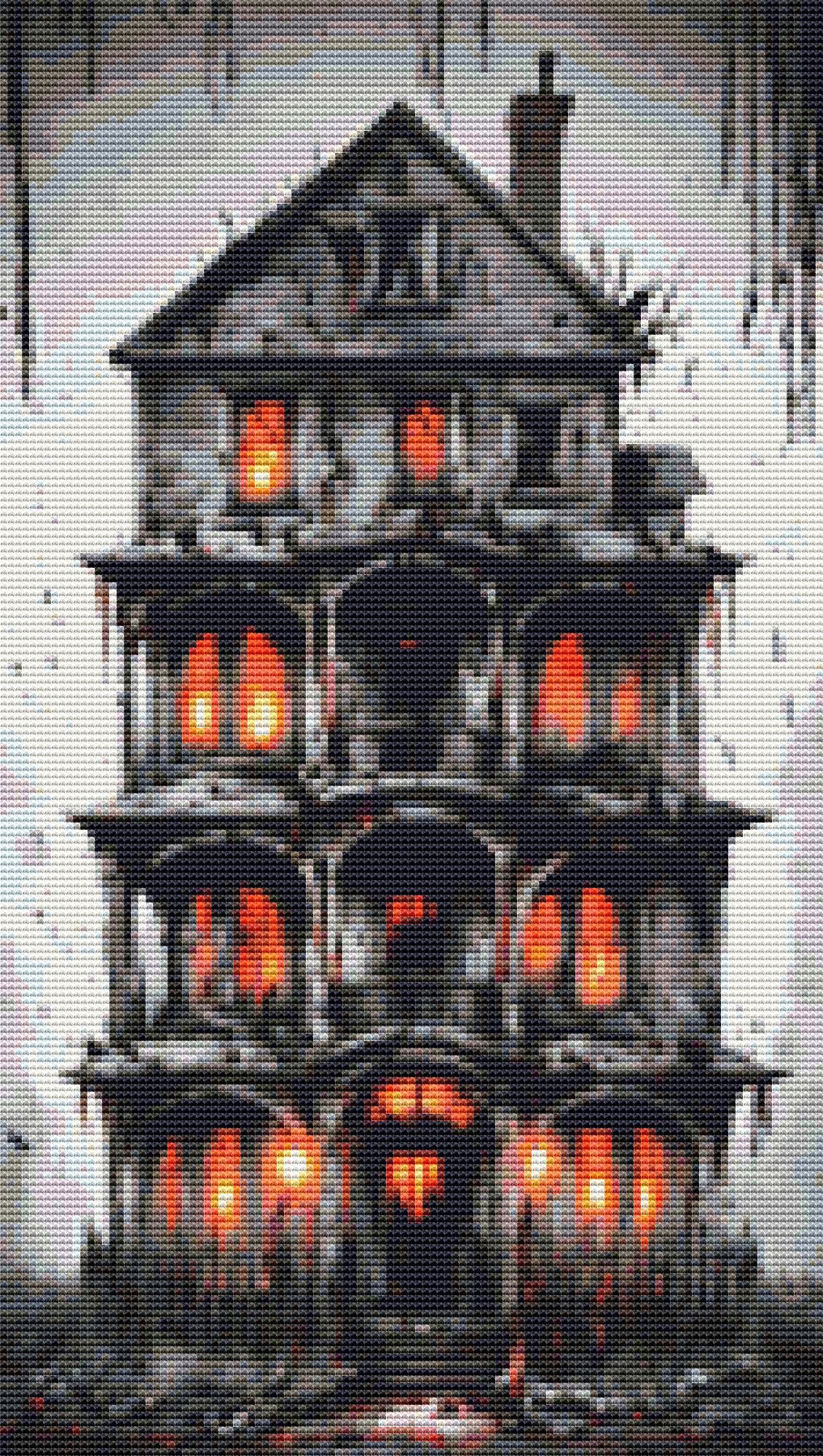 This cross stitch pattern depicts a picture of a house that is perfect for Halloween.