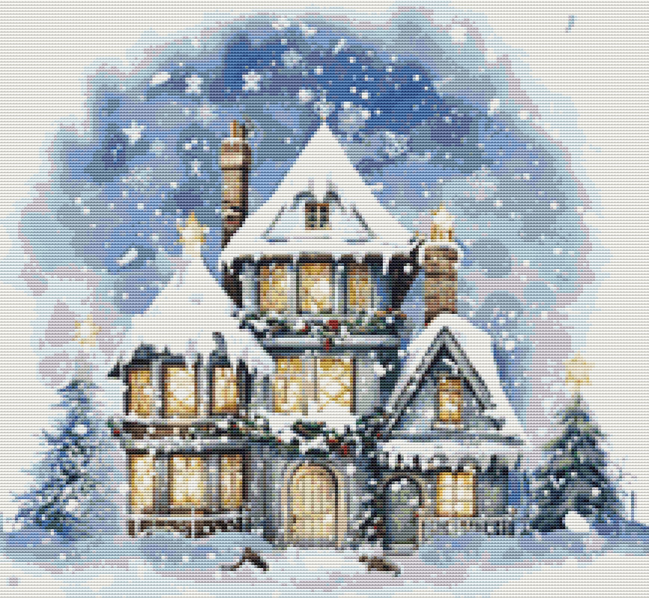 This cross stitch pattern depicts a picture of a beautiful house with gabled roof.