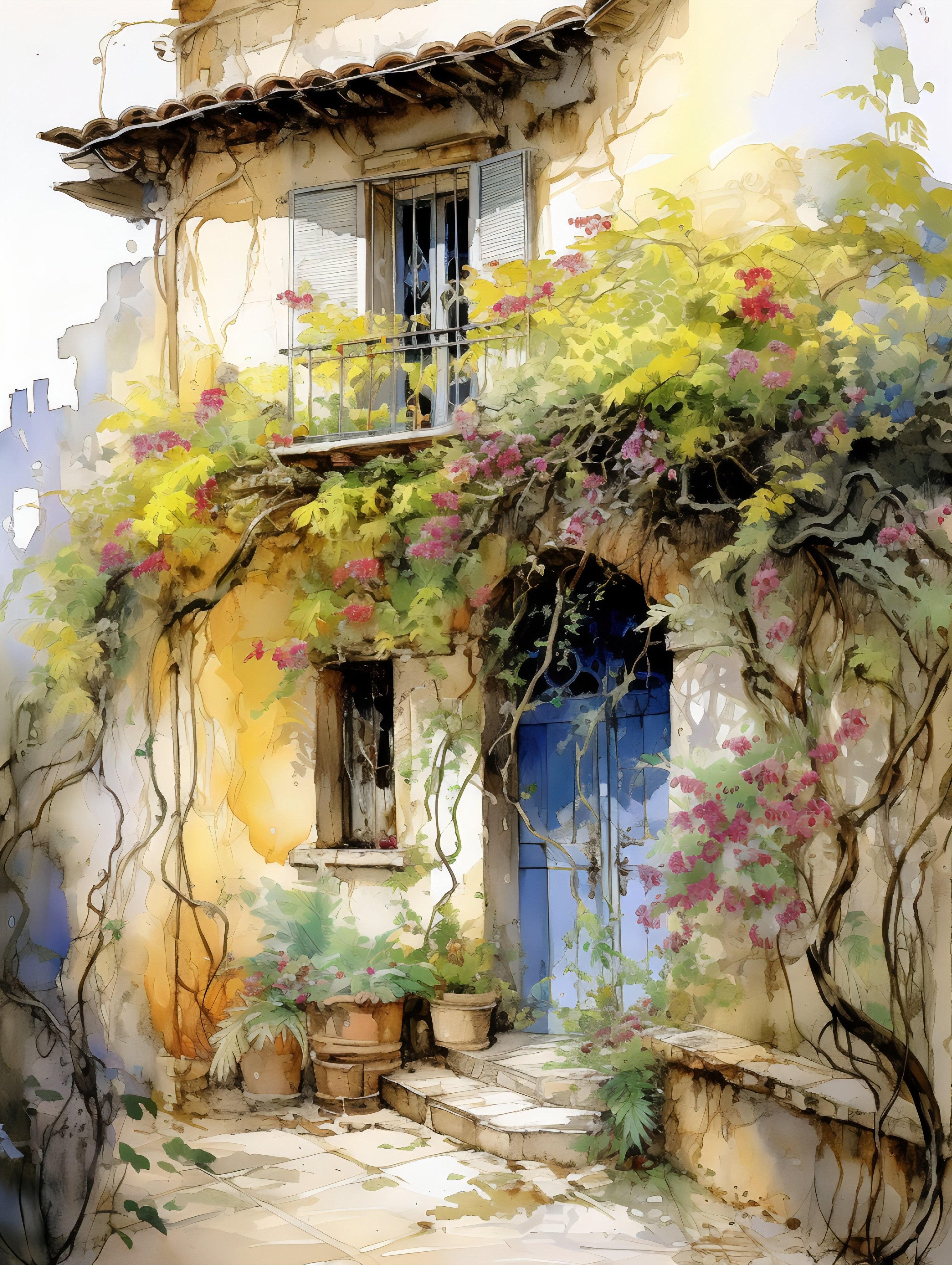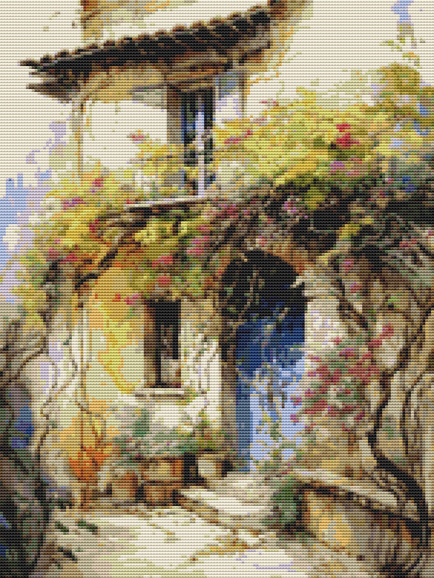 This cross stitch pattern depicts a picture of the front door of a lovely villa.