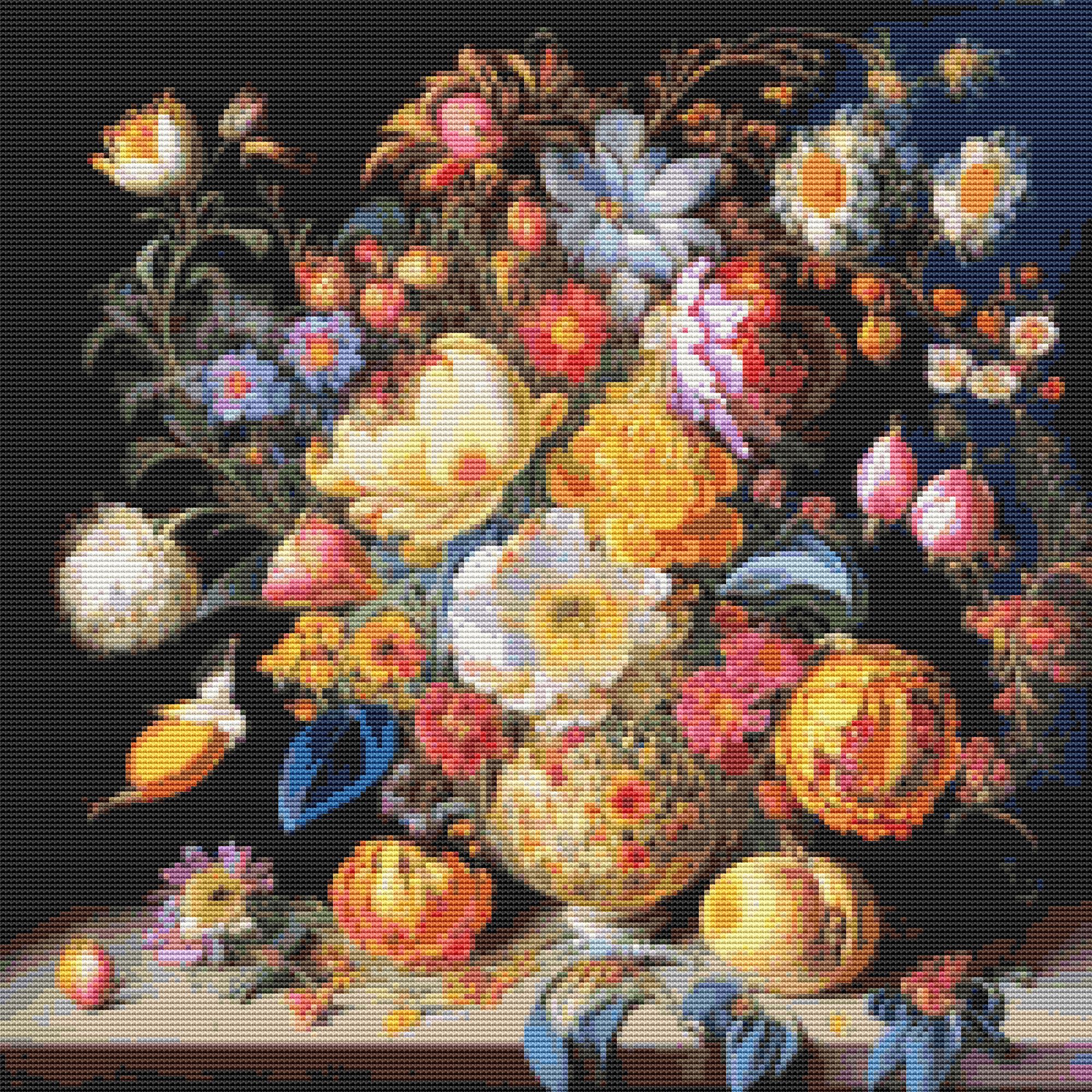 This cross stitch pattern depicts a picture of an ornate vase full of beautiful flowers.