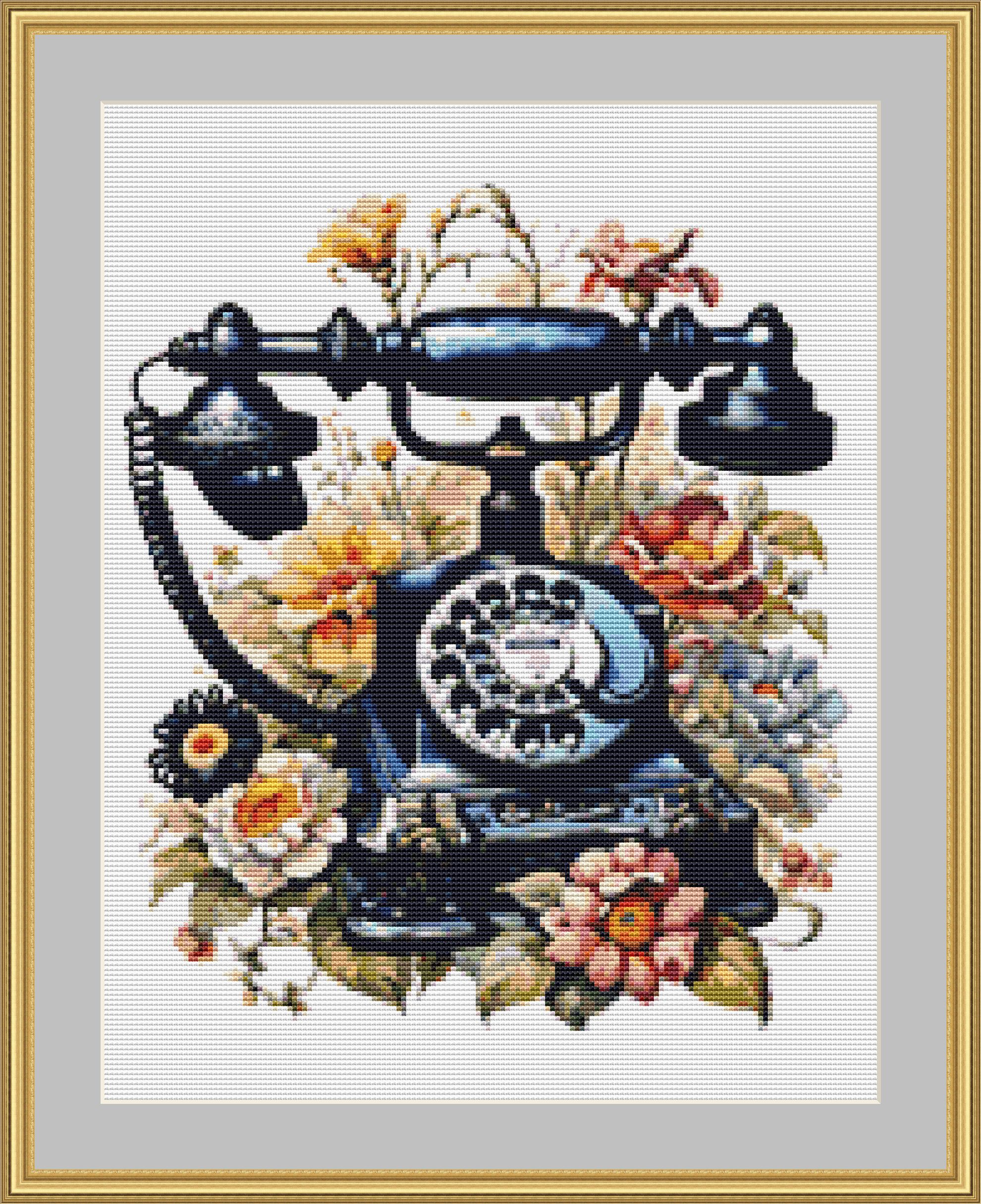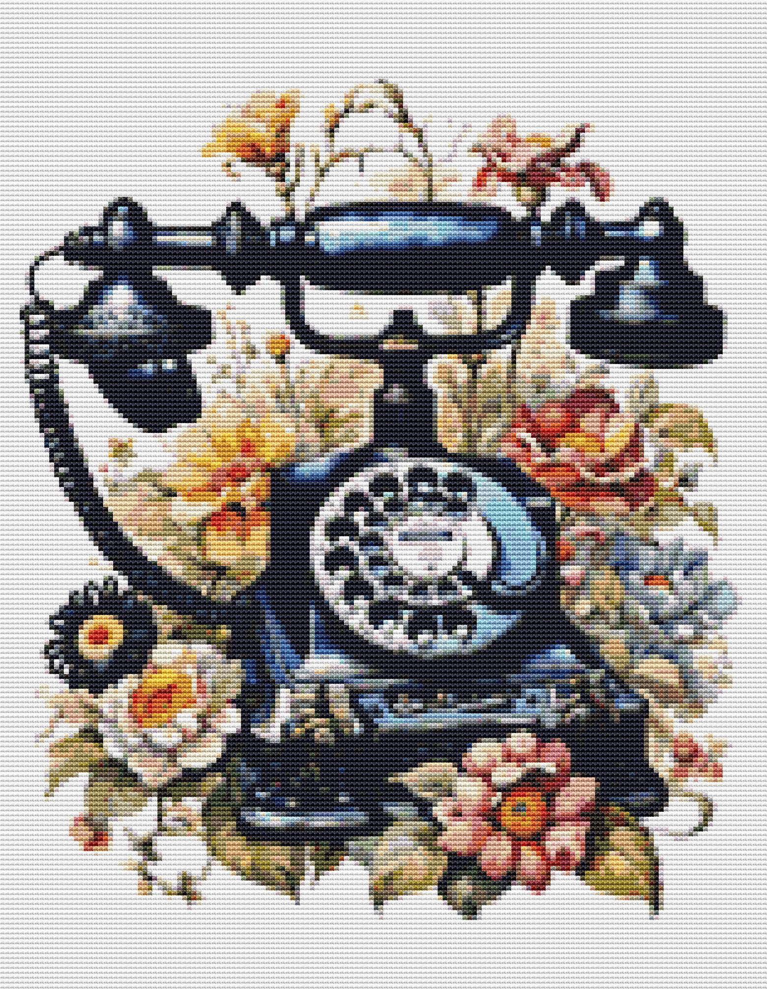 This cross stitch pattern depicts a picture of an old fashioned telephone surrounded by flowers.