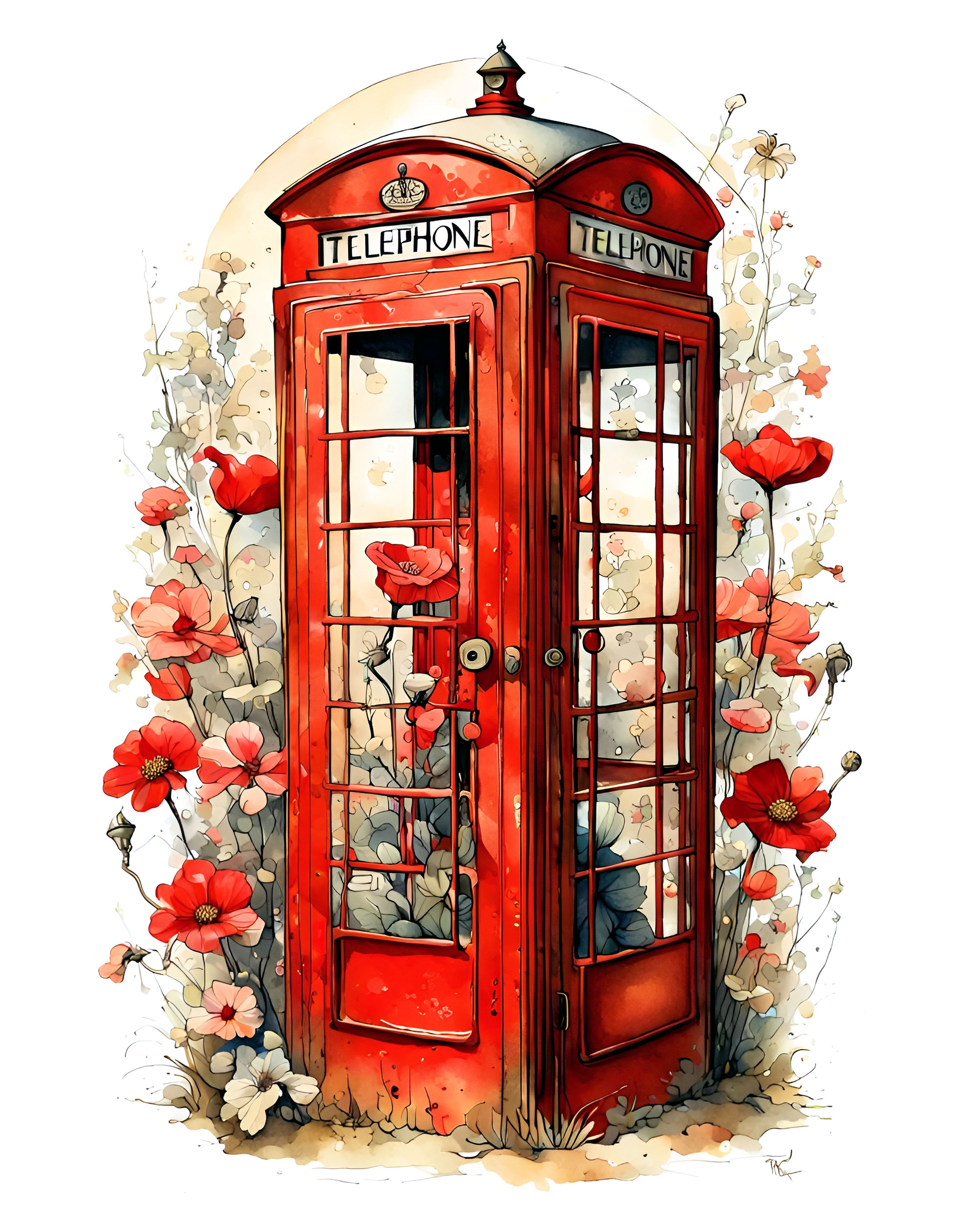 This cross stitch pattern depicts a picture of an old fashioned red telephone box surrounded by flowers.