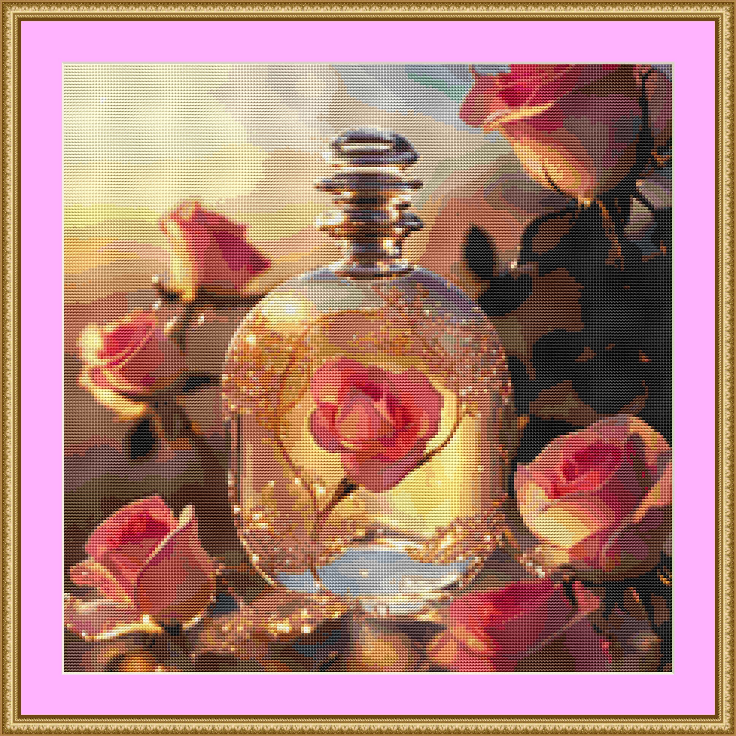 This cross stitch pattern depicts a picture of a pretty pink rose in a glass bottle.