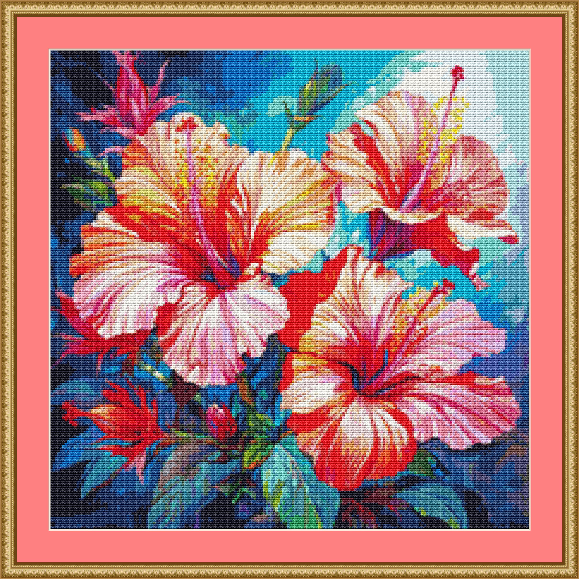 This cross stitch pattern depicts a picture of some stunning red hibiscus flowers.