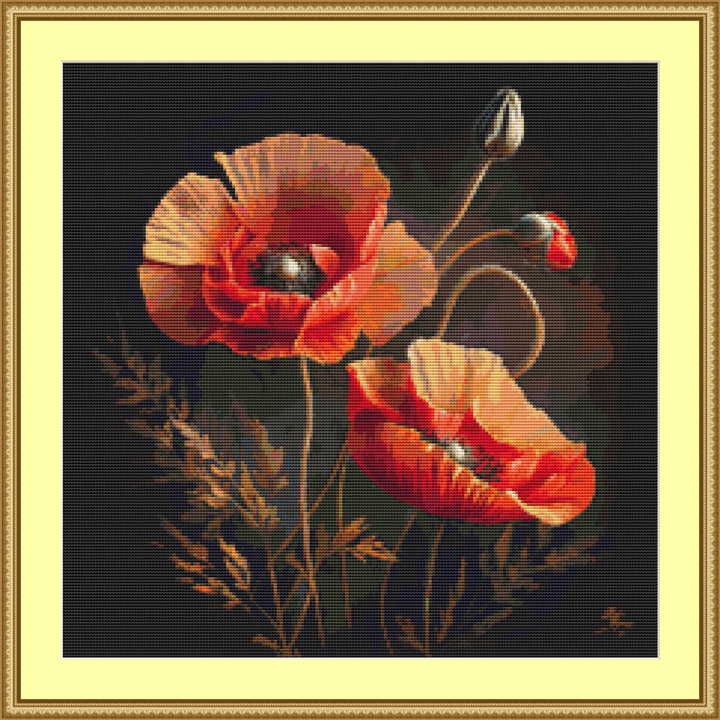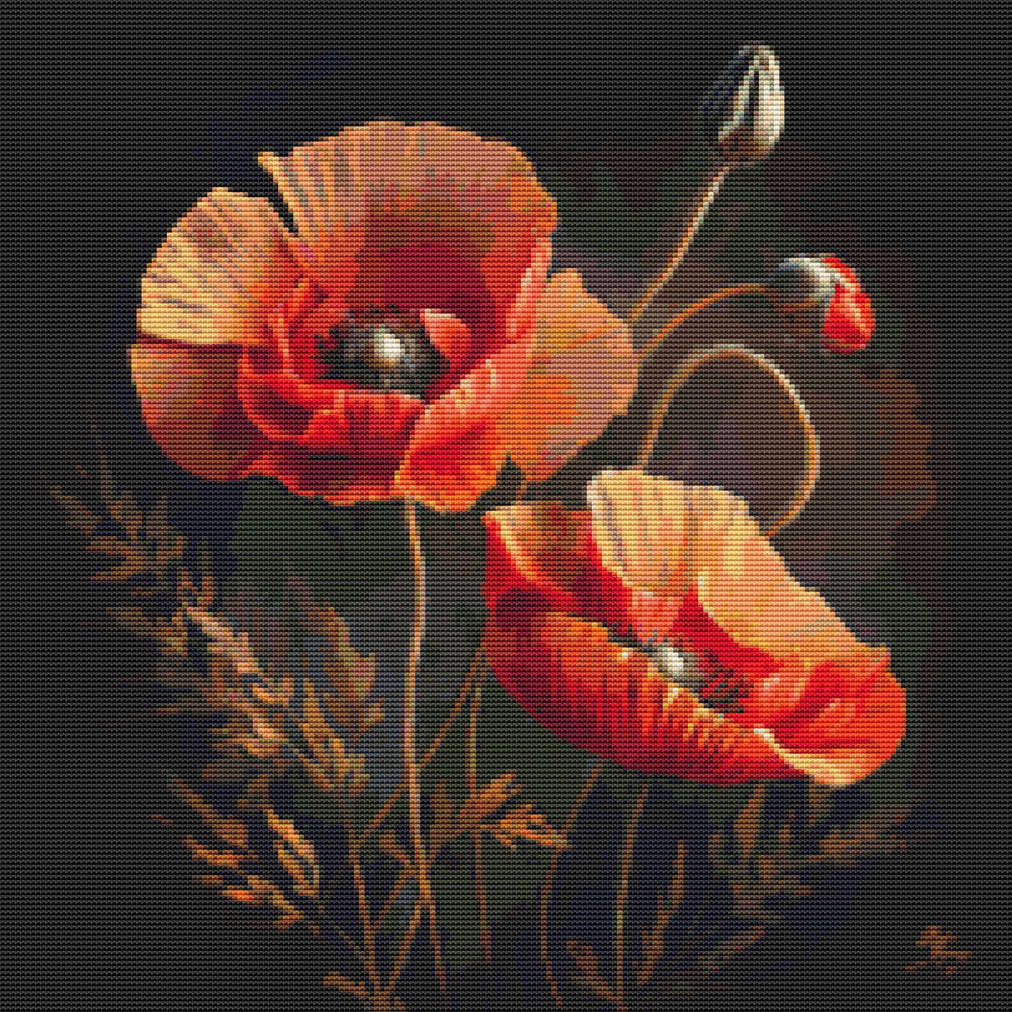 This cross stitch pattern depicts a picture of some delicate looking poppies.
