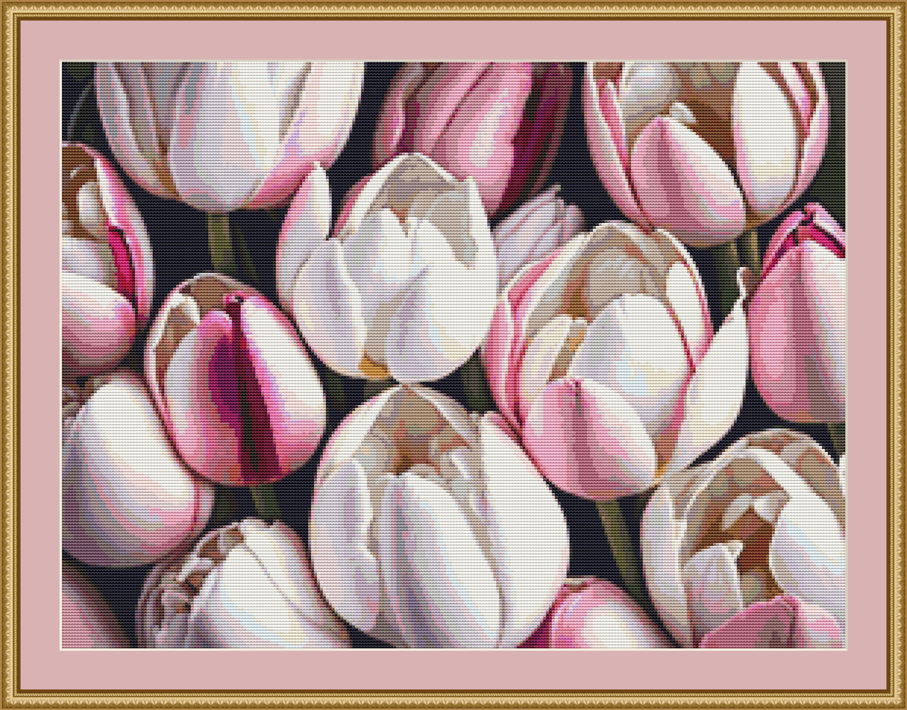 This cross stitch pattern depicts a picture of some beautiful pink and white tulips.