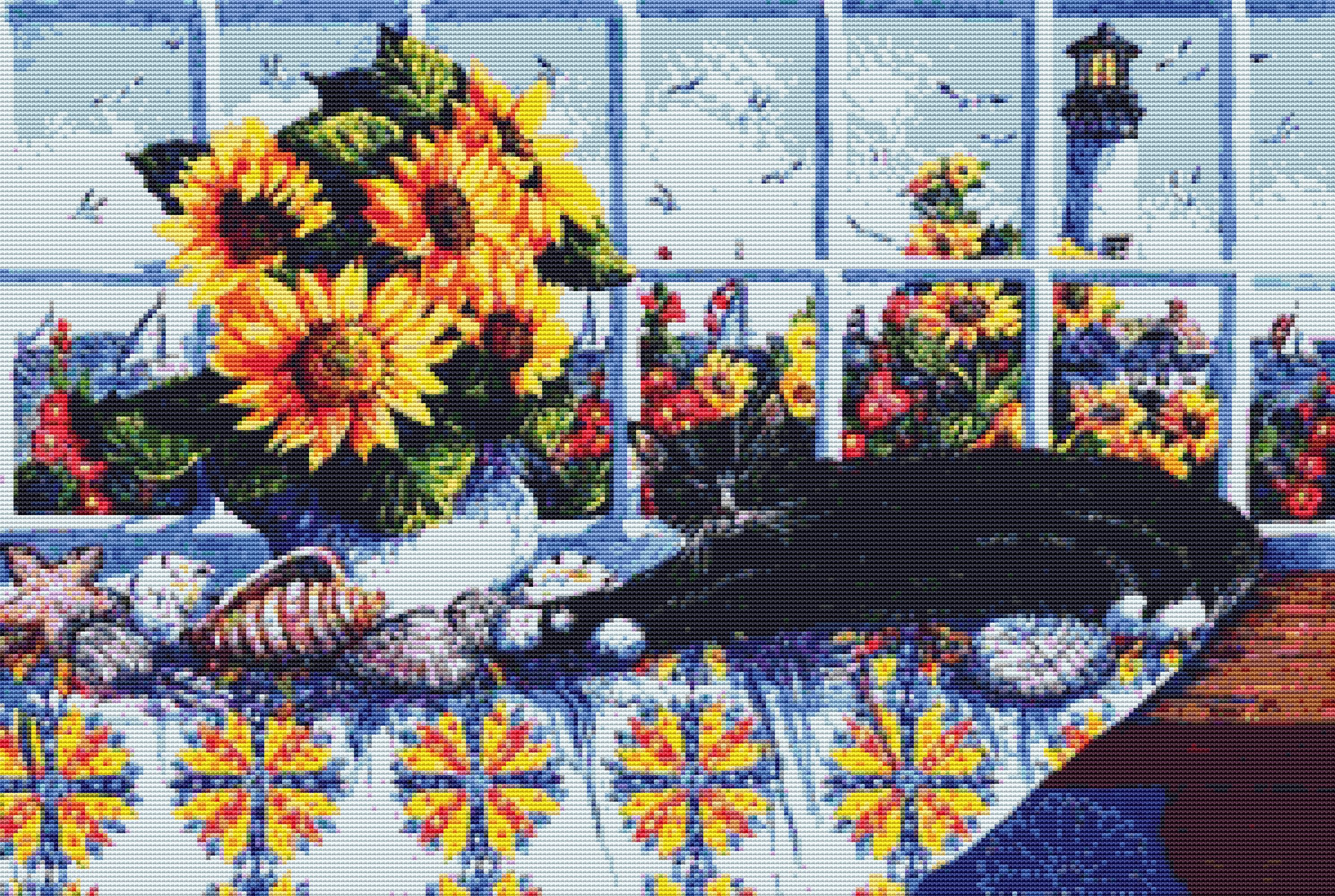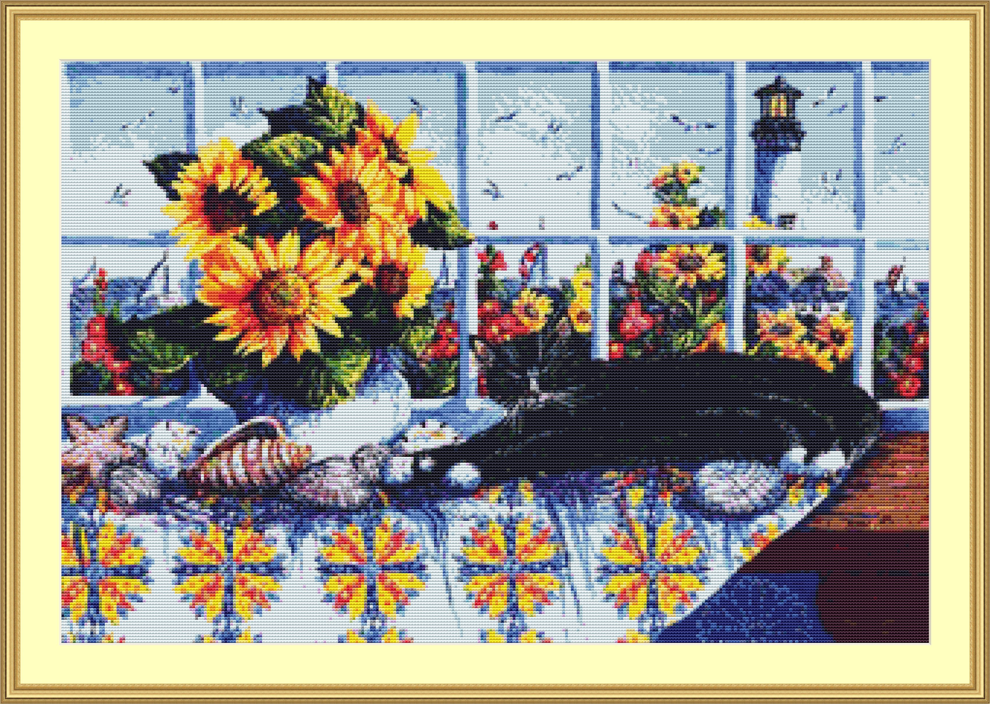 This cross stitch pattern depicts a picture of a window with sunflowers that look onto a lighthouse.