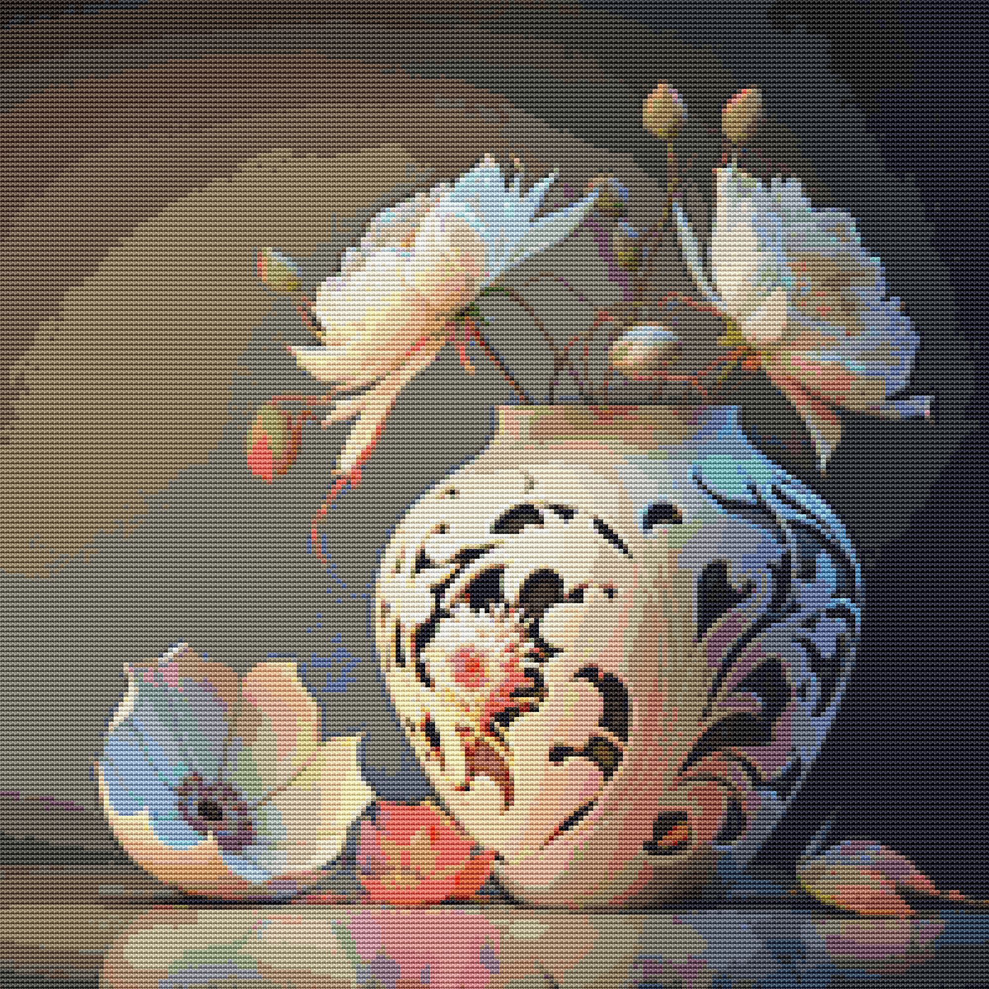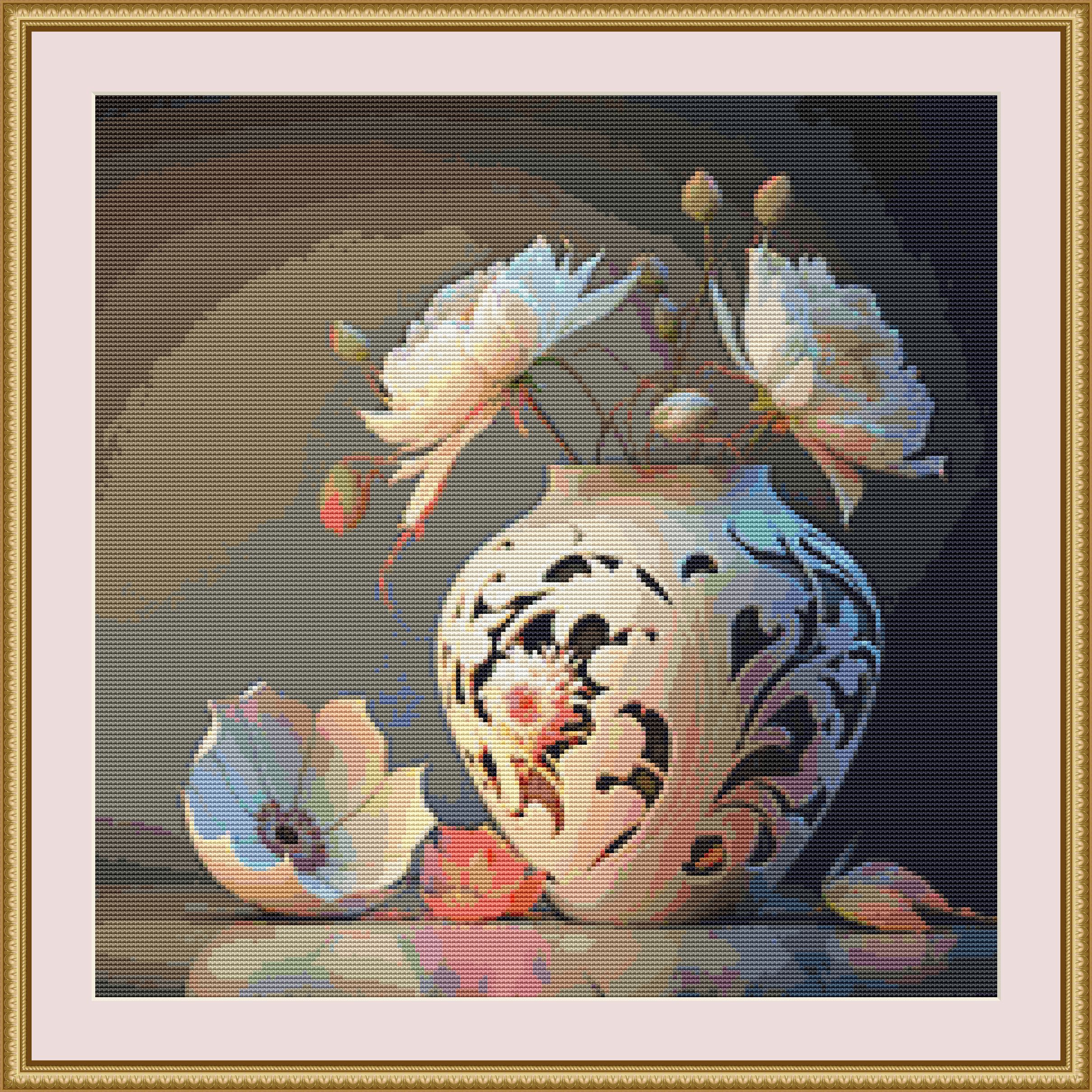 This cross stitch pattern depicts a picture of an ornamental vase containing some pretty flowers.
