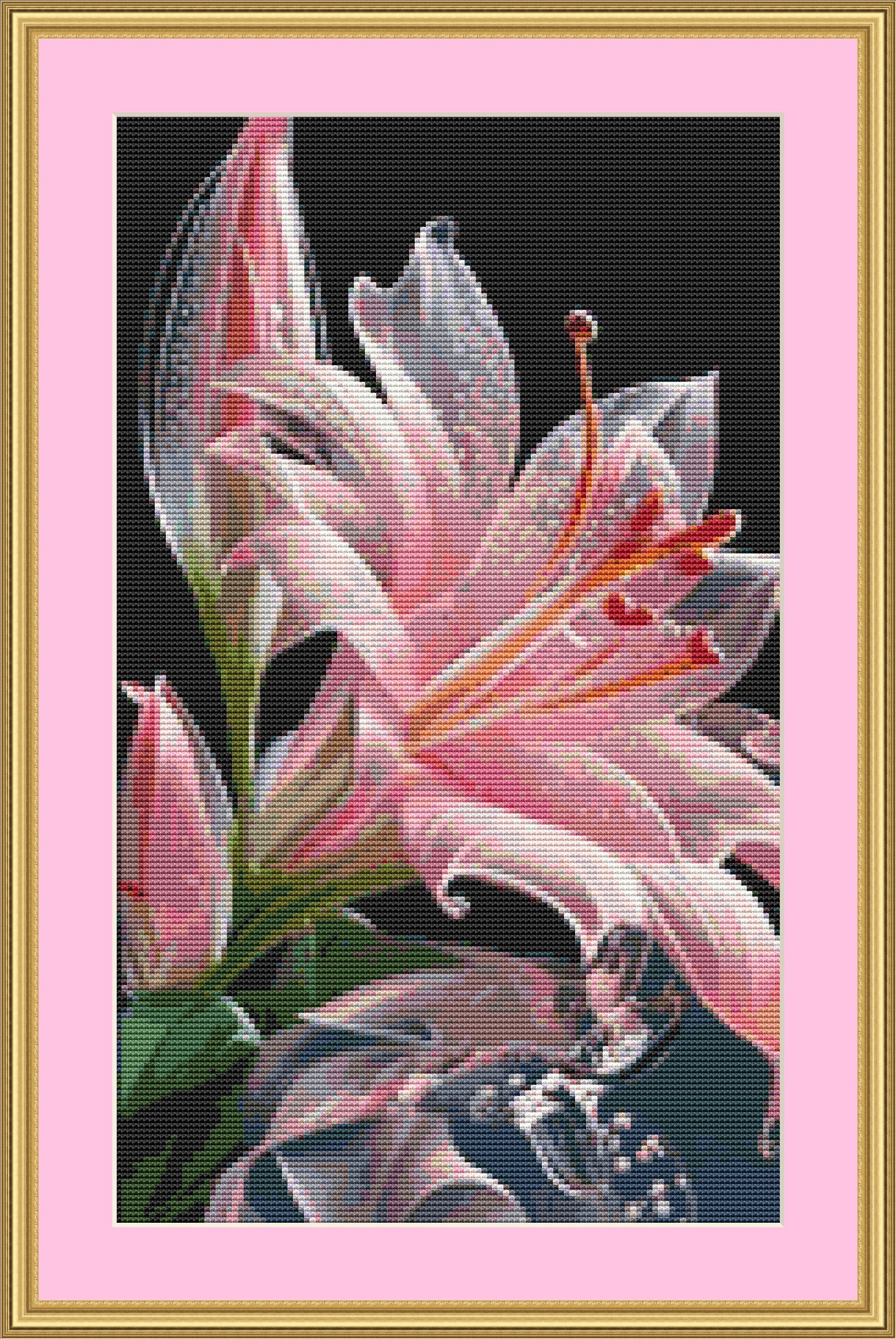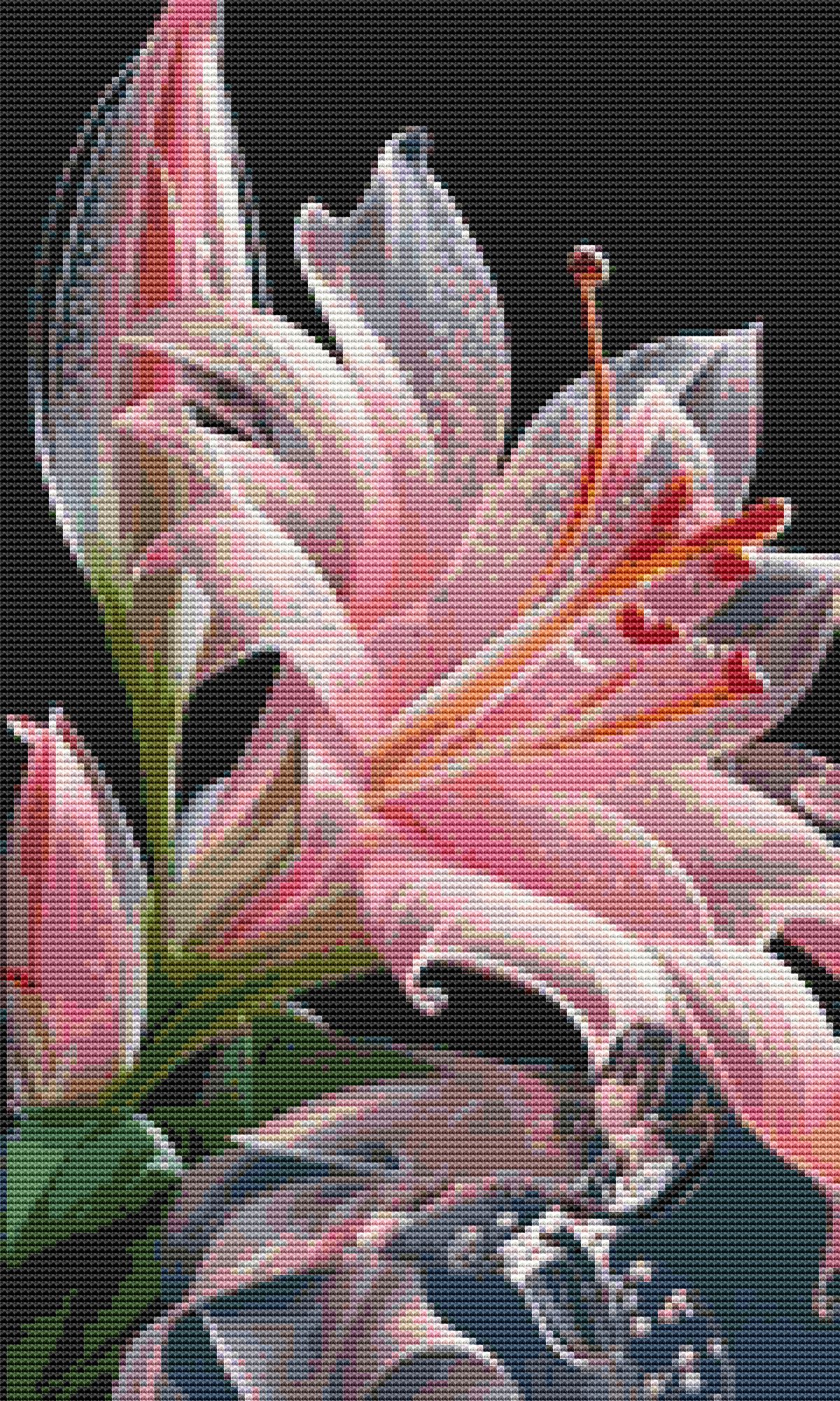 This cross stitch pattern depicts a picture of a stunning Jersey lily flower