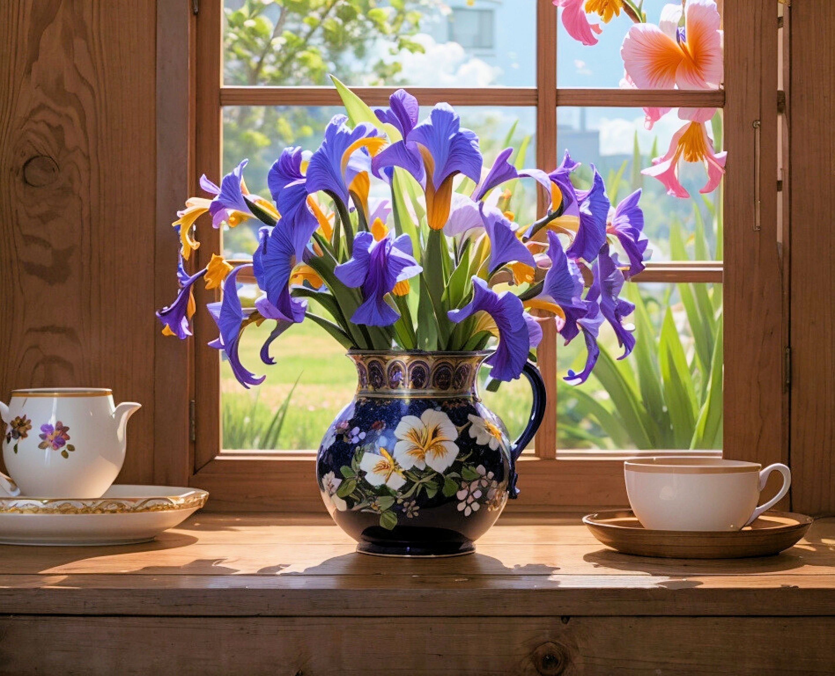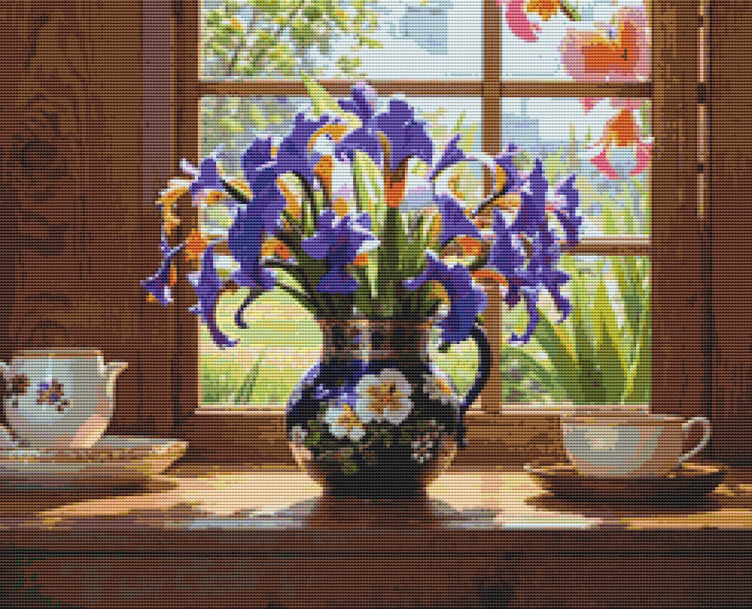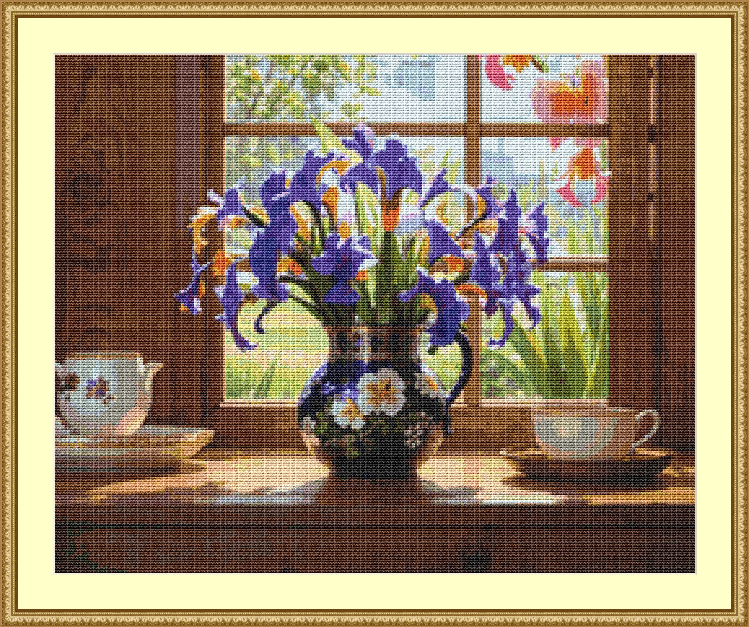This cross stitch pattern depicts a picture of a group of beautiful iris flowers in a vase.