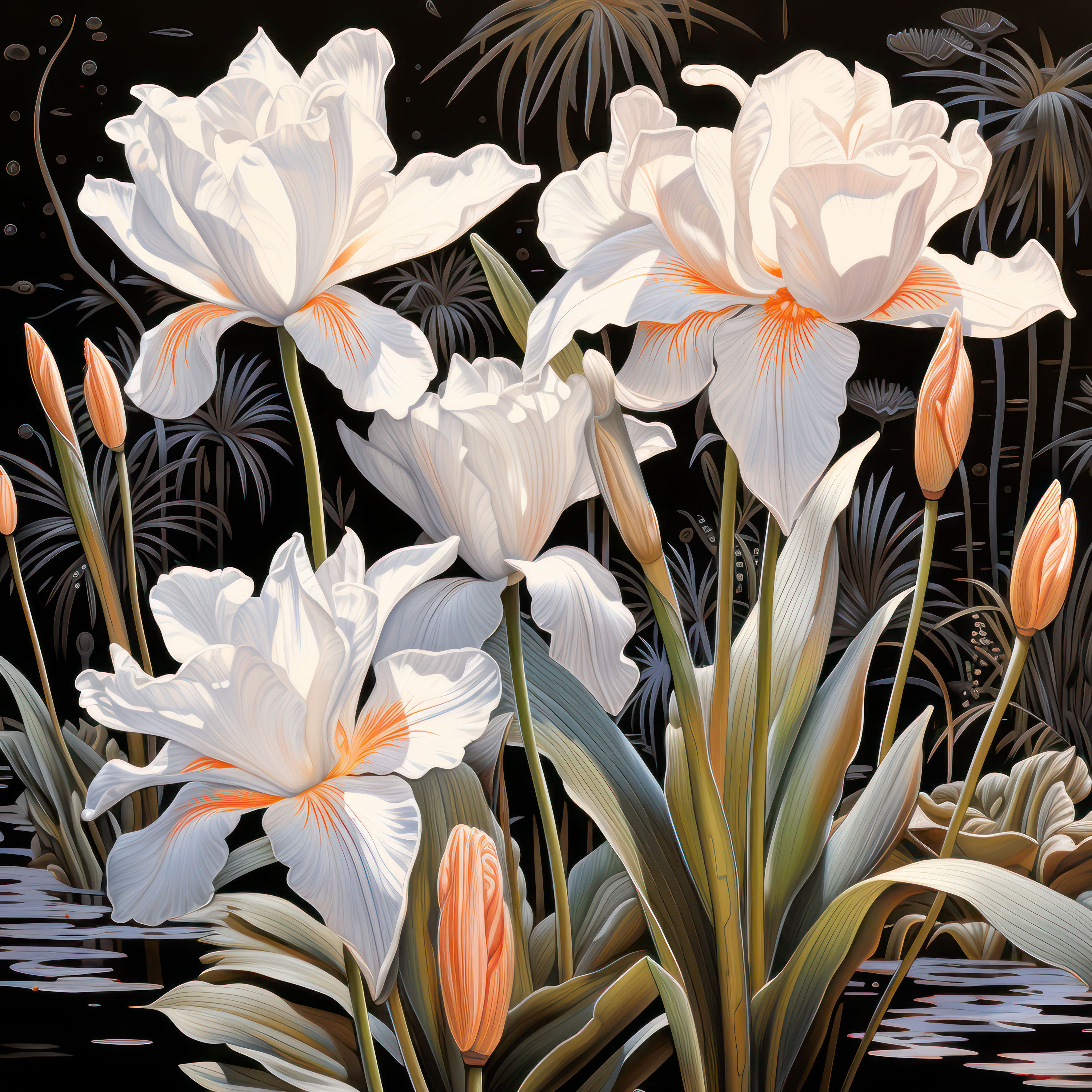This cross stitch pattern depicts a picture of some beautiful iris flowers on the edge of a pond.