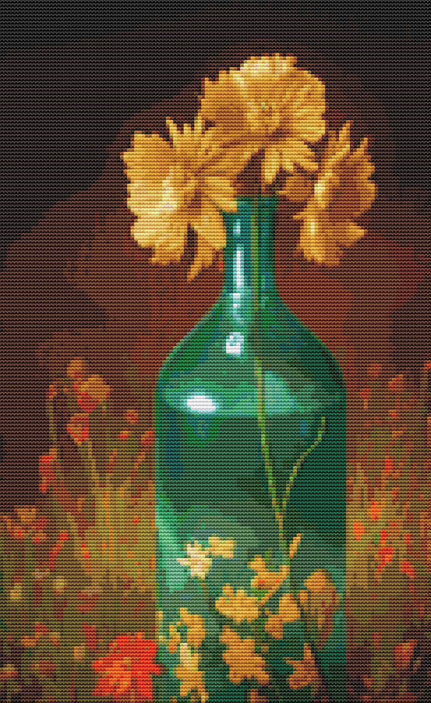 This cross stitch pattern depicts a picture of a decorated green bottle holding some flowers.