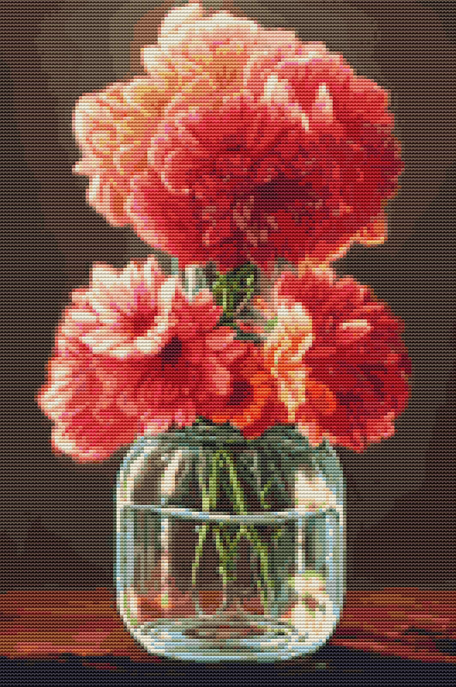 This cross stitch pattern depicts a picture of a pretty flower arrangement in a glass vase.
