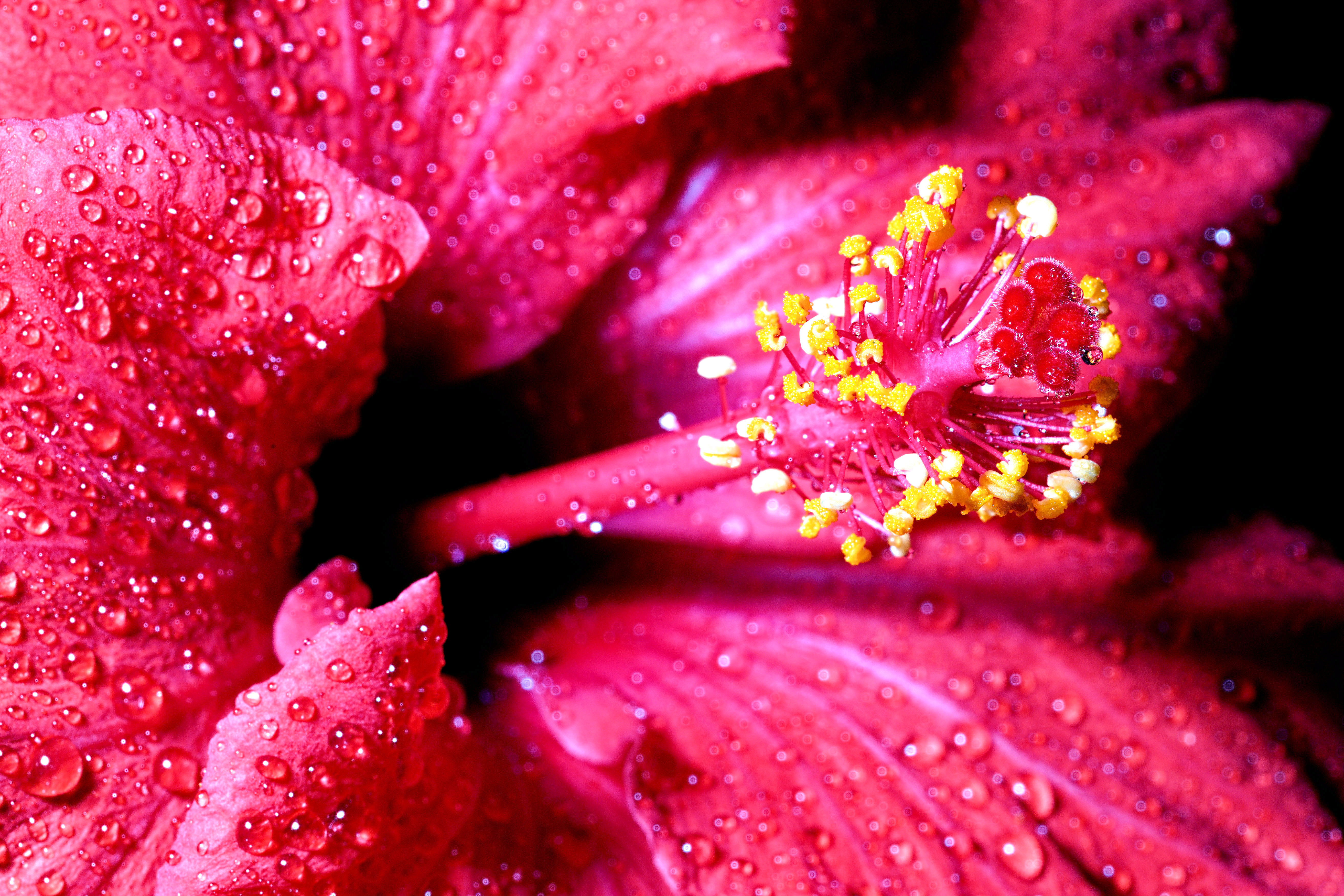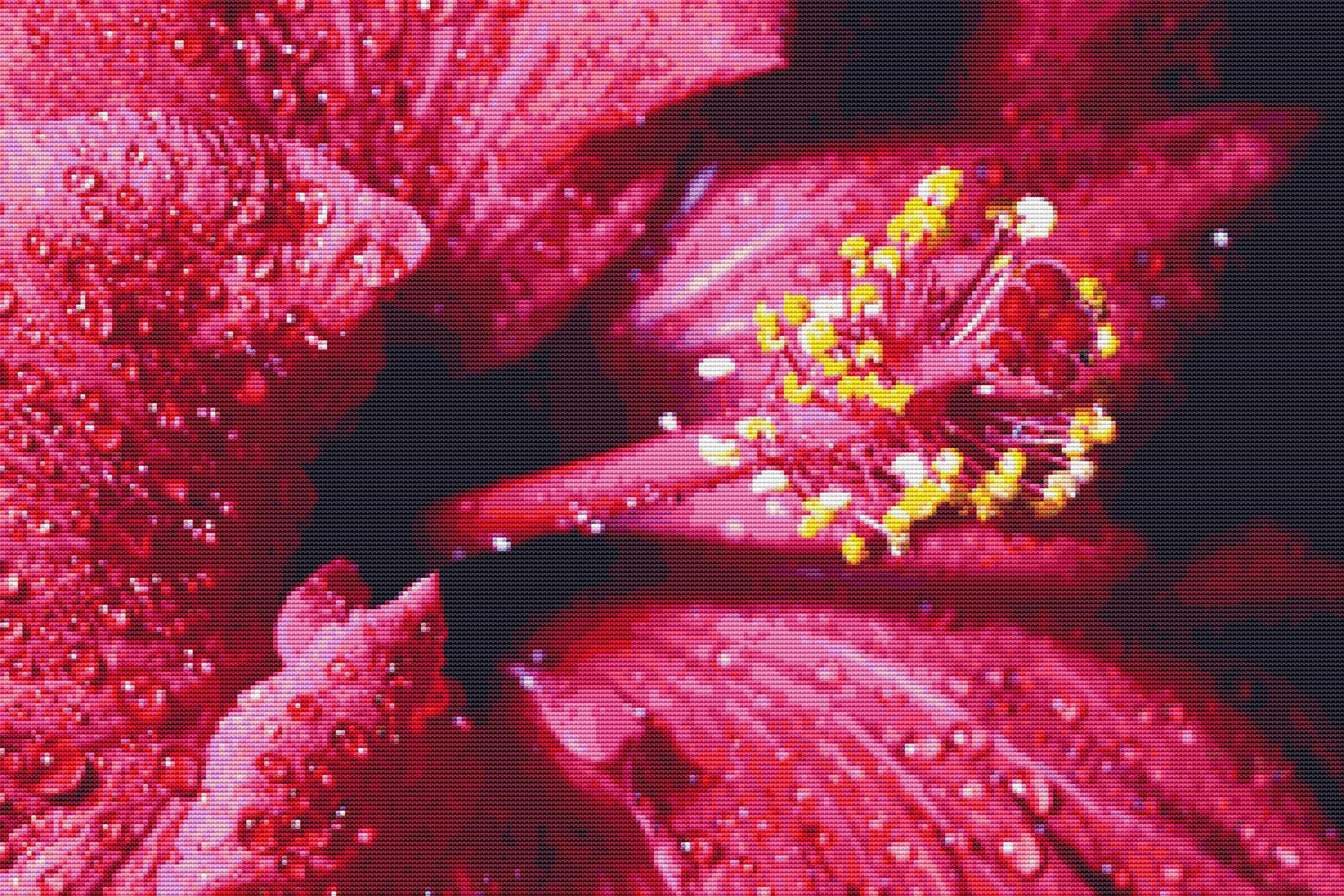 This cross stitch pattern depicts a picture of raindrops on the petal of an hibiscus flower.