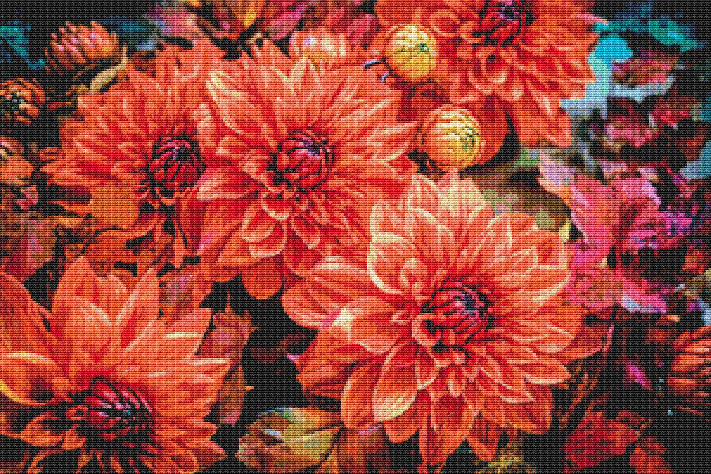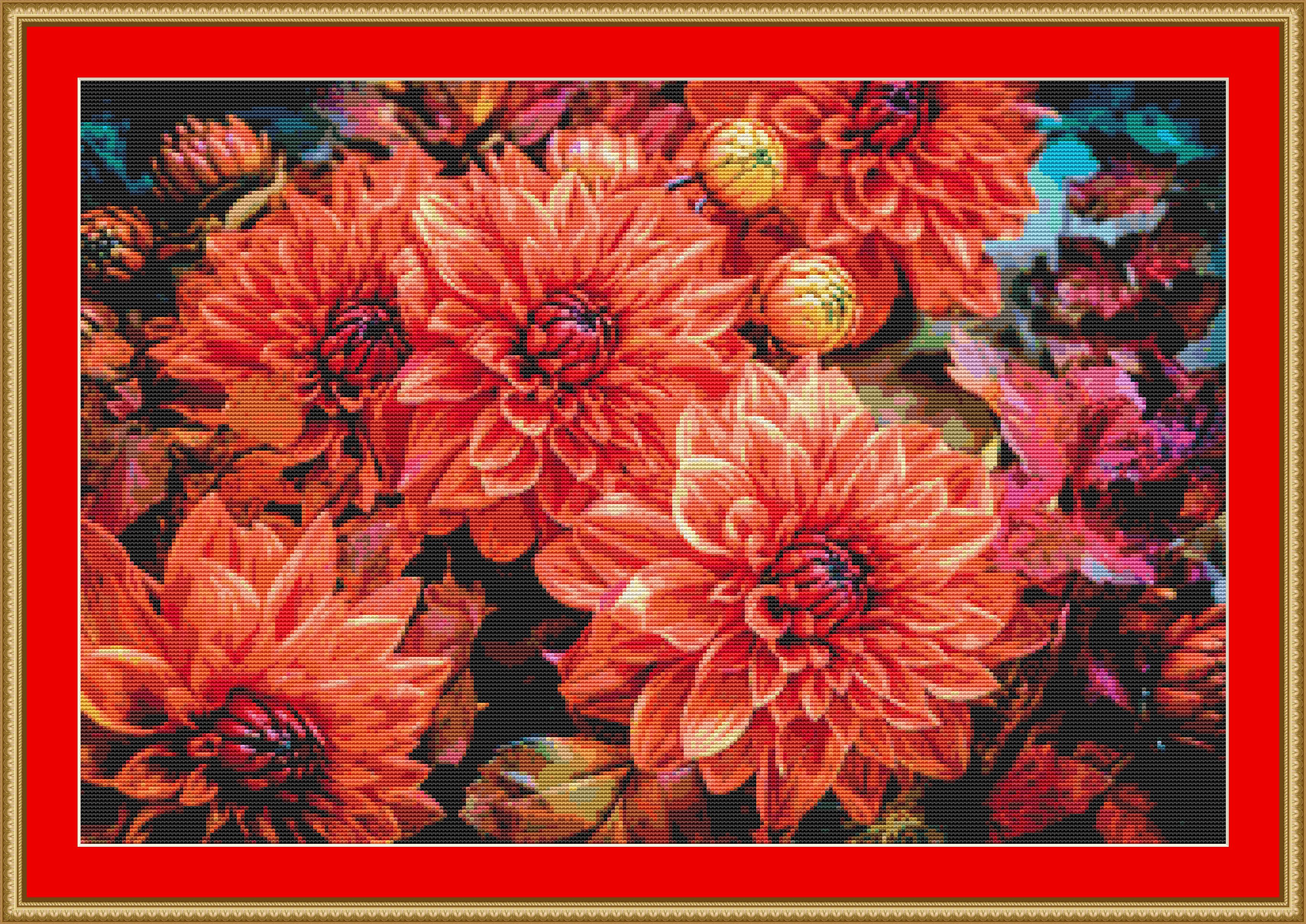 This cross stitch pattern depicts a picture of some pretty dahlia flowers.