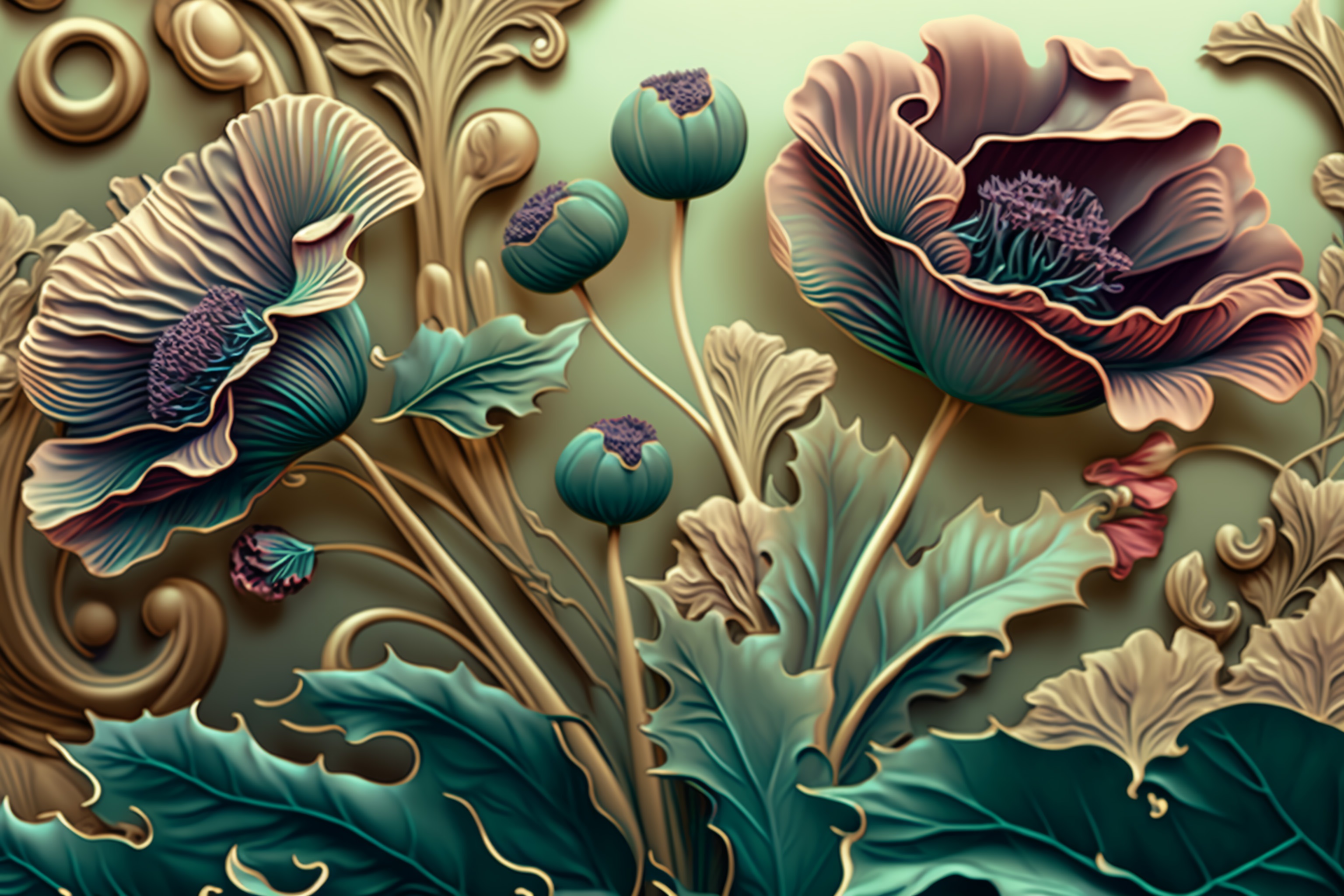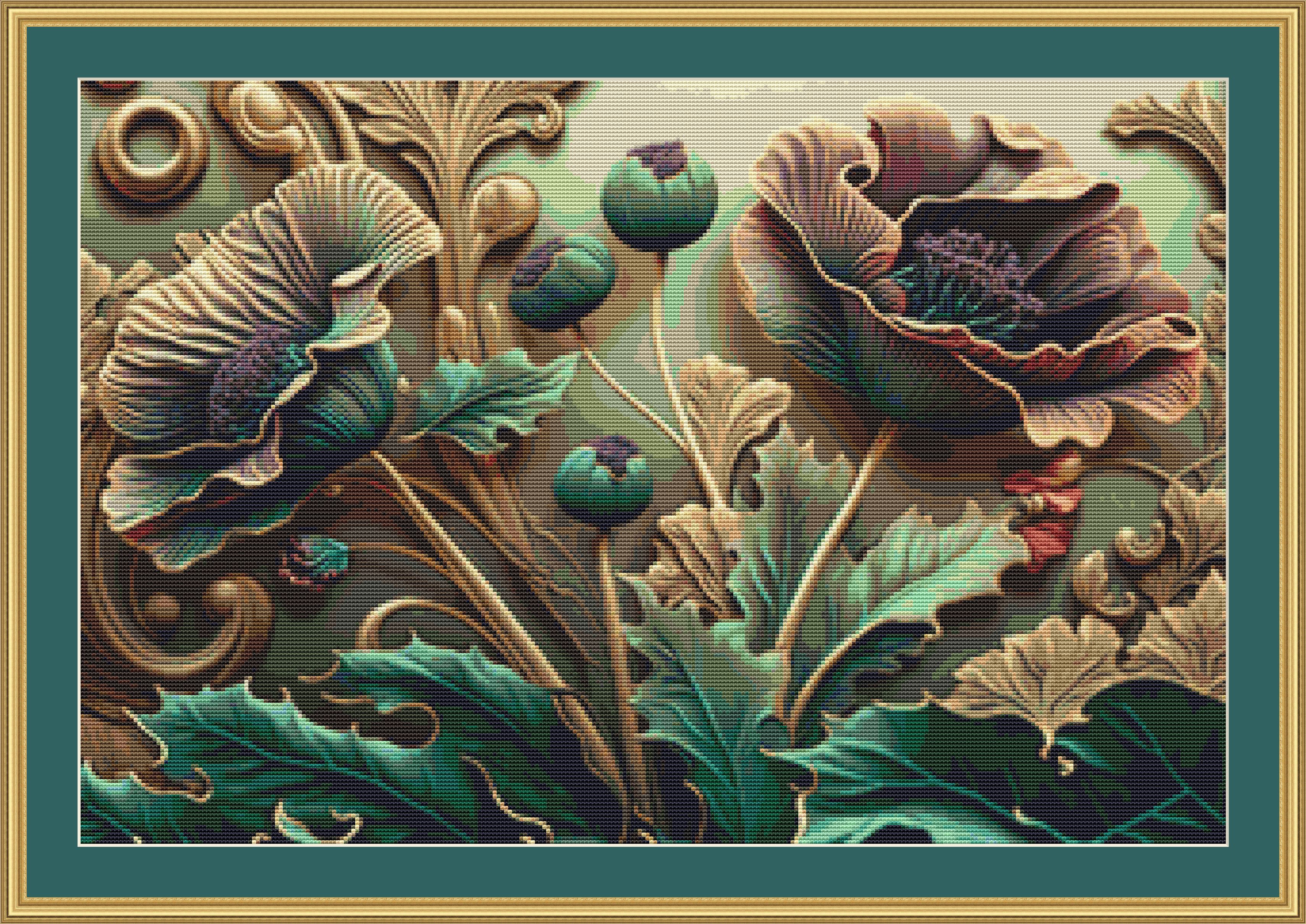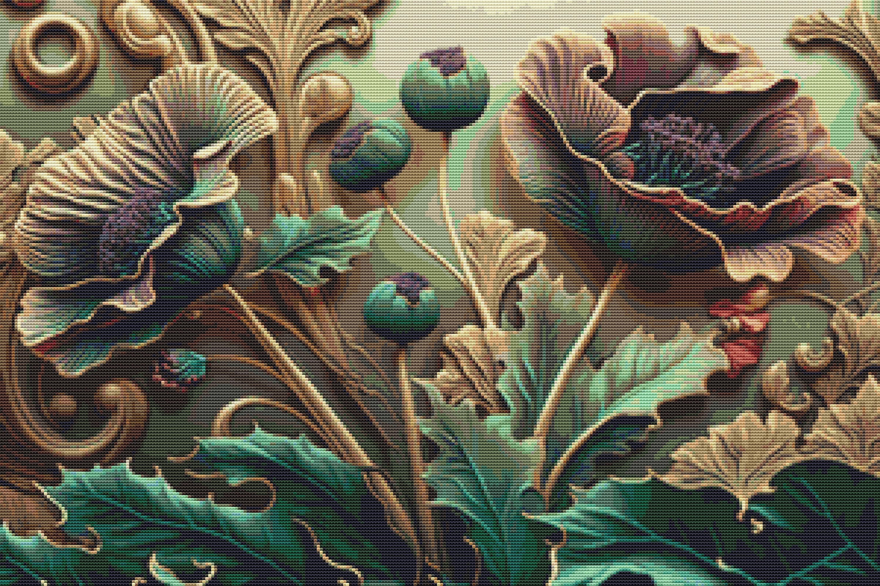 This cross stitch pattern depicts a picture of some unusual poppy flowers.