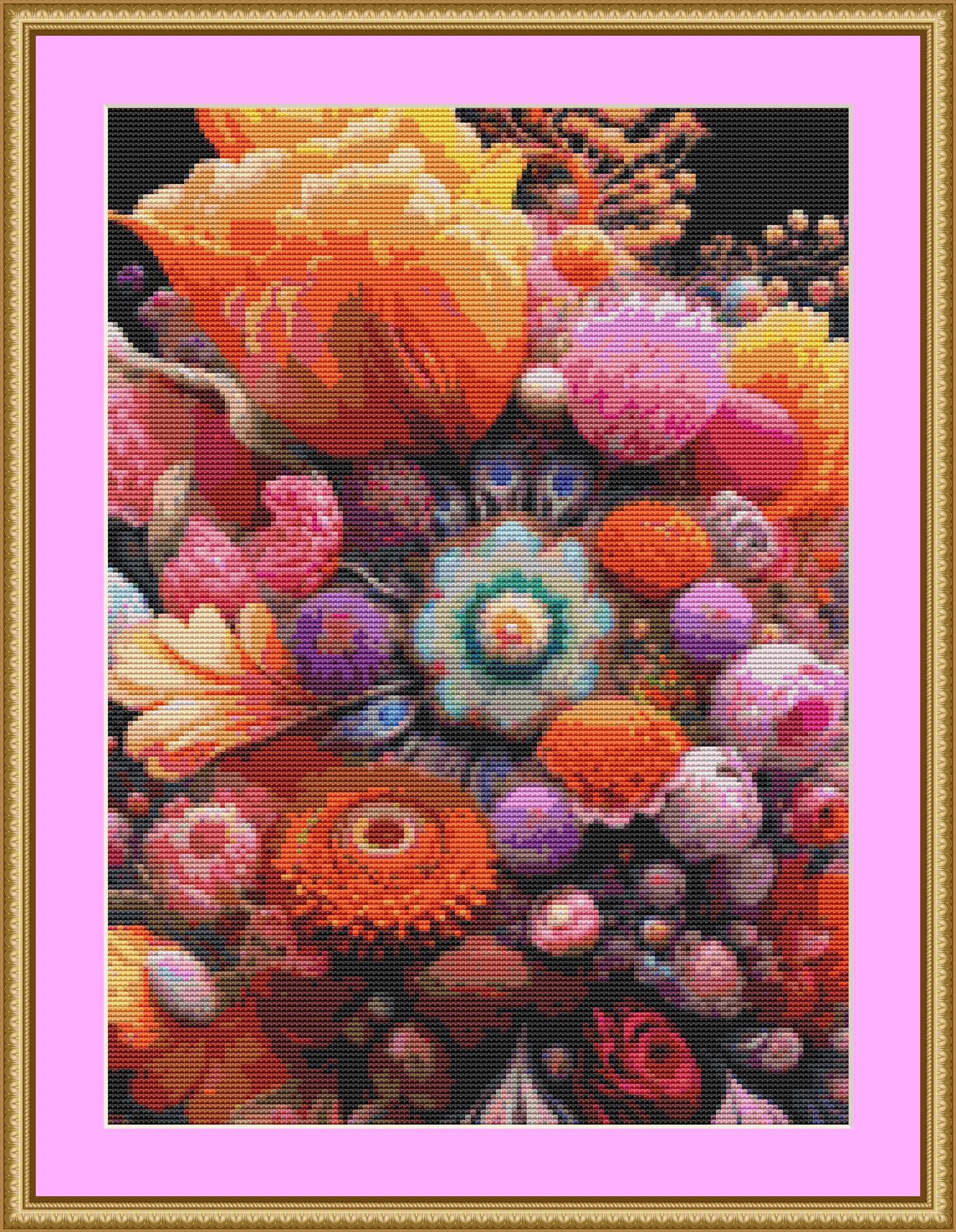 This cross stitch pattern depicts a picture of some beautiful coloured flowers.