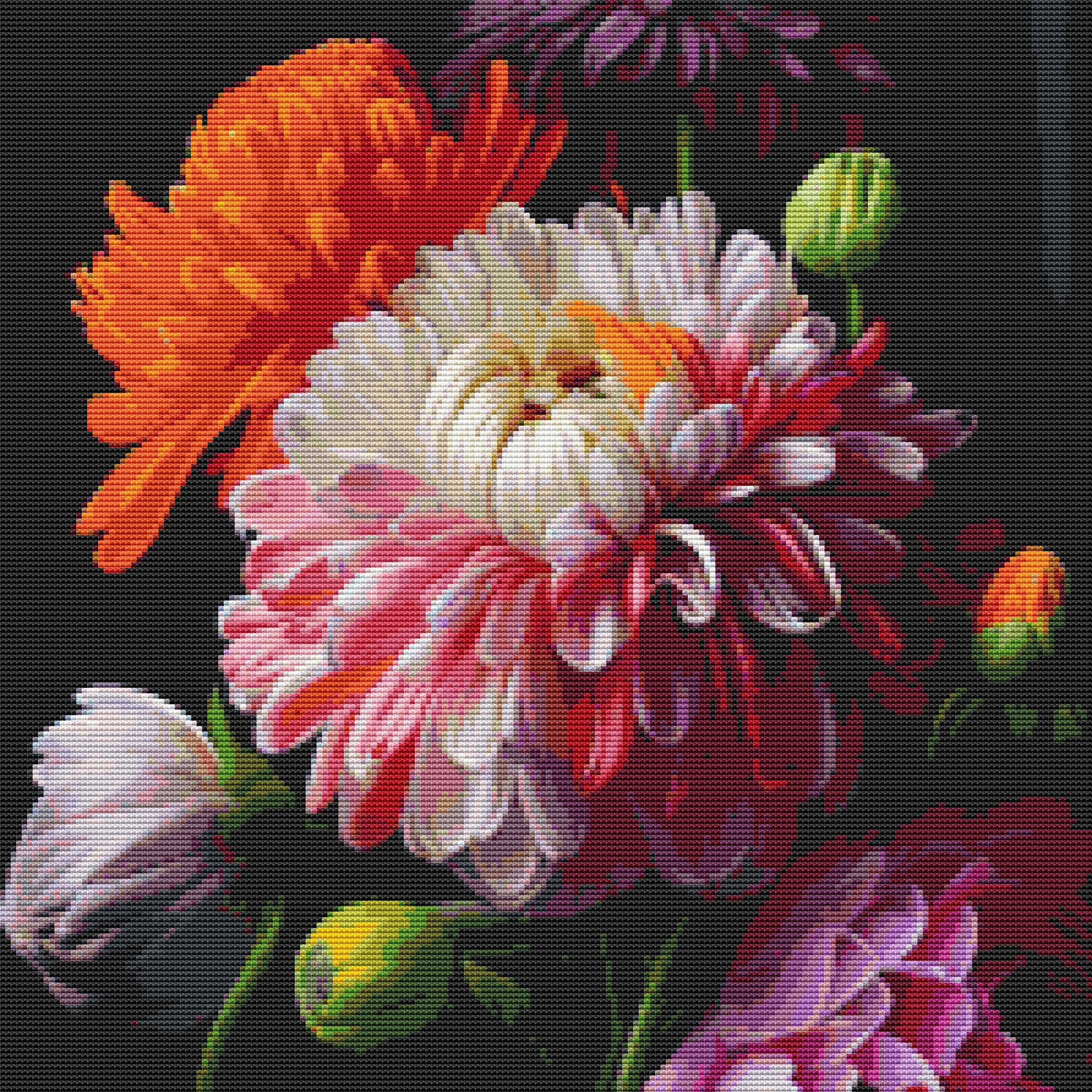This cross stitch pattern depicts a picture of some beautiful chrysanthemum flowers.