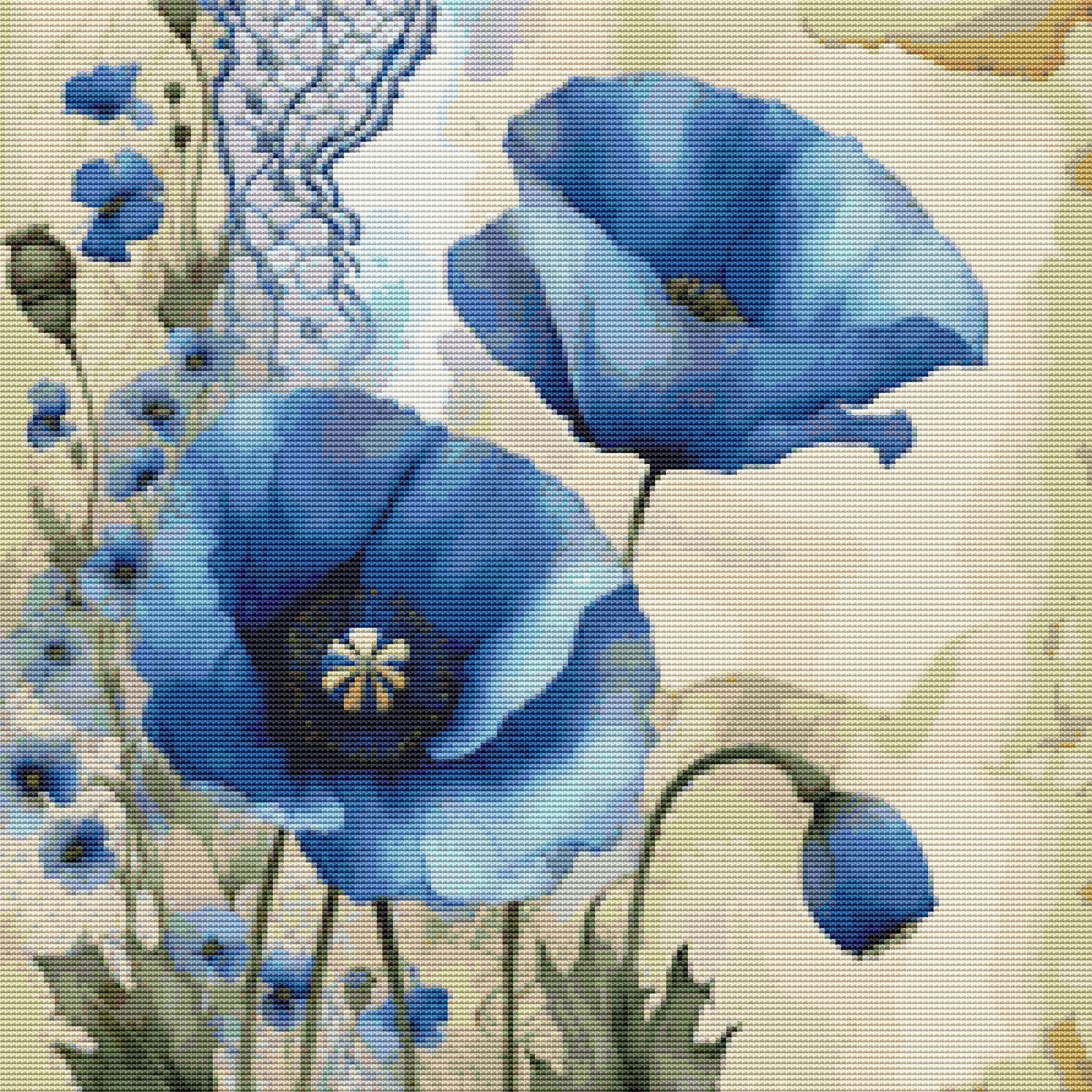 This cross stitch pattern depicts a picture of some beautiful blue poppy flowers.