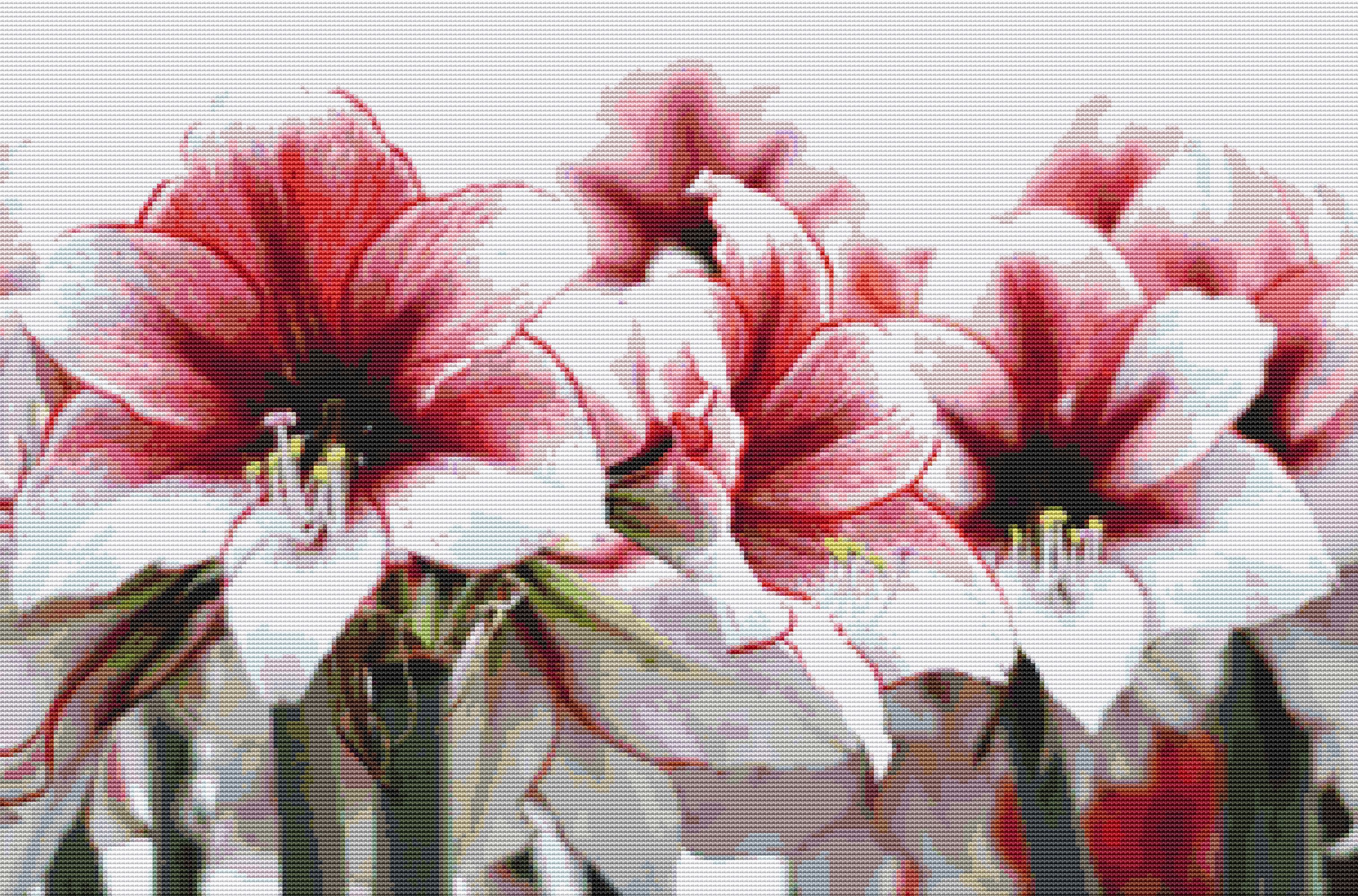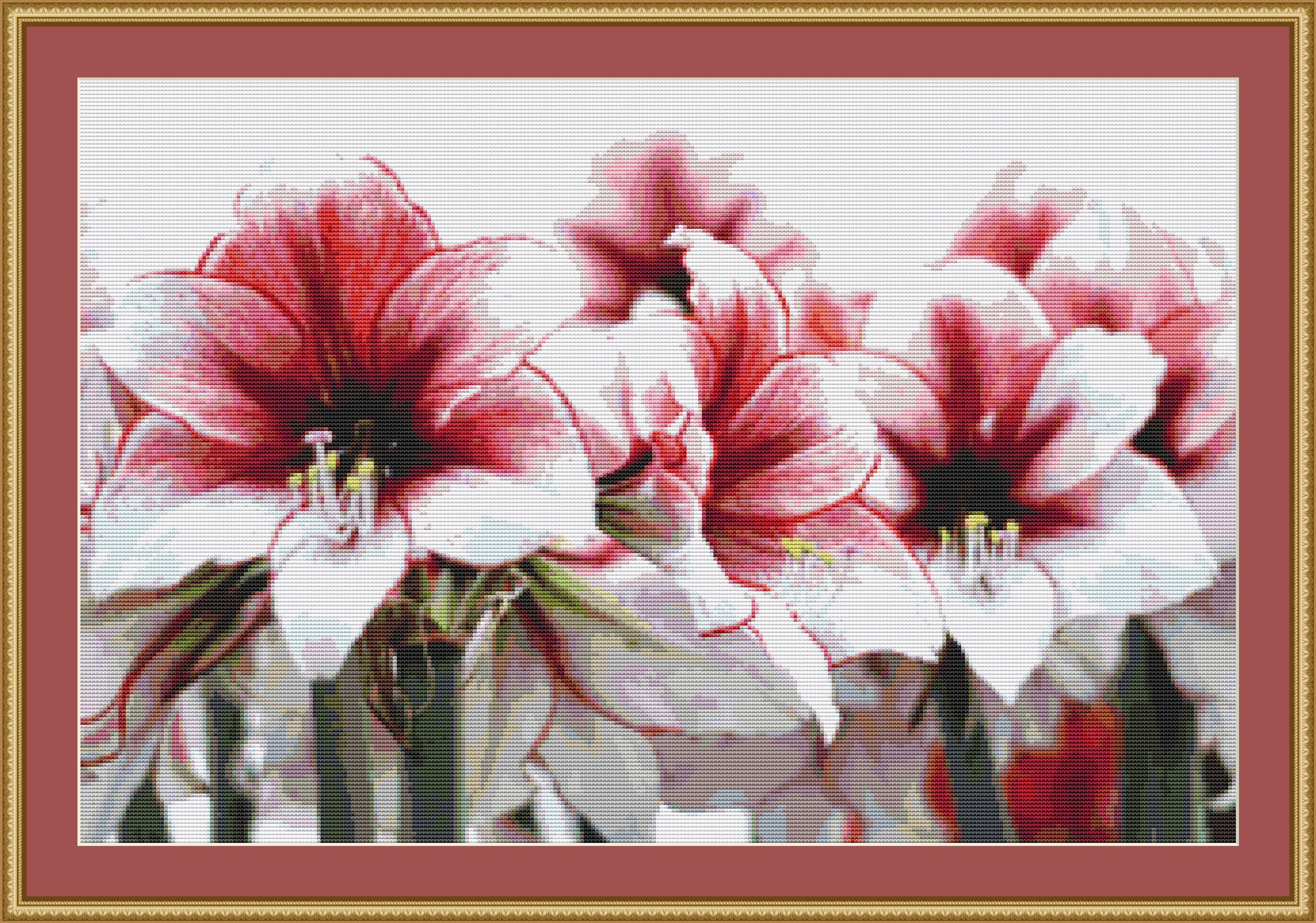 This cross stitch pattern depicts a picture of some beautiful amaryllis flowers.