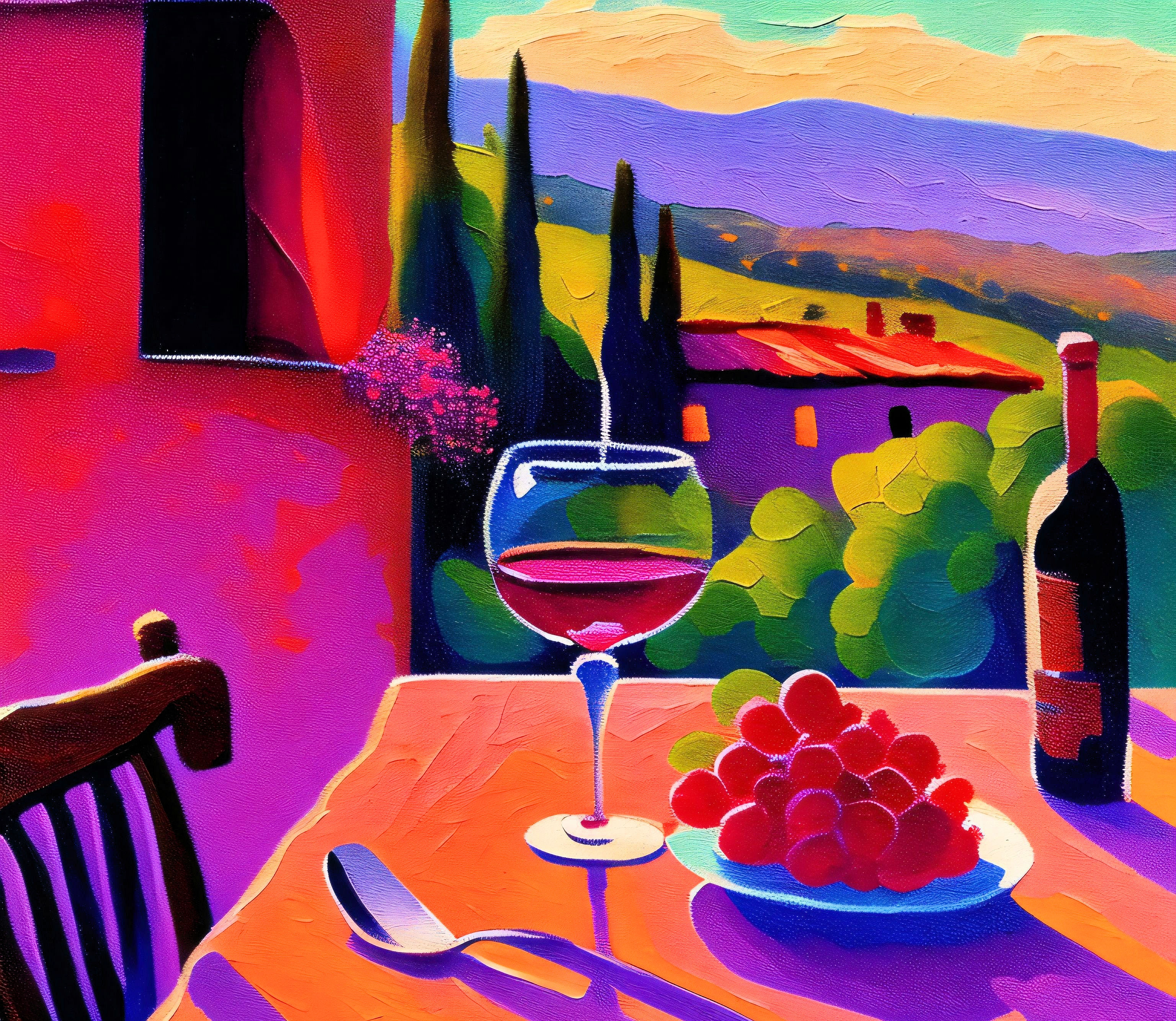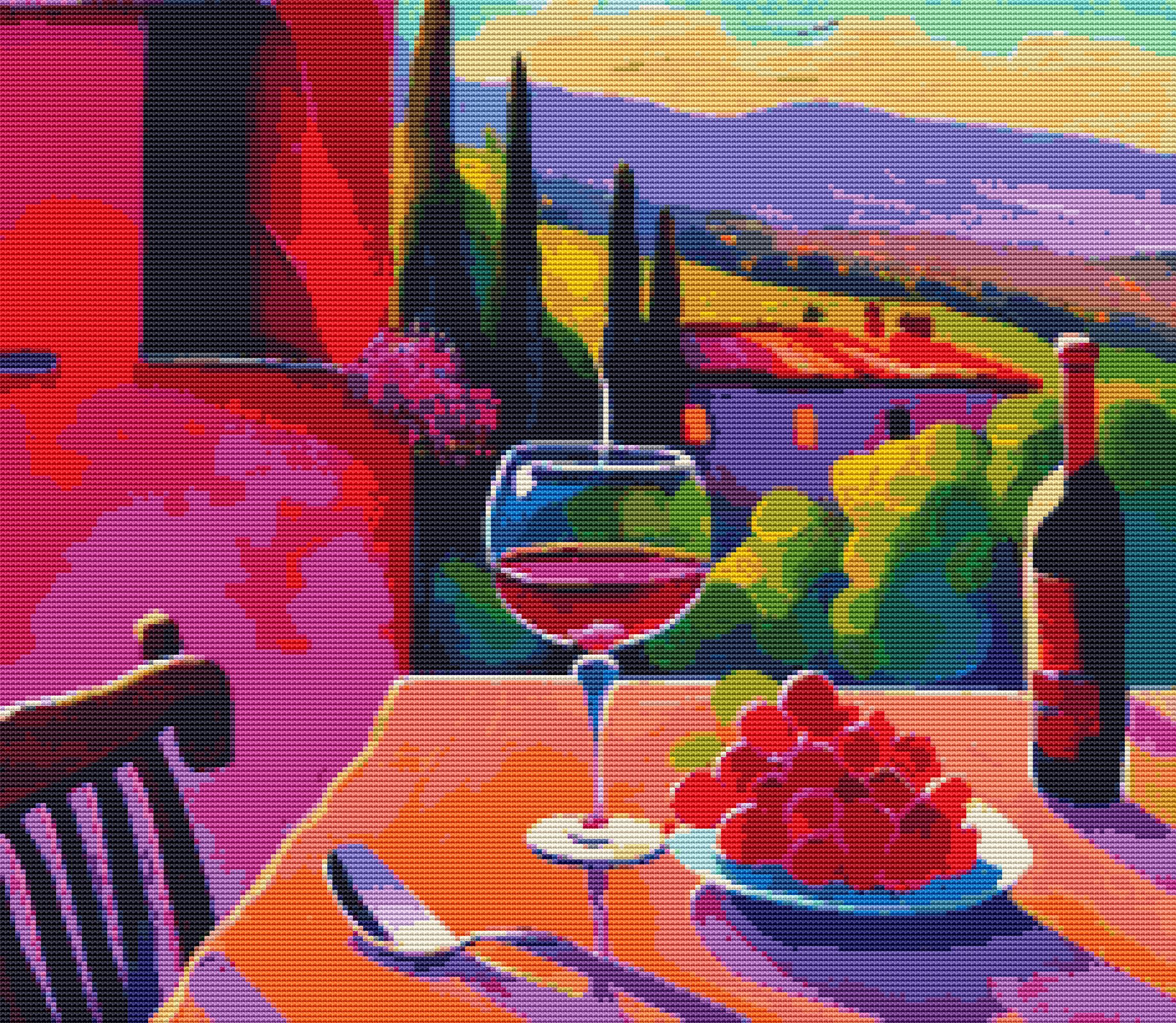 This cross stitch pattern depicts a picture of a view of the Tuscany countryside and a table with some red wine on it.