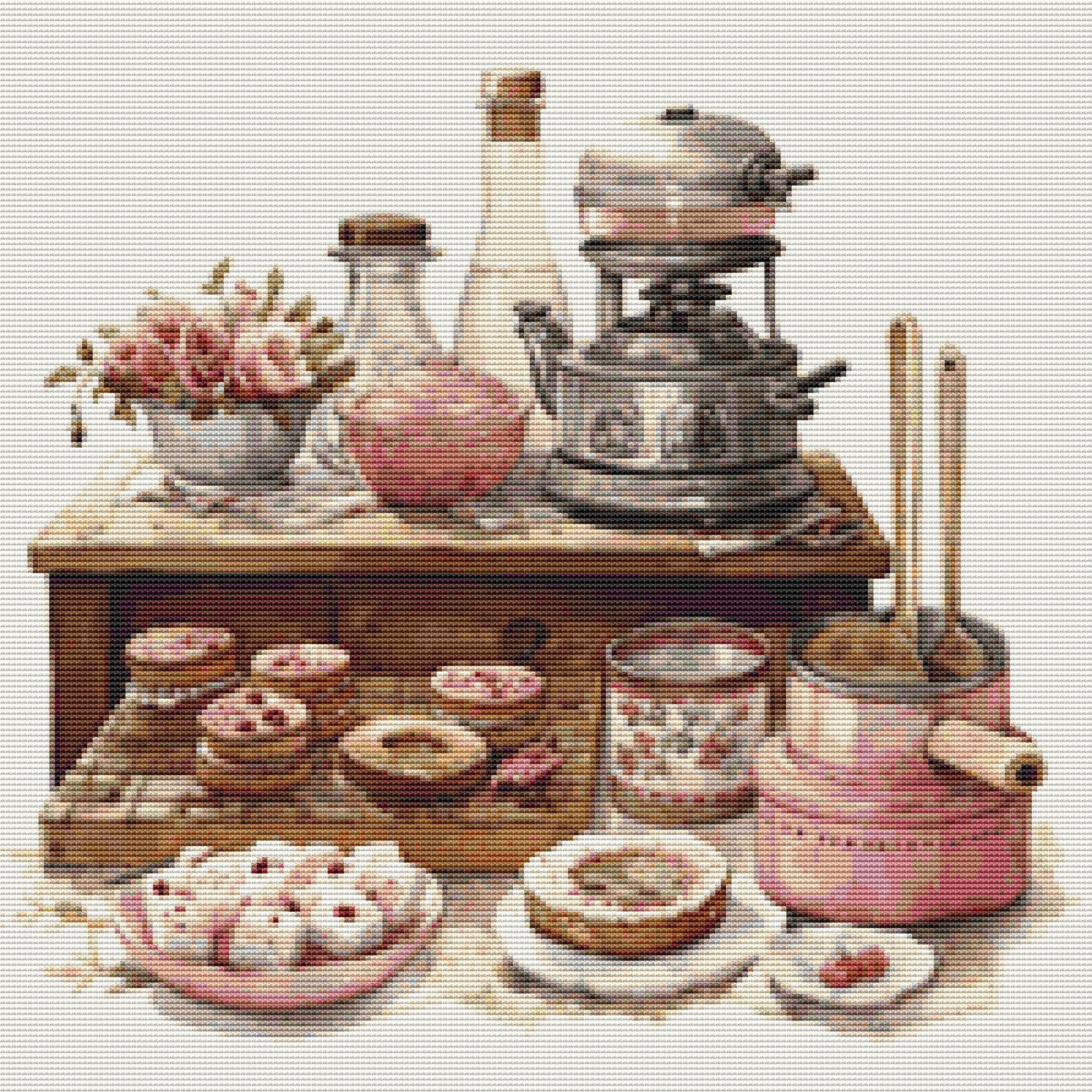 This cross stitch pattern depicts a picture of some delicious looking cakes.