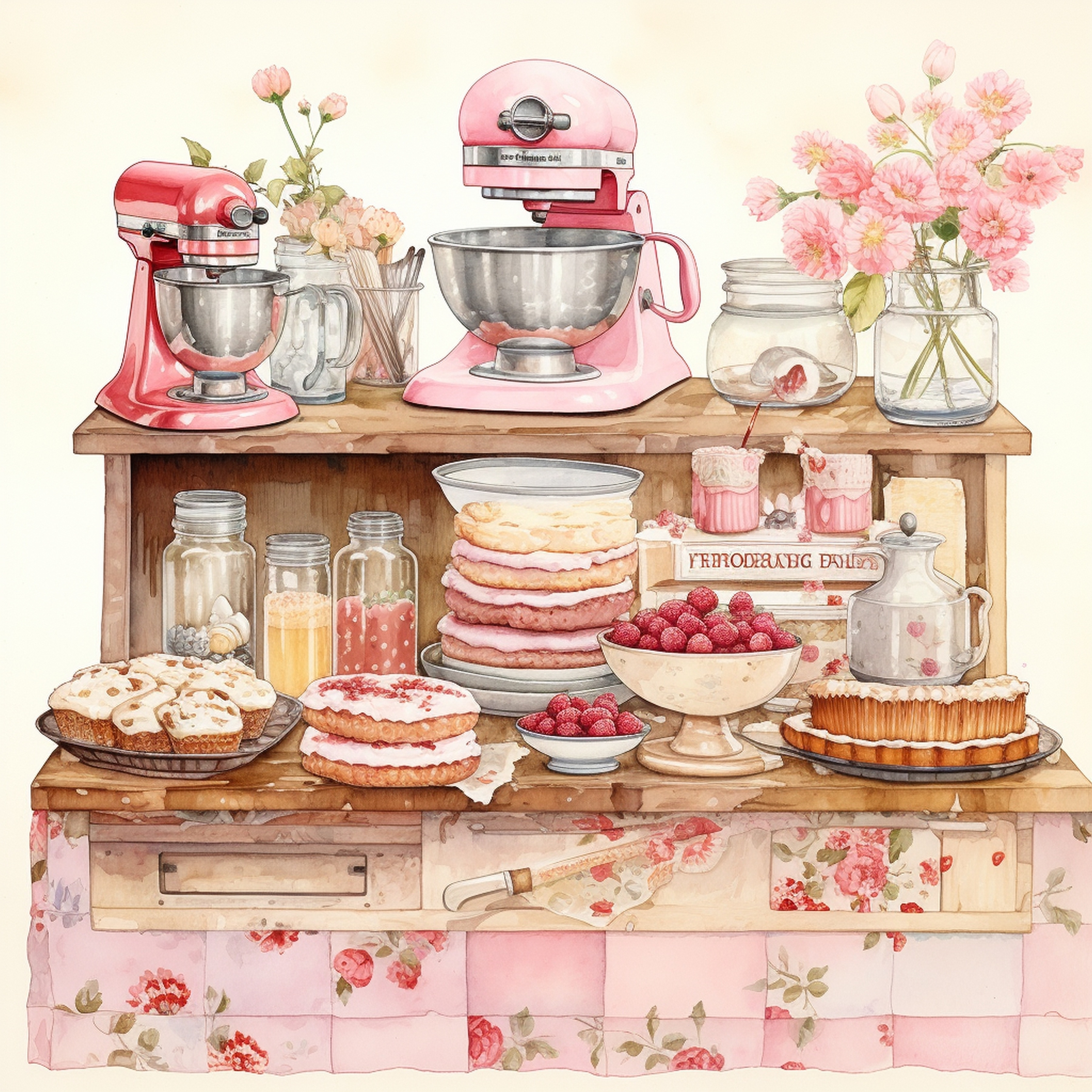 This cross stitch pattern depicts a picture of a beautiful kitchen cabinet with some tasty desserts.
