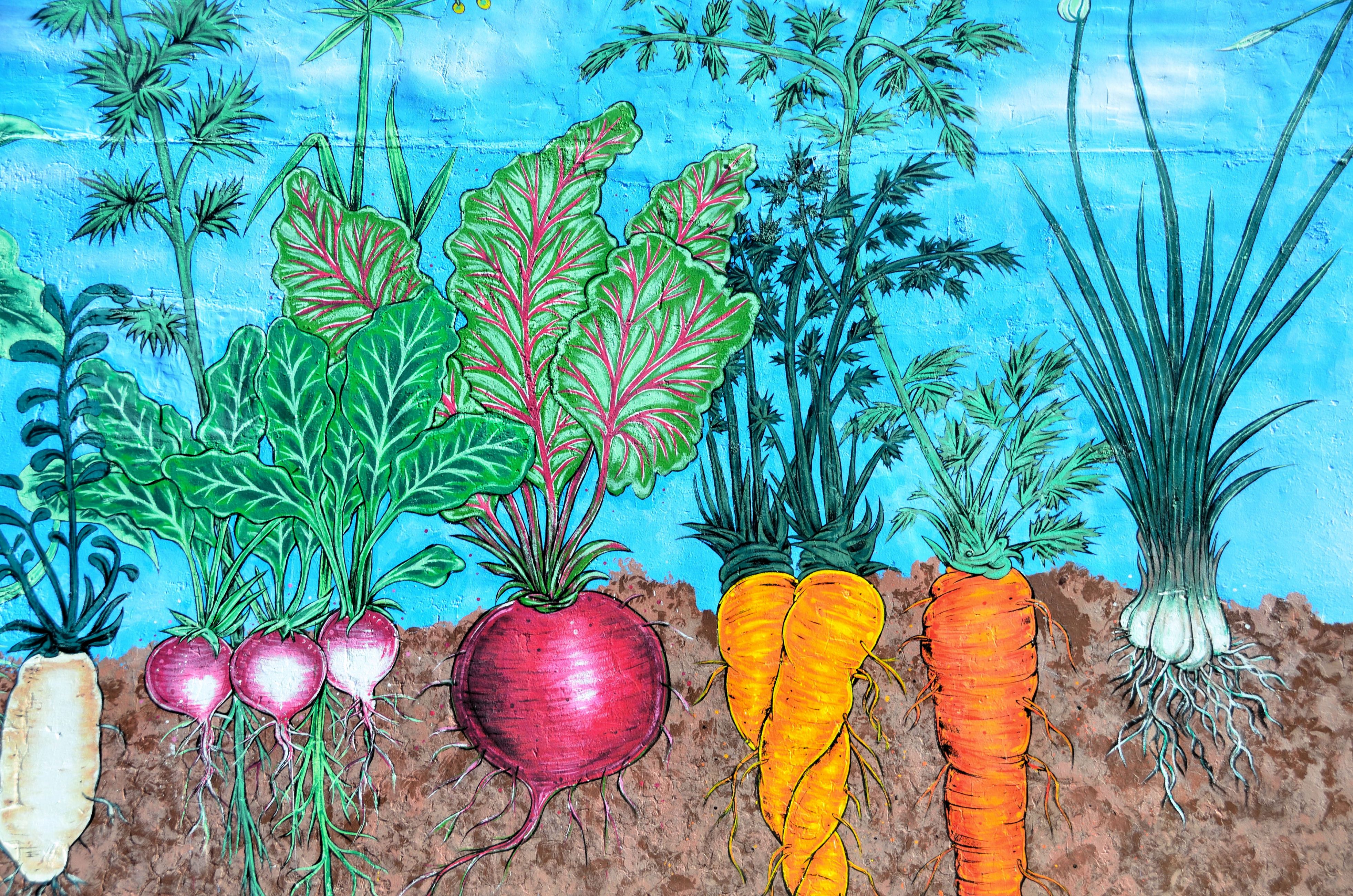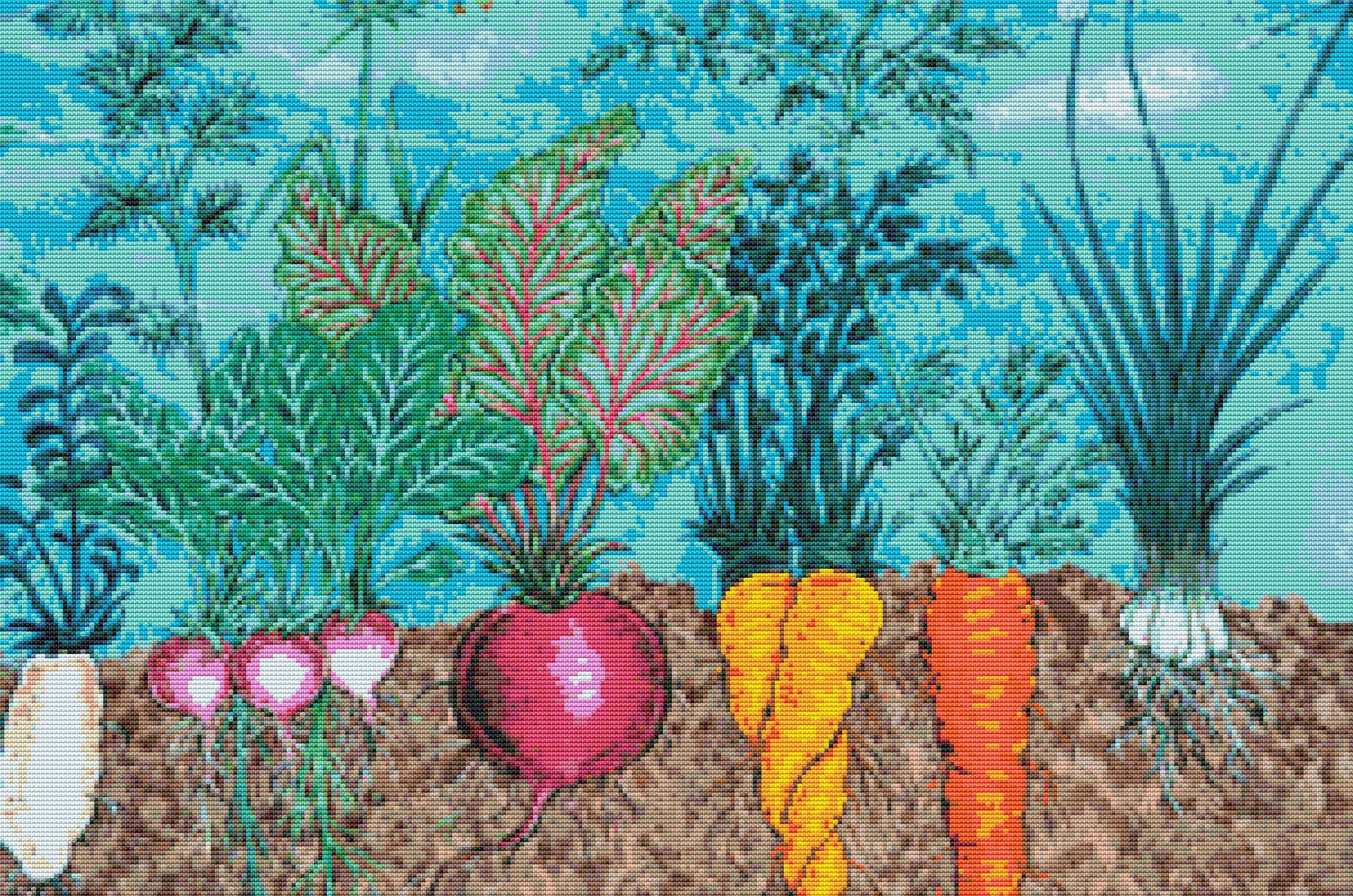 This cross stitch pattern depicts a picture of some delicious root vegetables in the ground.