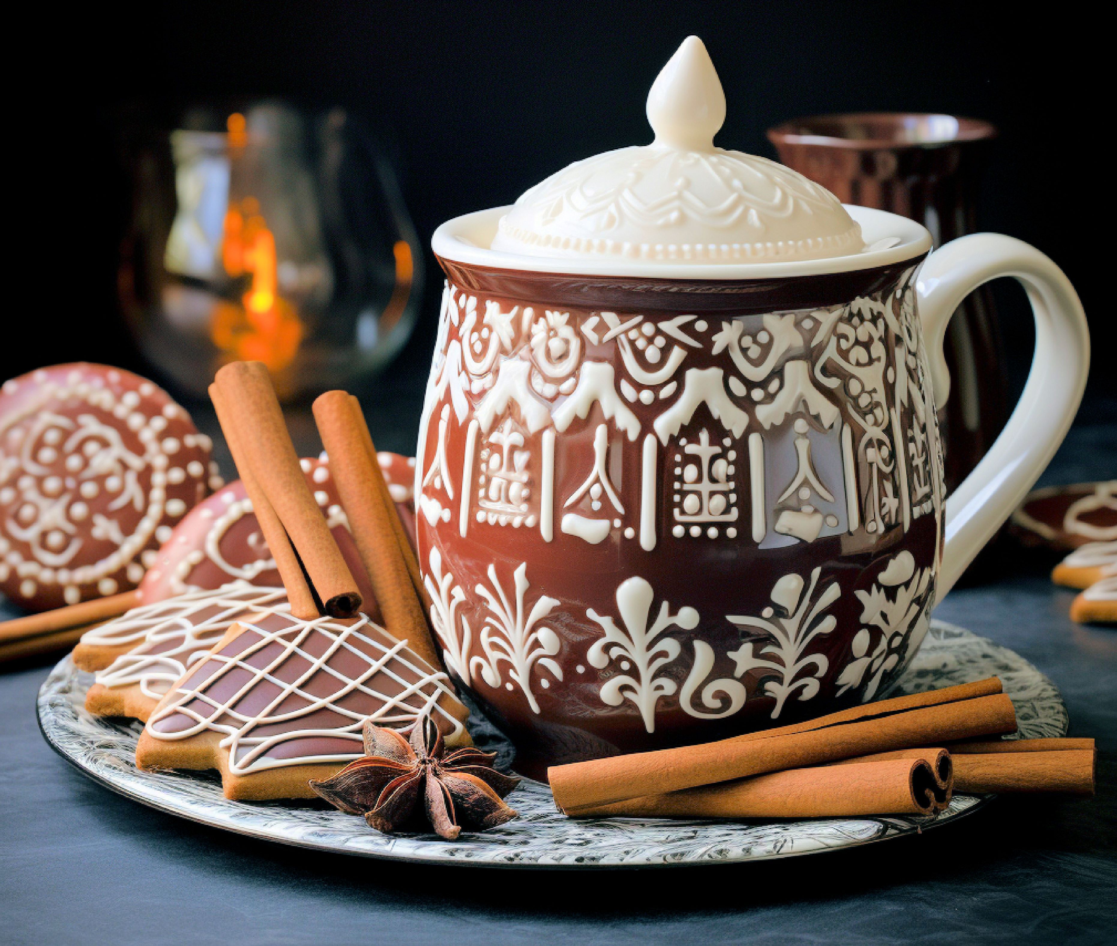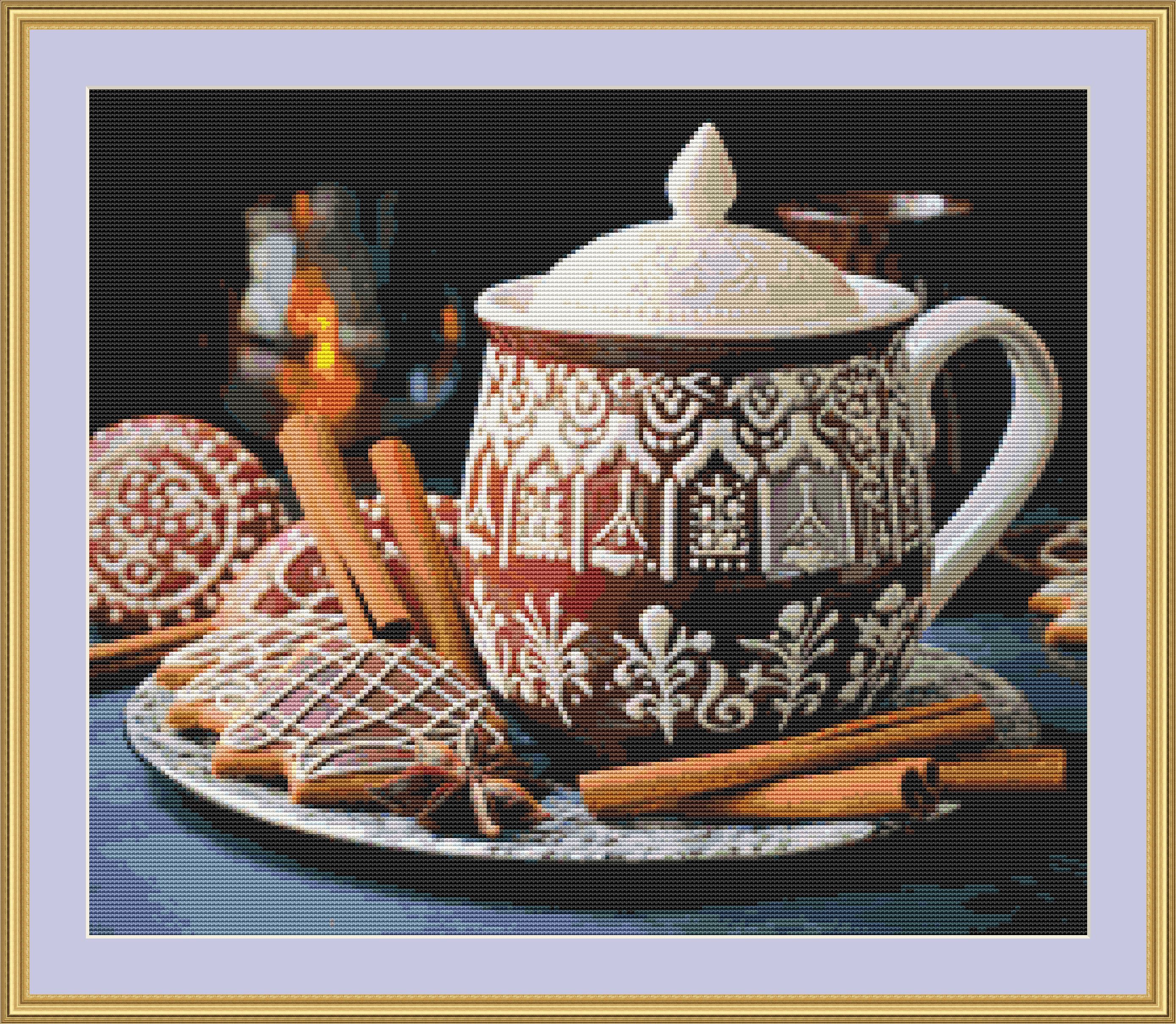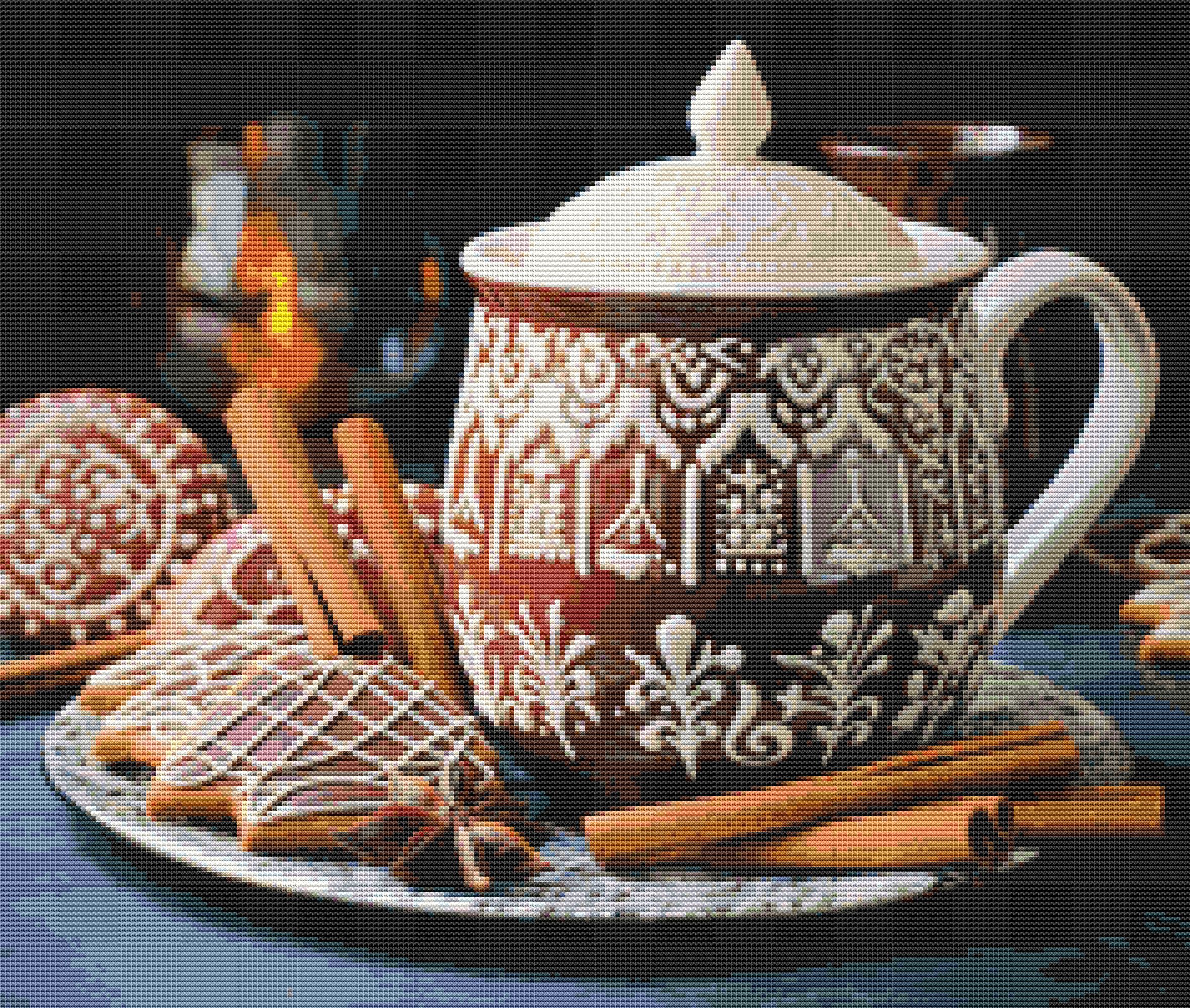 This cross stitch pattern depicts a picture of an elegant cup of hot chocolate and cookies.