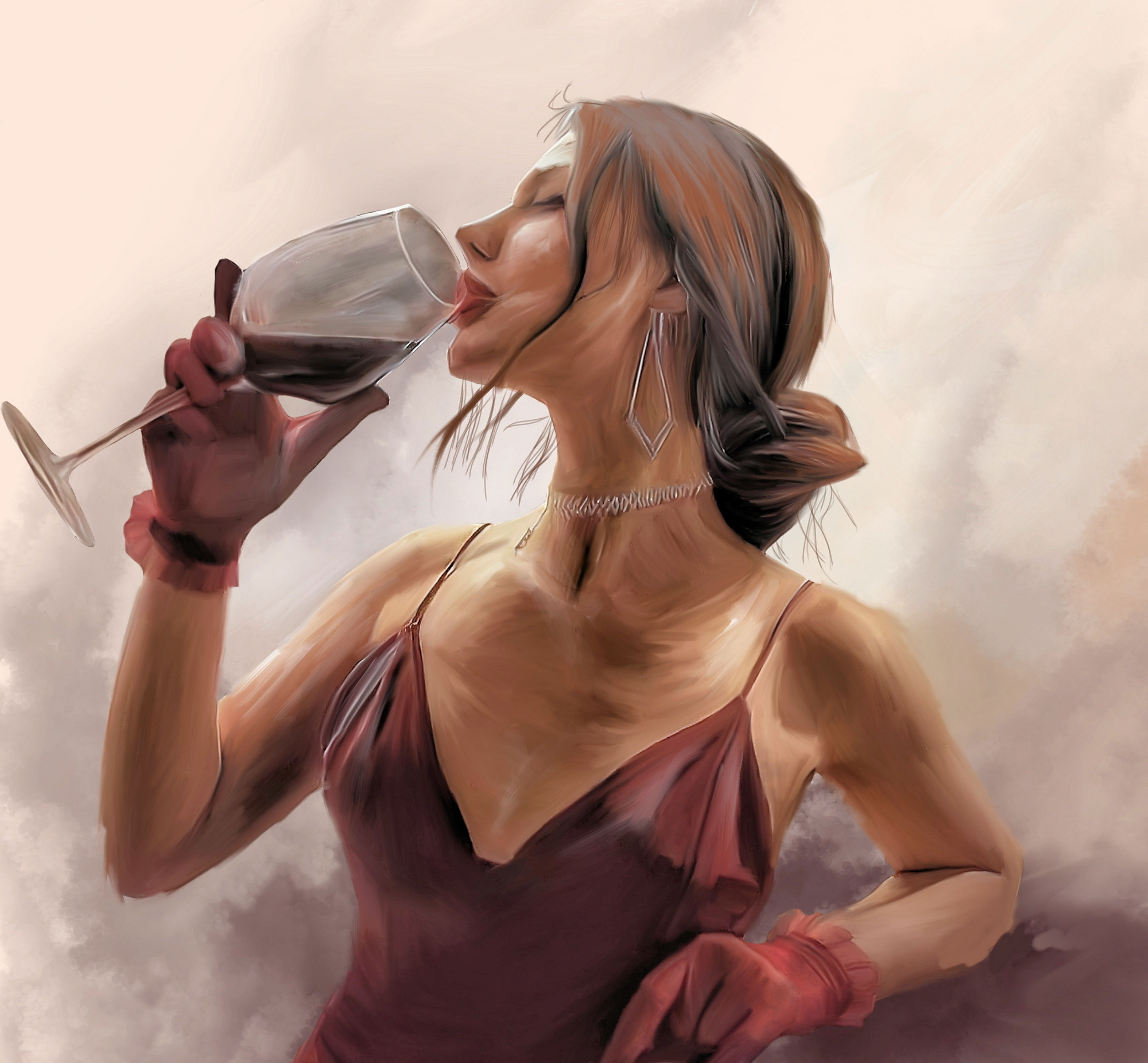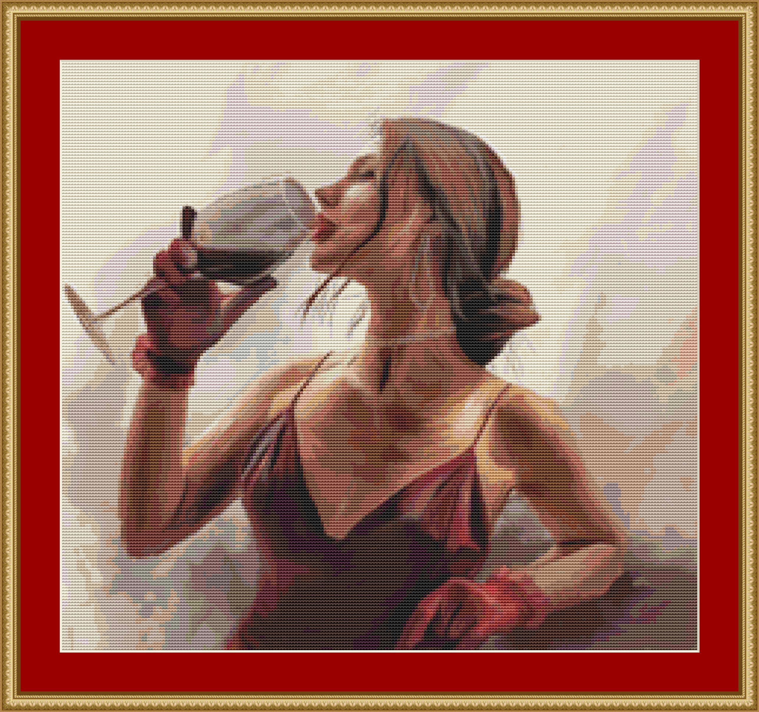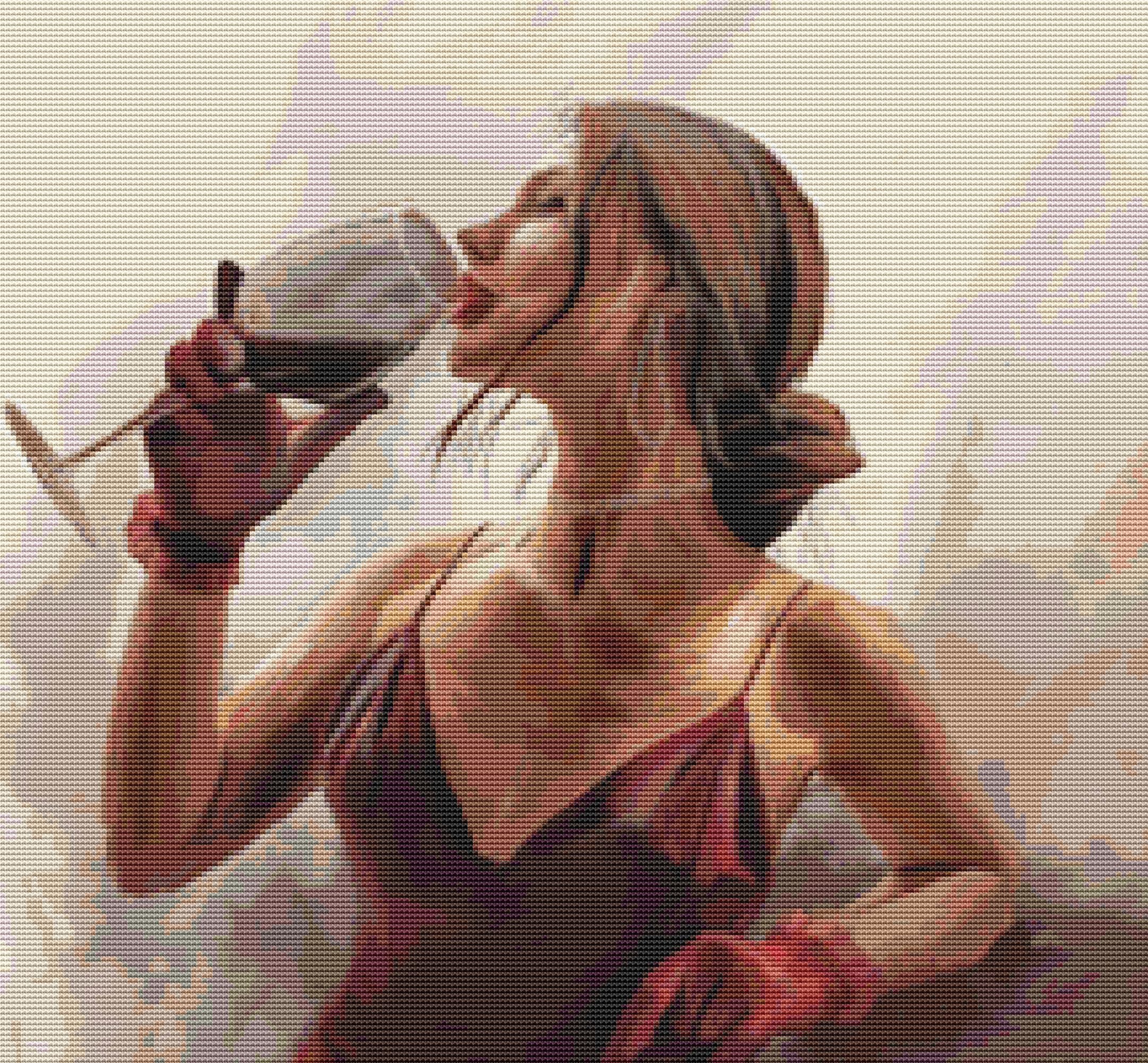 This cross stitch pattern depicts a picture of a woman drinking a glass of red wine.