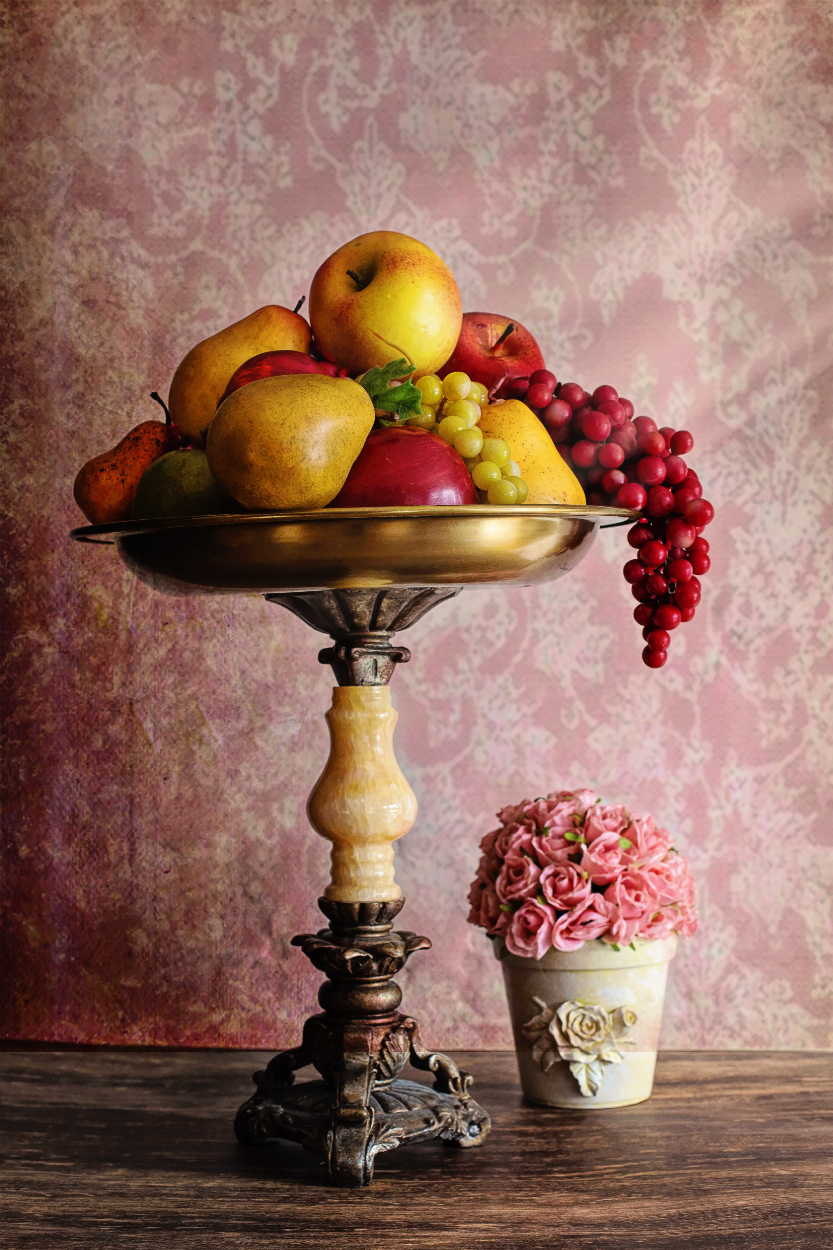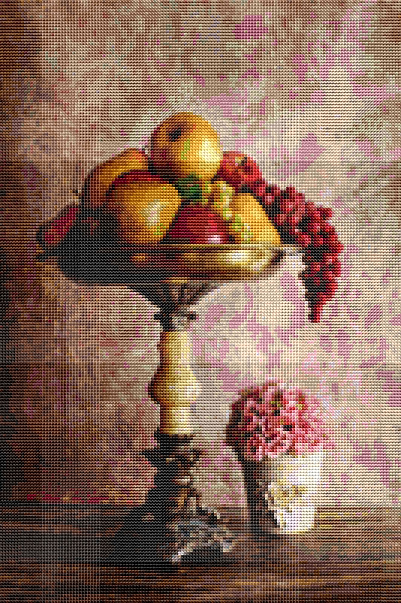 This cross stitch pattern depicts a picture of a still life of some fruit on a stand with a pot of flowers next to it.