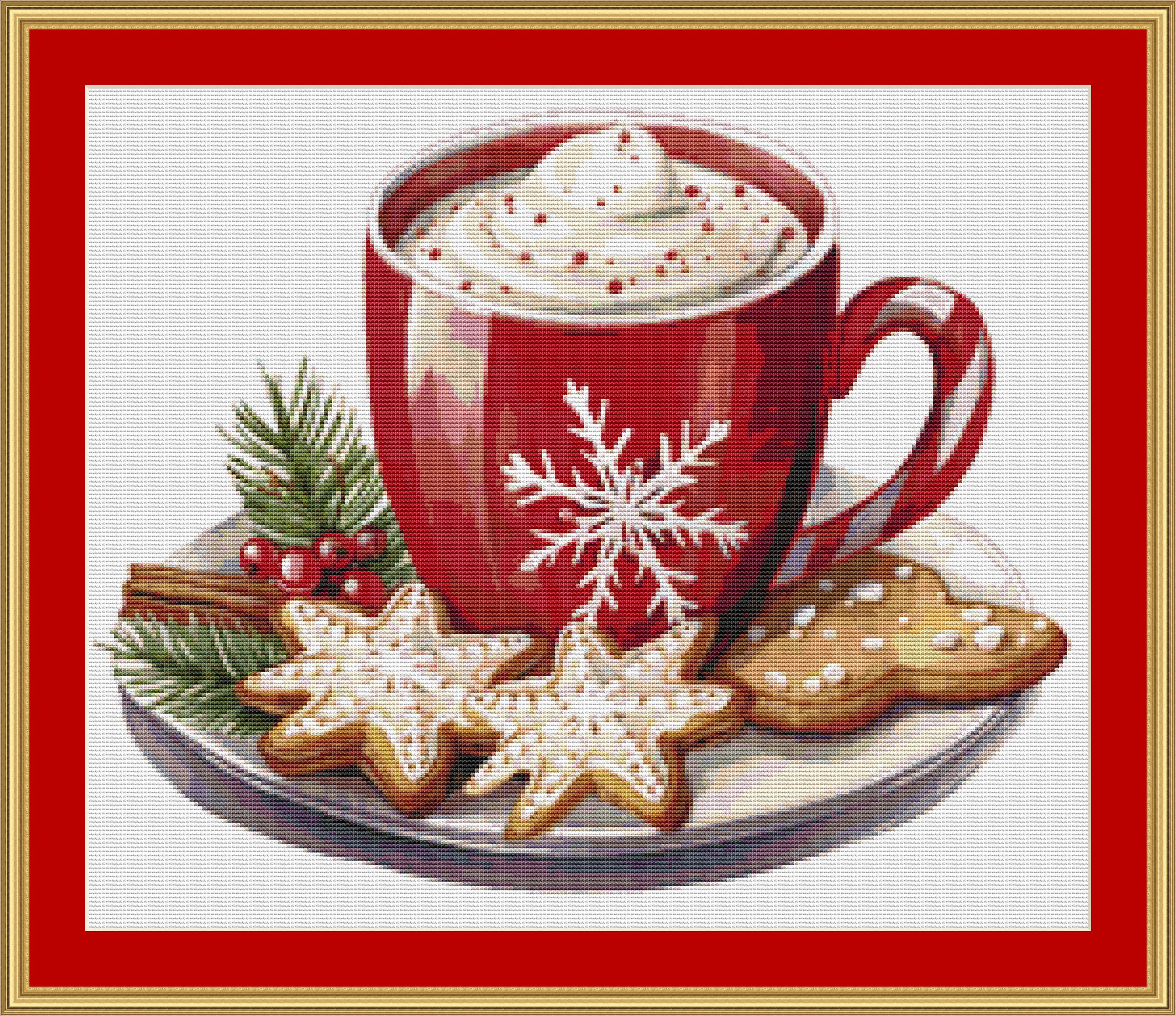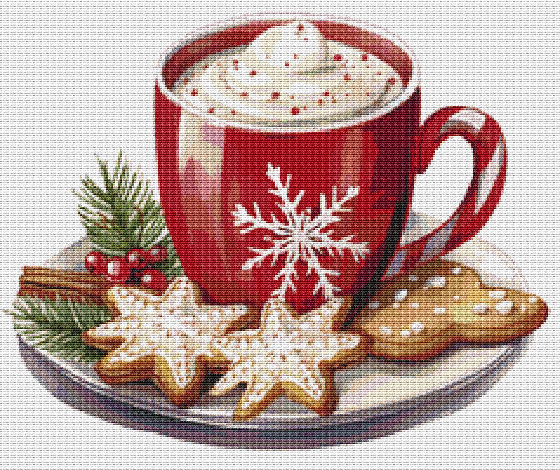 This cross stitch pattern depicts a picture of a warm cocoa drink and Christmas cookies.