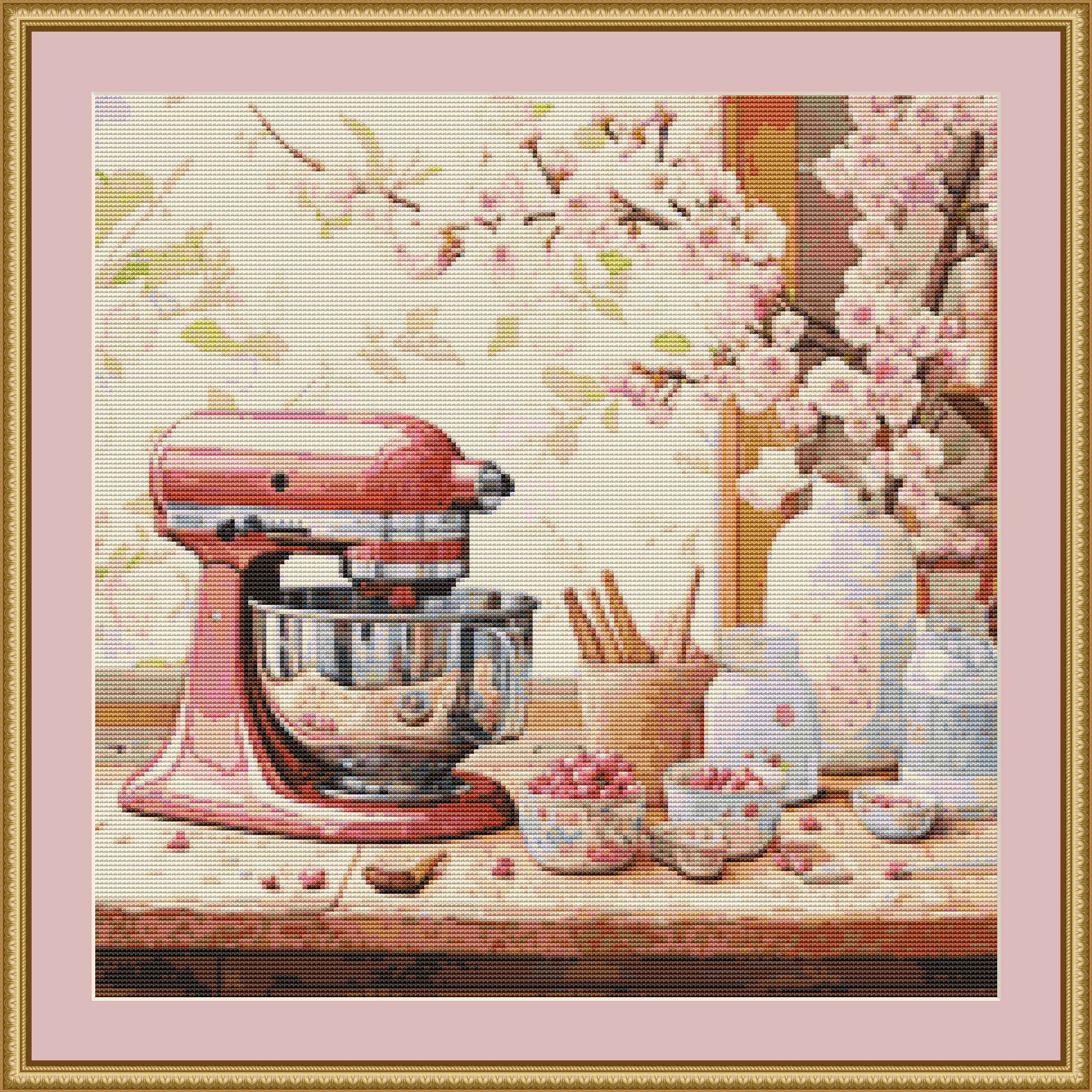 This cross stitch pattern depicts a picture of a pink cake mixer ready to start work.
