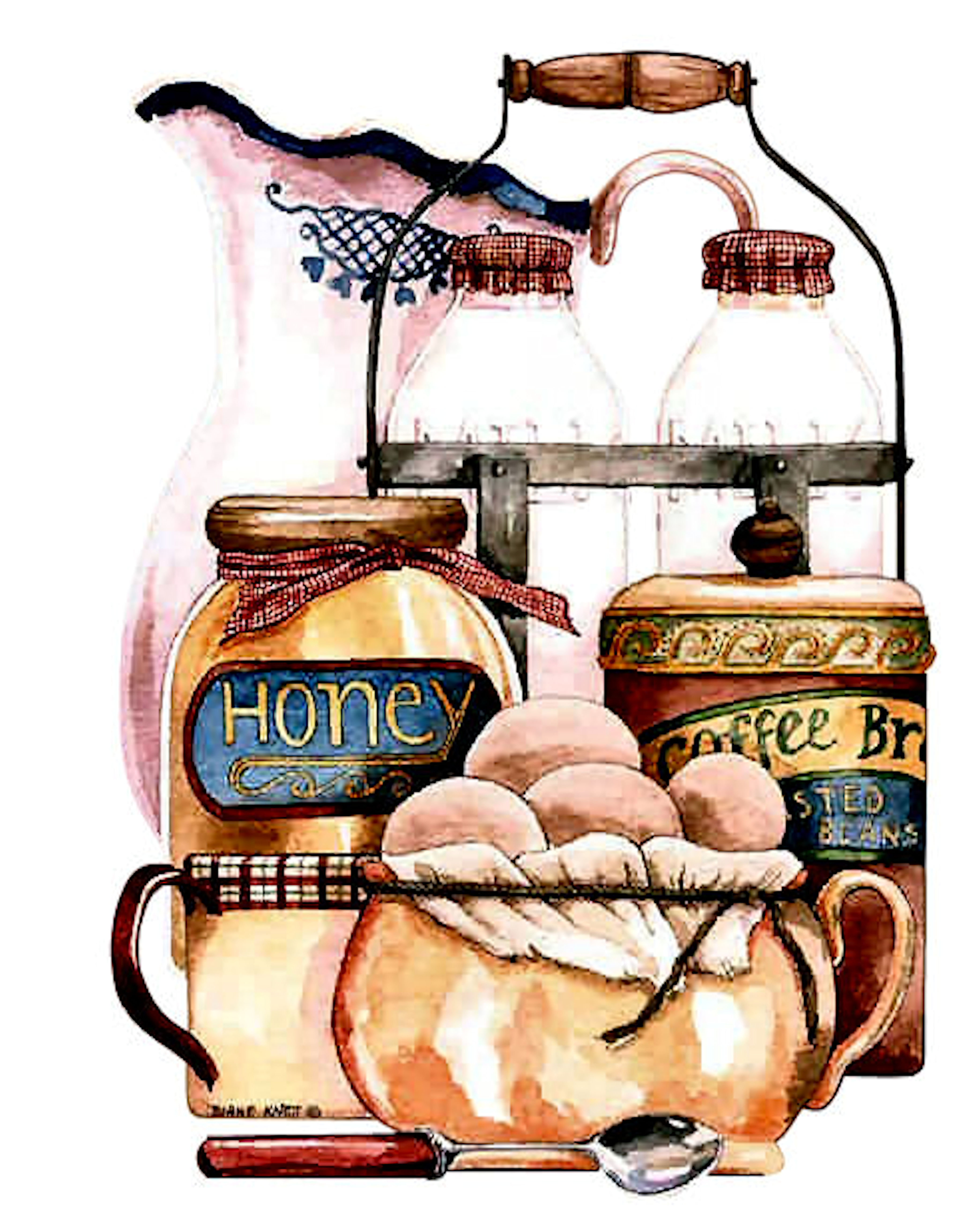This cross stitch pattern depicts a picture of some eggs in a basket and some bottles of milk.