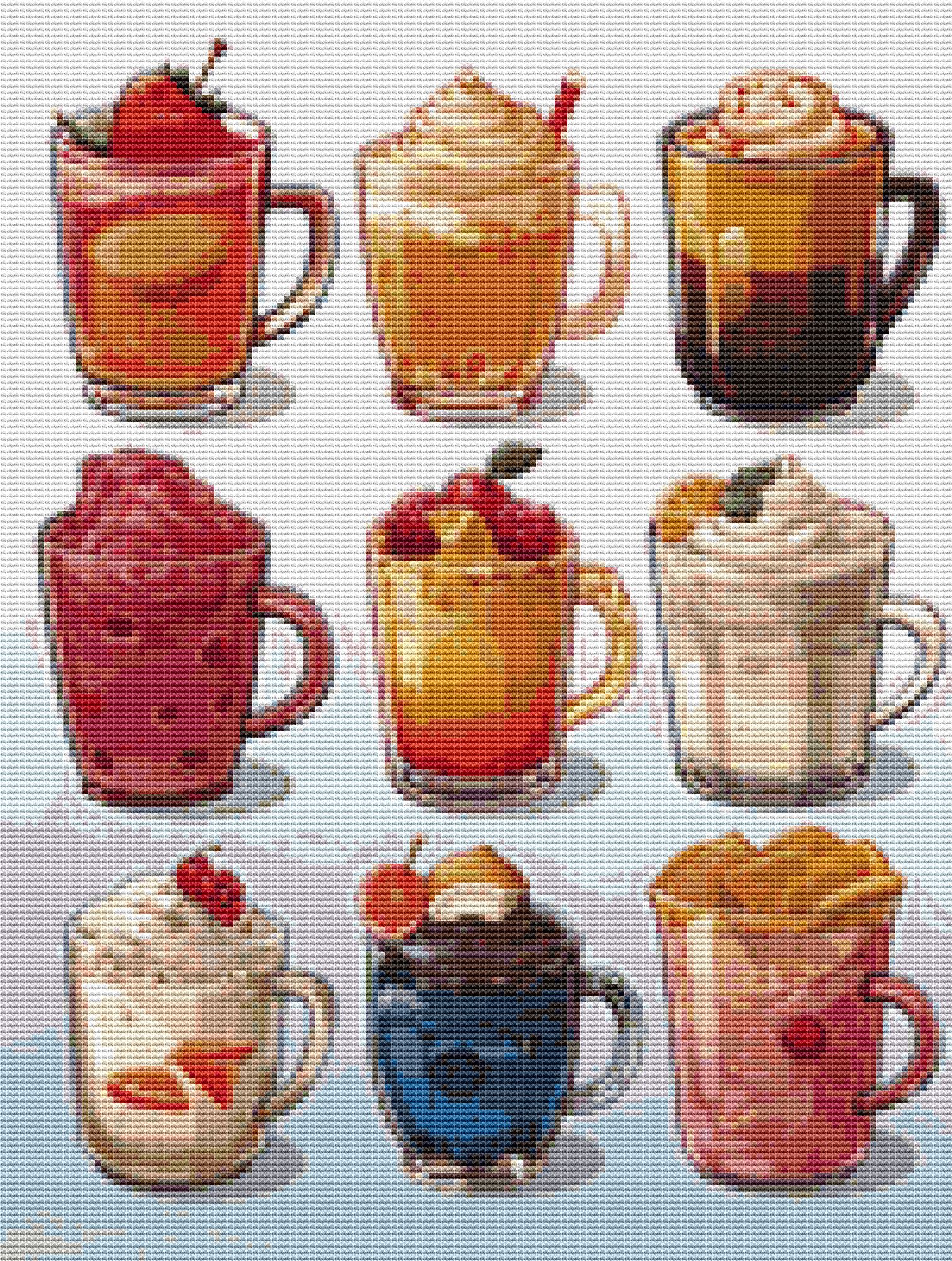 This cross stitch pattern depicts a picture of different coloured glass mugs.