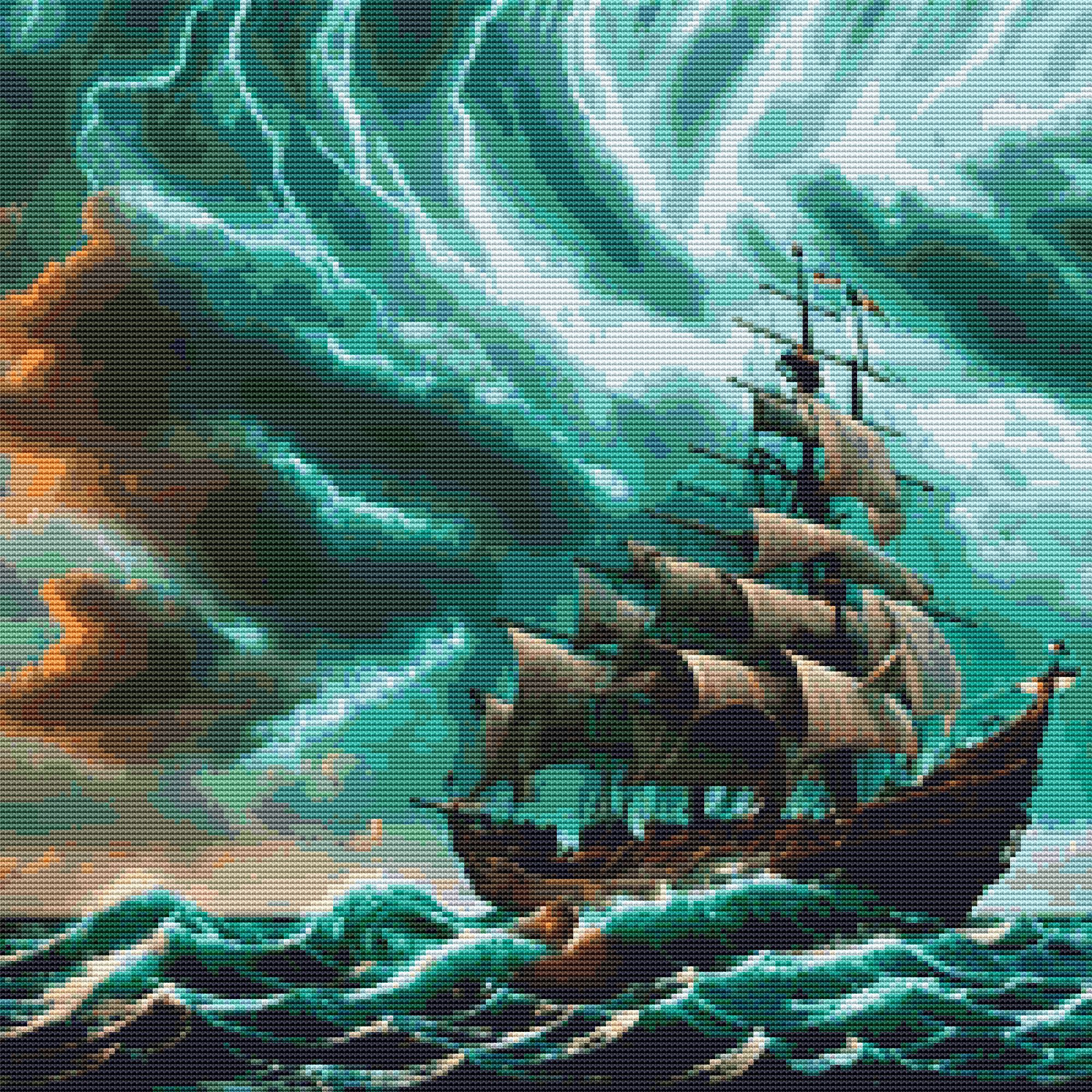 This cross stitch pattern depicts a picture of a ship at sea in the middle of a thunder storm.