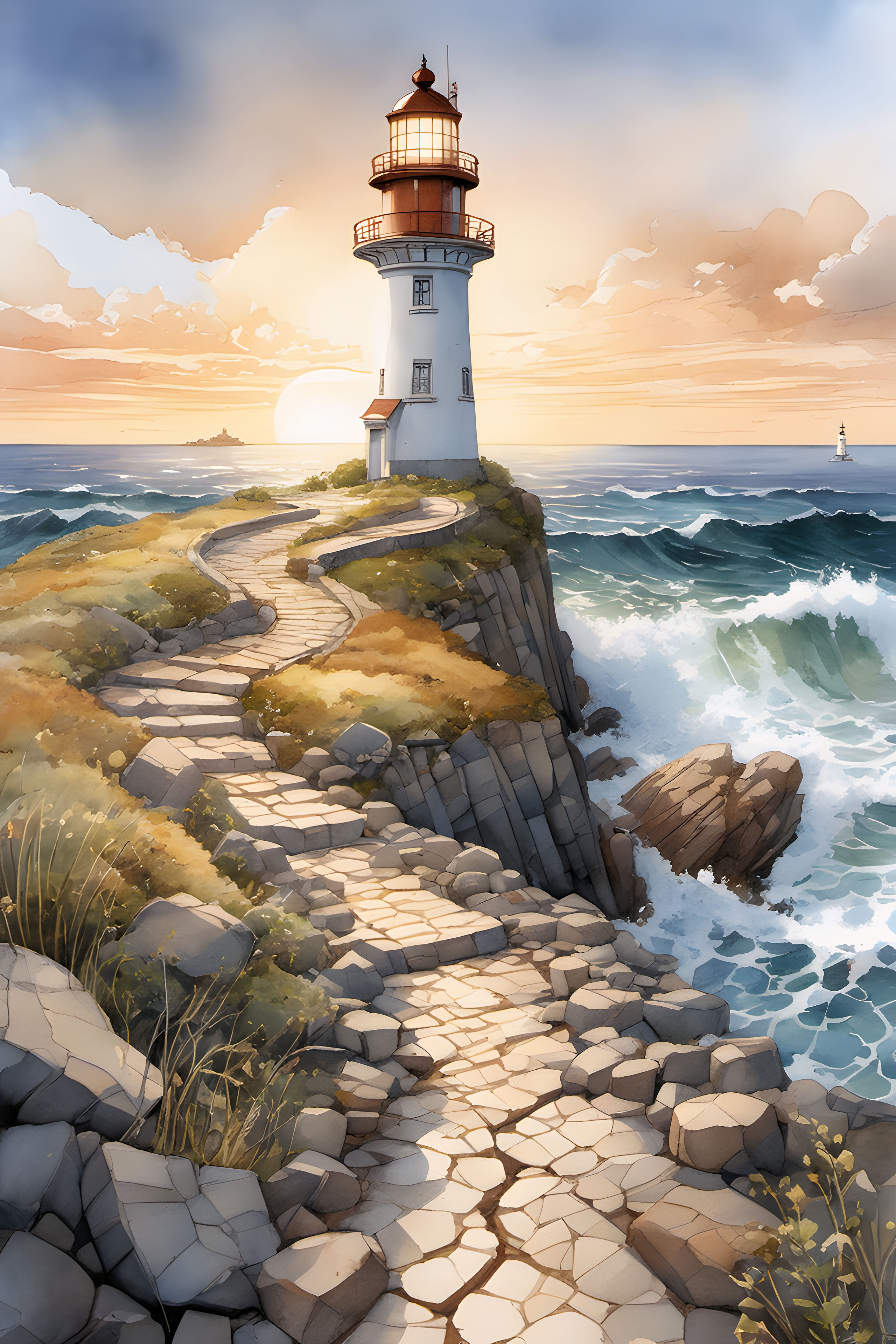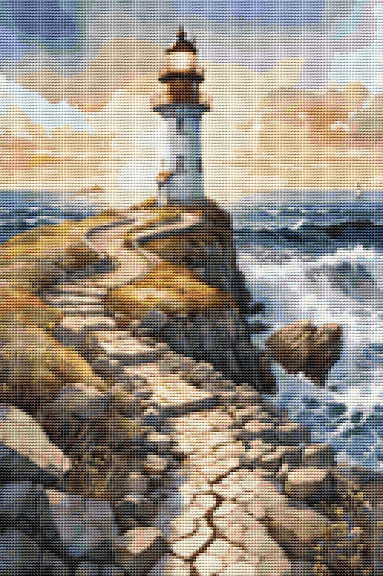 This cross stitch pattern depicts a picture of a lighthouse with one in the distance.
