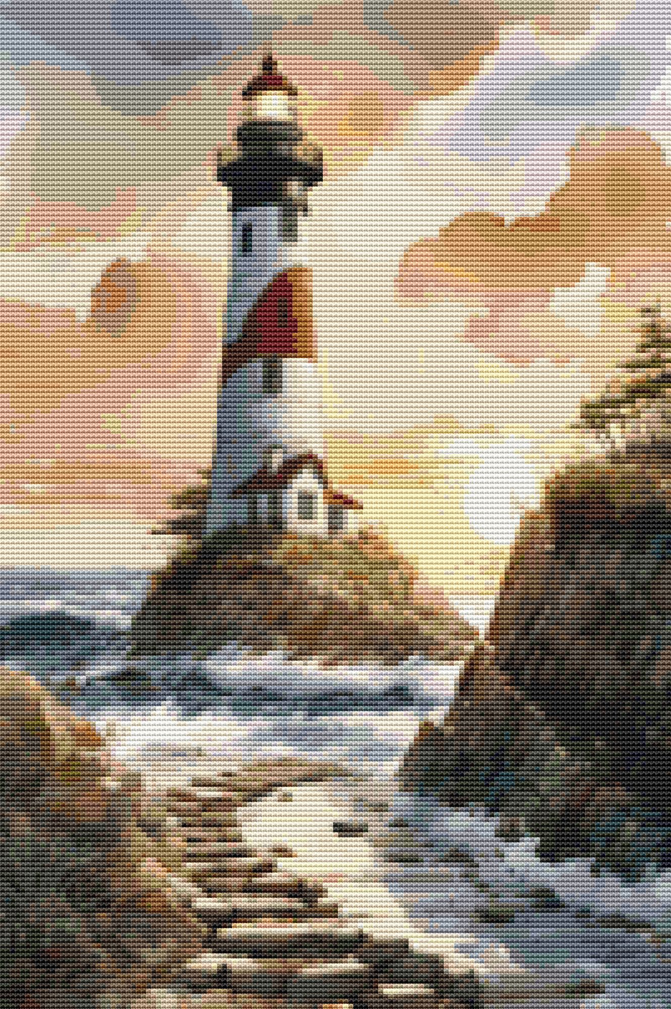 This cross stitch pattern depicts a picture of a lighthouse on a rock.