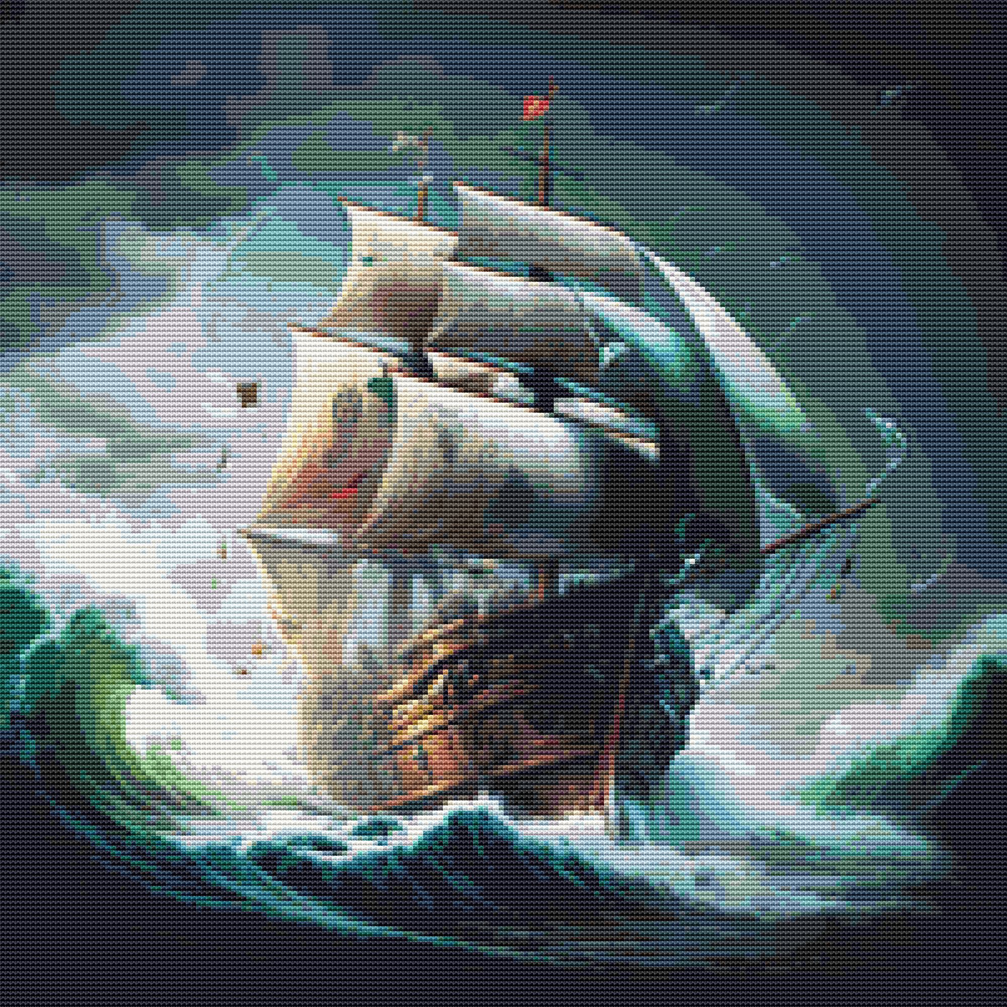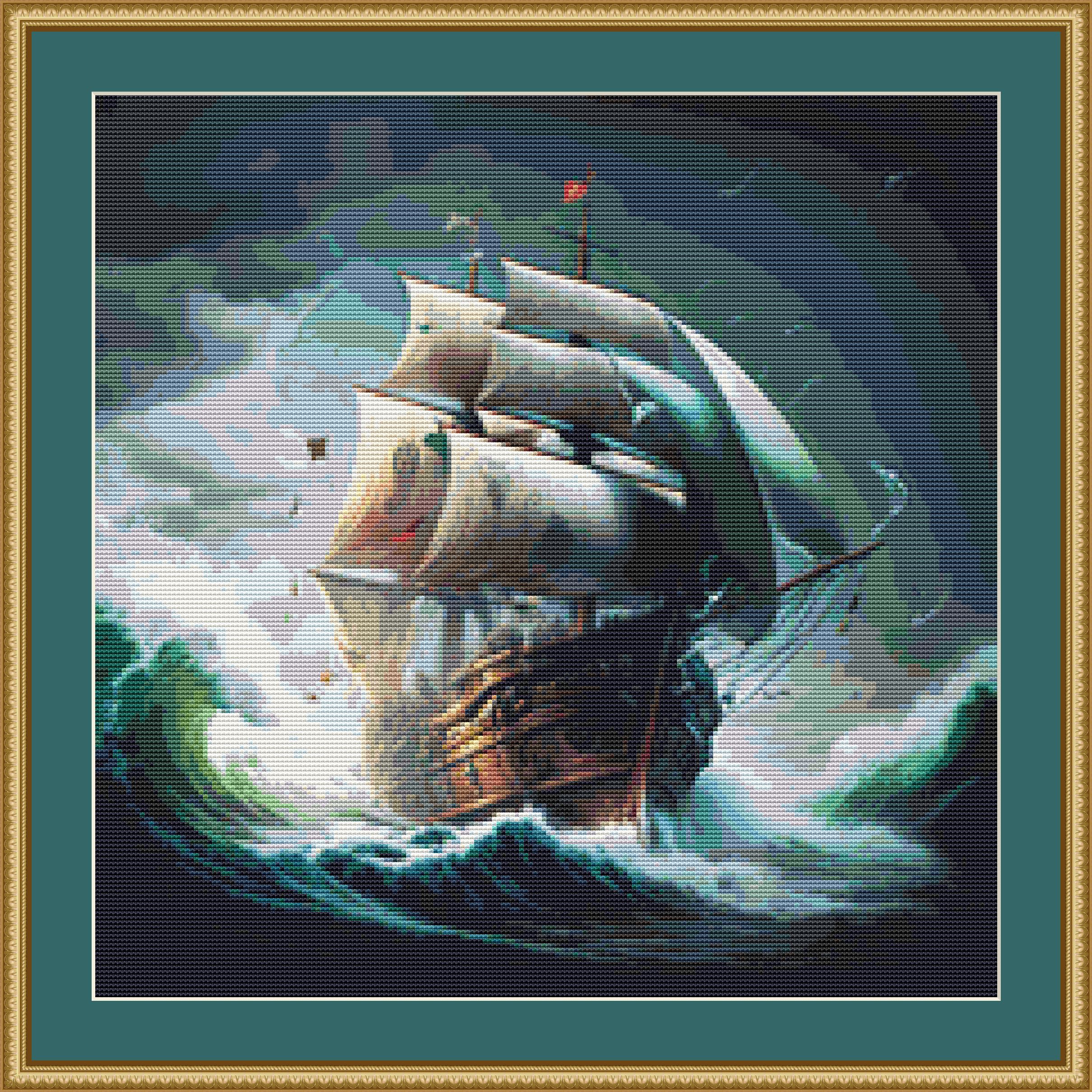 This cross stitch pattern depicts a beautiful ship with the sail out.