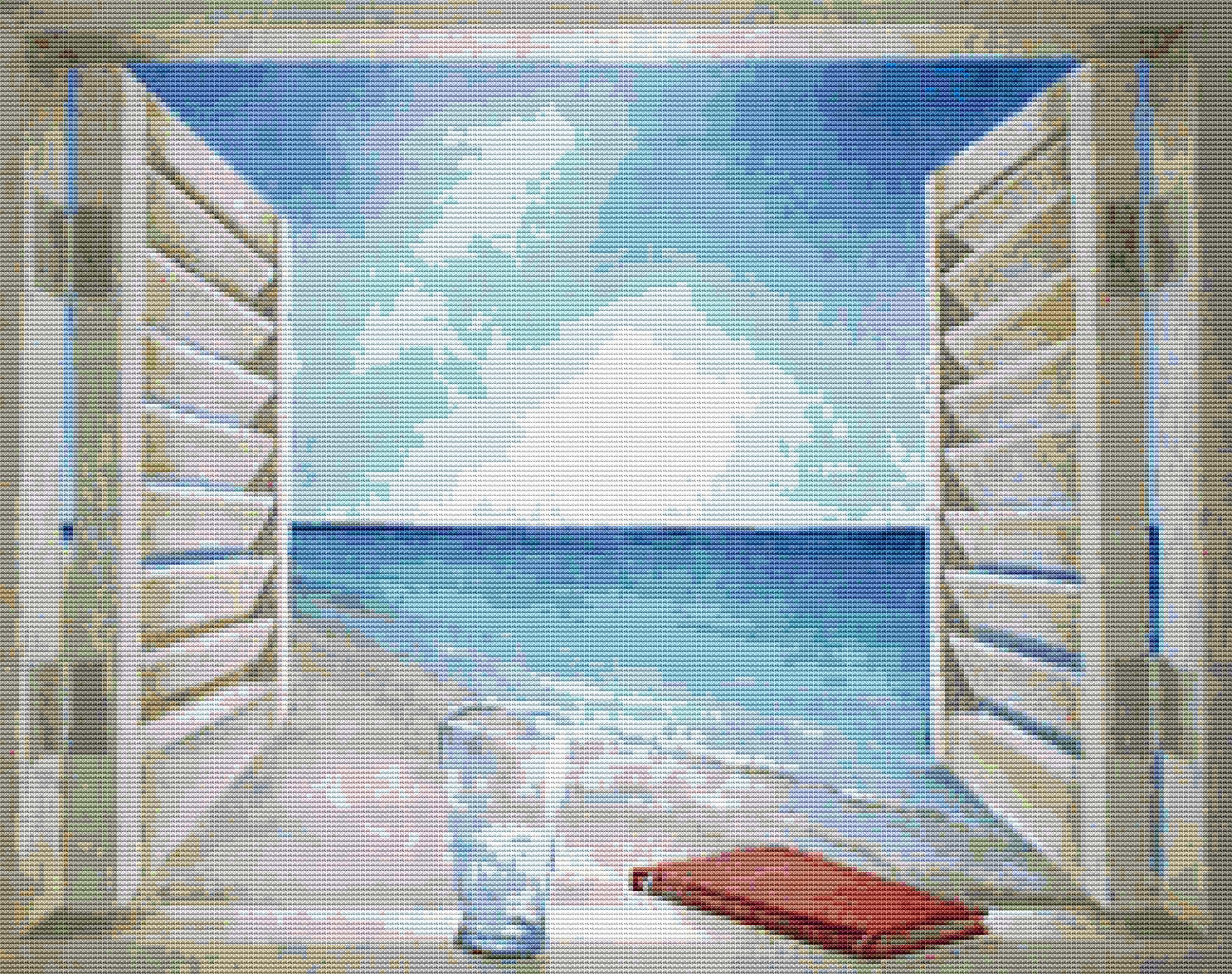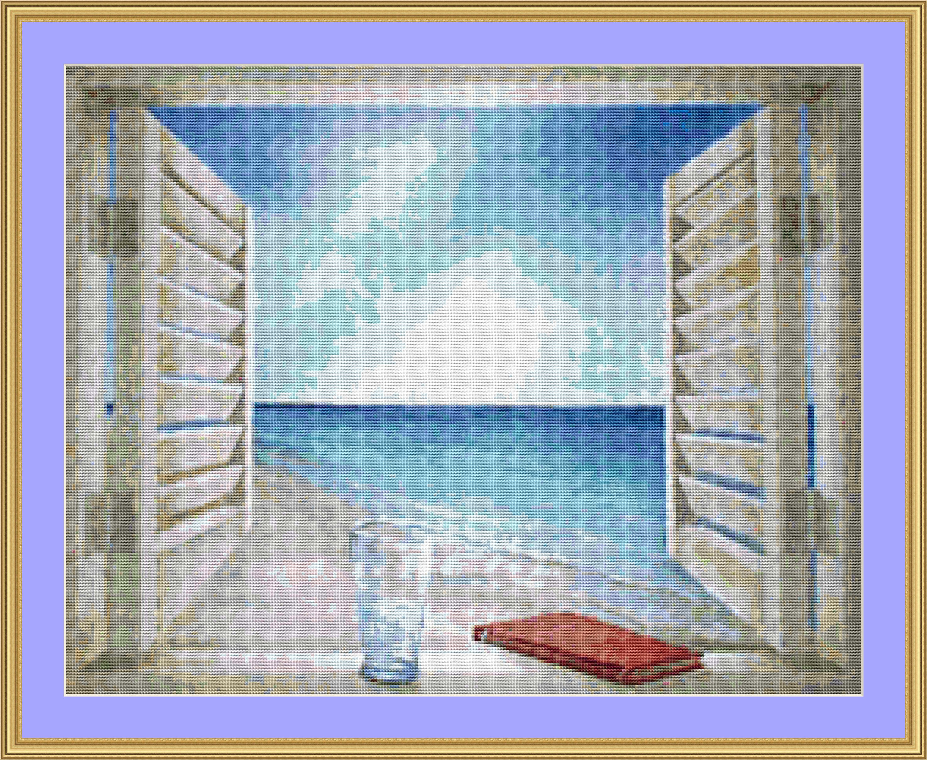 This cross stitch pattern depicts a picture of the sea through a shuttered window.