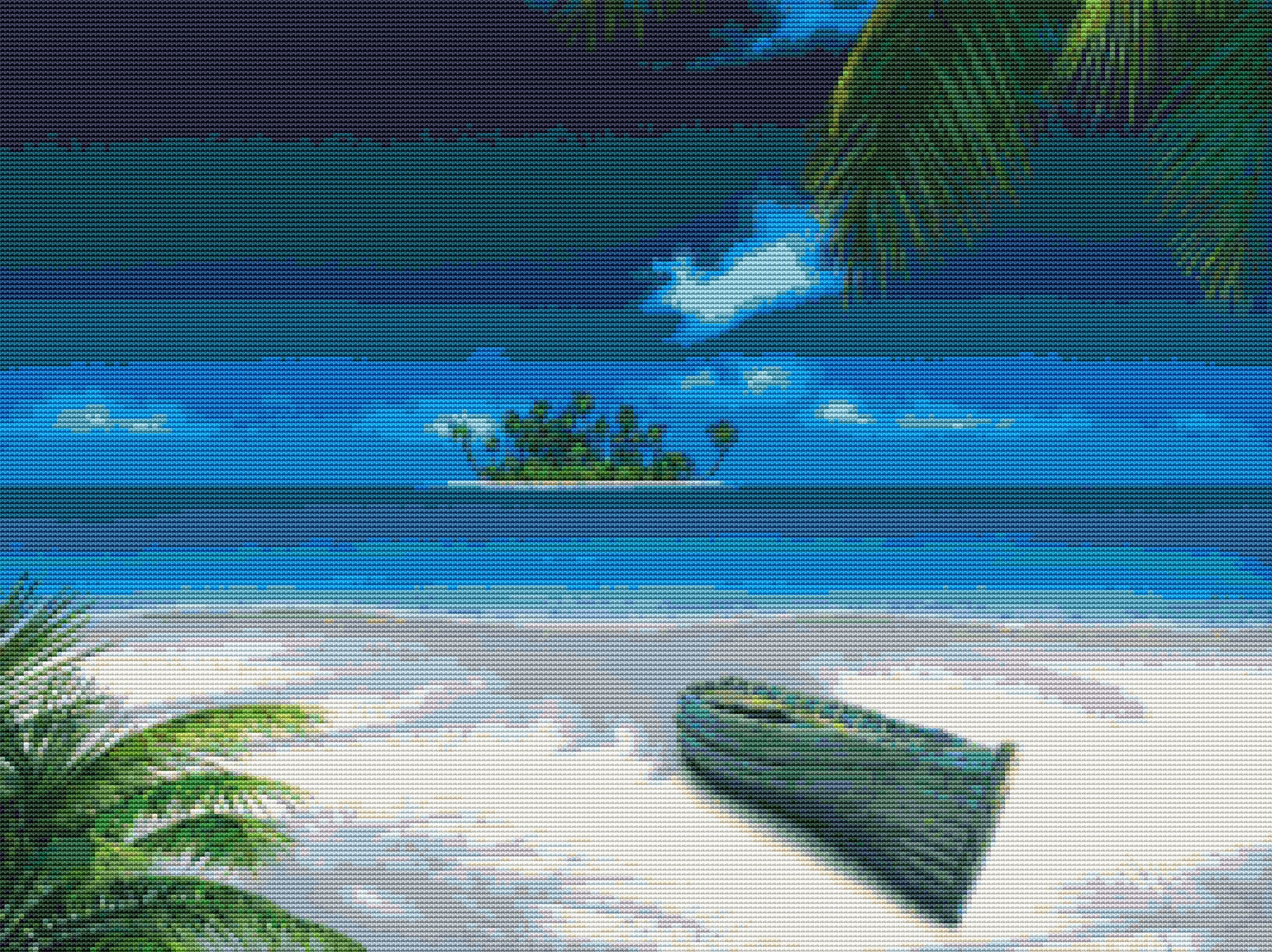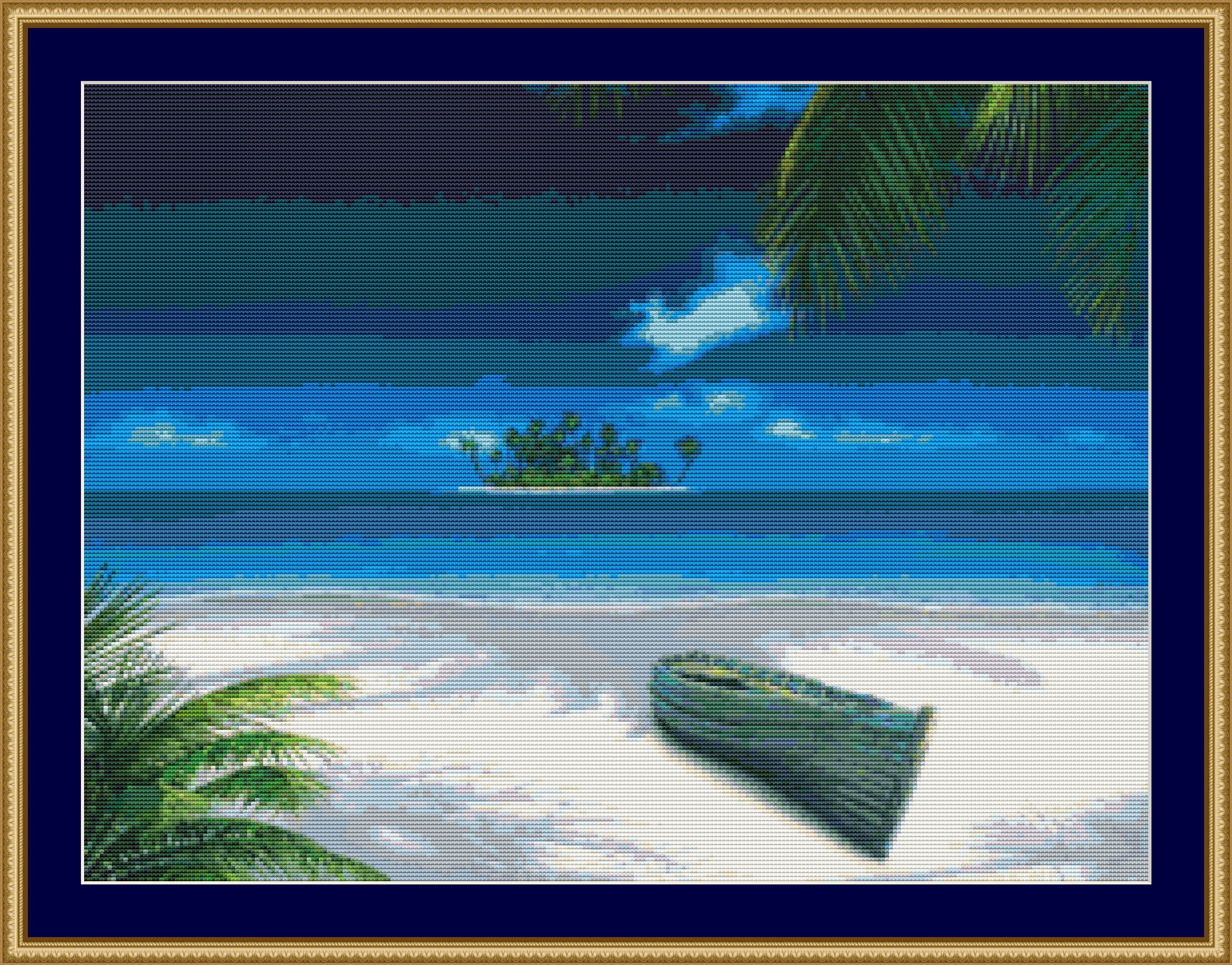 This cross stitch pattern depicts a picture of a boat pulled up on the sand.