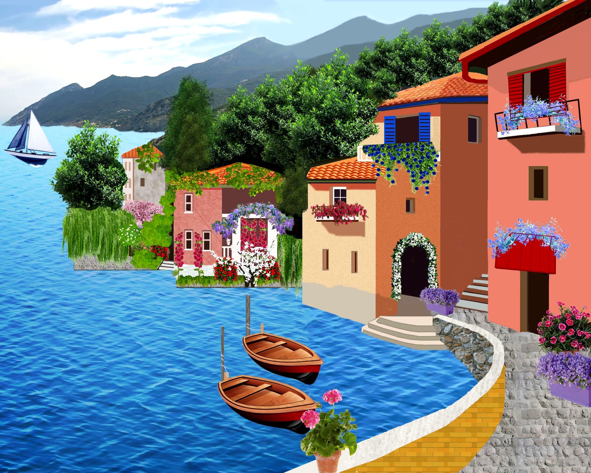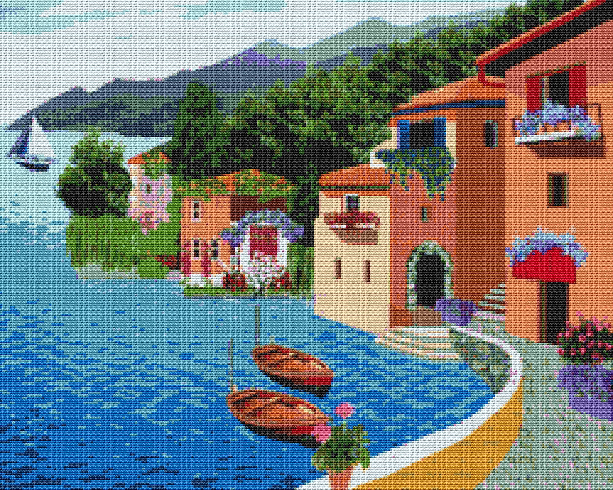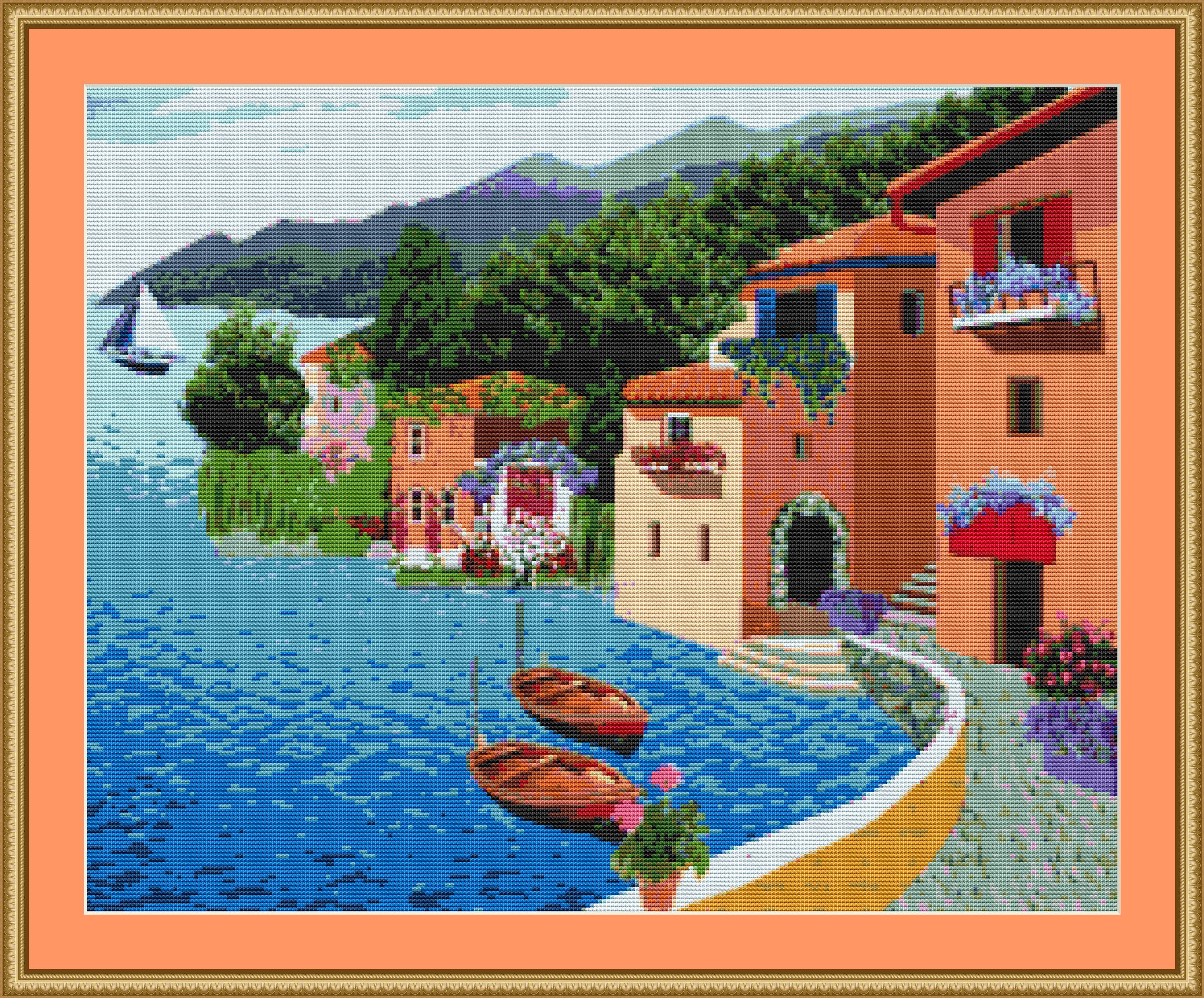 This cross stitch pattern of a serene view of beautiful village on the sea shore.
